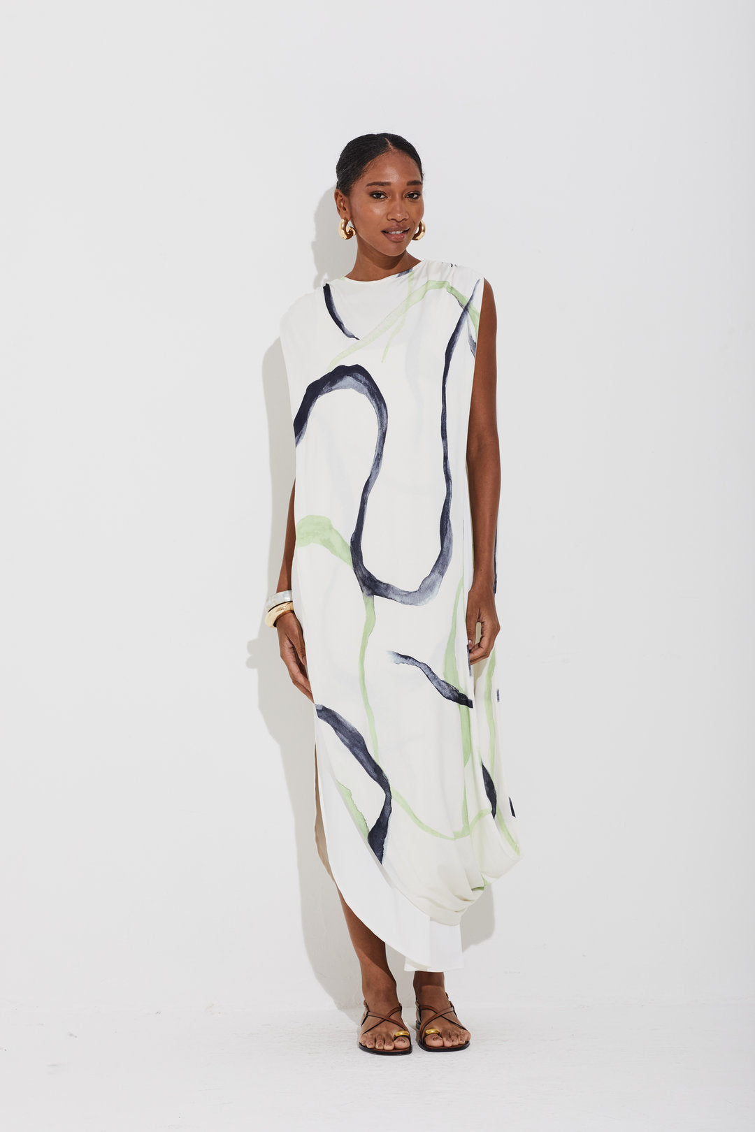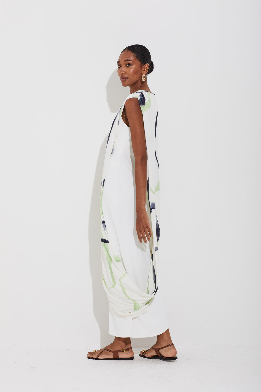 Conjunto composto por vestido justo em malha jersey opaque, sem transparência, com alças largas e barra com acabamento diagonal. Acompanhando o vestido, capa em malha jersey rayon com brilho sutil e estampa Caminhos, gola redonda e ombros franzidos que trazem um detalhe delicado e elegante. A capa é dupla face, estampada dos dois lados, oferecendo versatilidade e estilo único à peça.