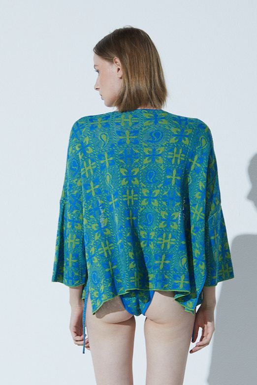 Desfrute do verão com estilo e sofisticação com o Kimono Em Tricot Jacquard Squares Azul! O tricot fluído é adornado com um jacquard colorido em cores complementares e detalhes sofisticados. A manga 3/4 e a ampla abertura tornam-na única para usar como uma terceira peça ou saída de praia. Aposte!