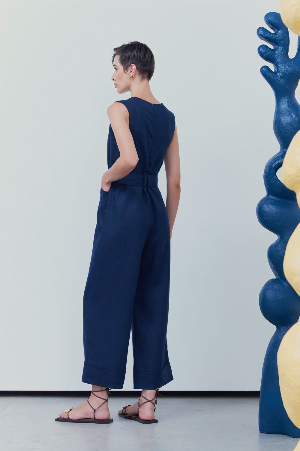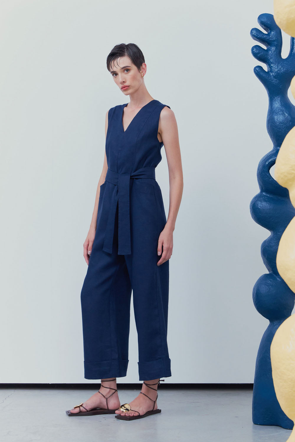 O Macacão em Tecido em linho apresenta faixa para amarração, decote em V e barra italiana que traz mais sofisticação para a peça.