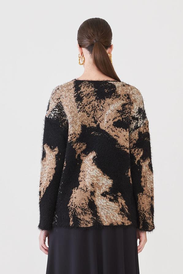 Confeccionado com a tecnologia jacquard em tricot felpudo, este maxipull oferece um toque macio e quentinho, além de um design abstrato moderno. Ideal para dias frios, pode ser usado em diversas ocasiões.