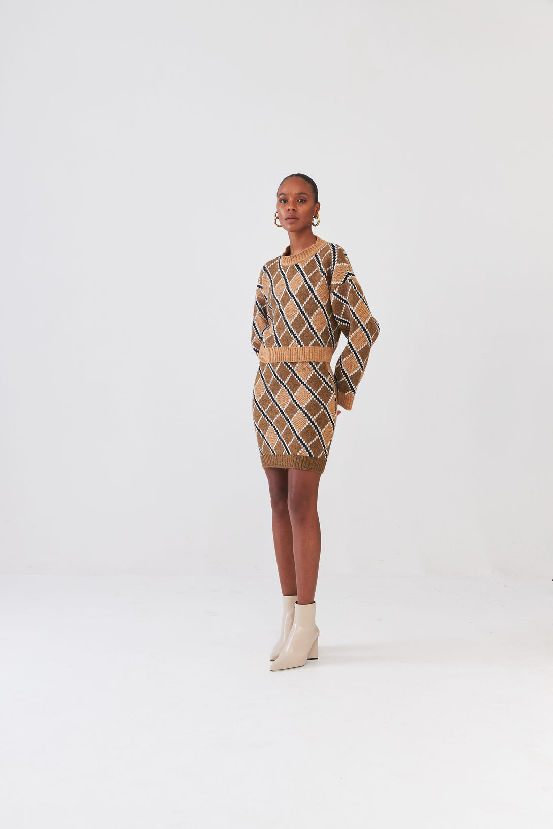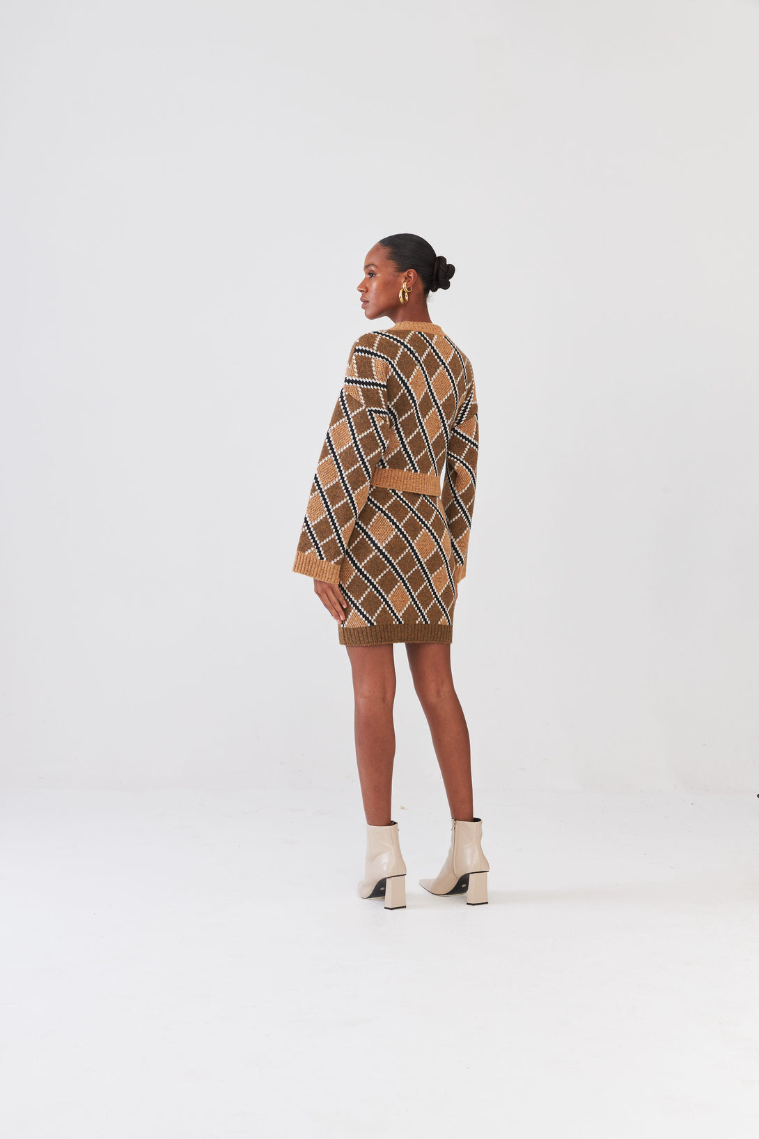Mini Saia Em Tricot Jacquard Losango Caramelo