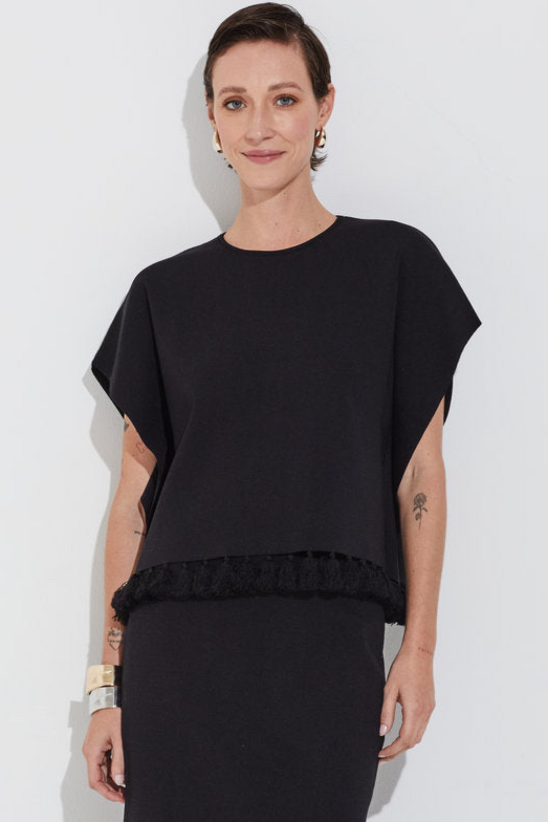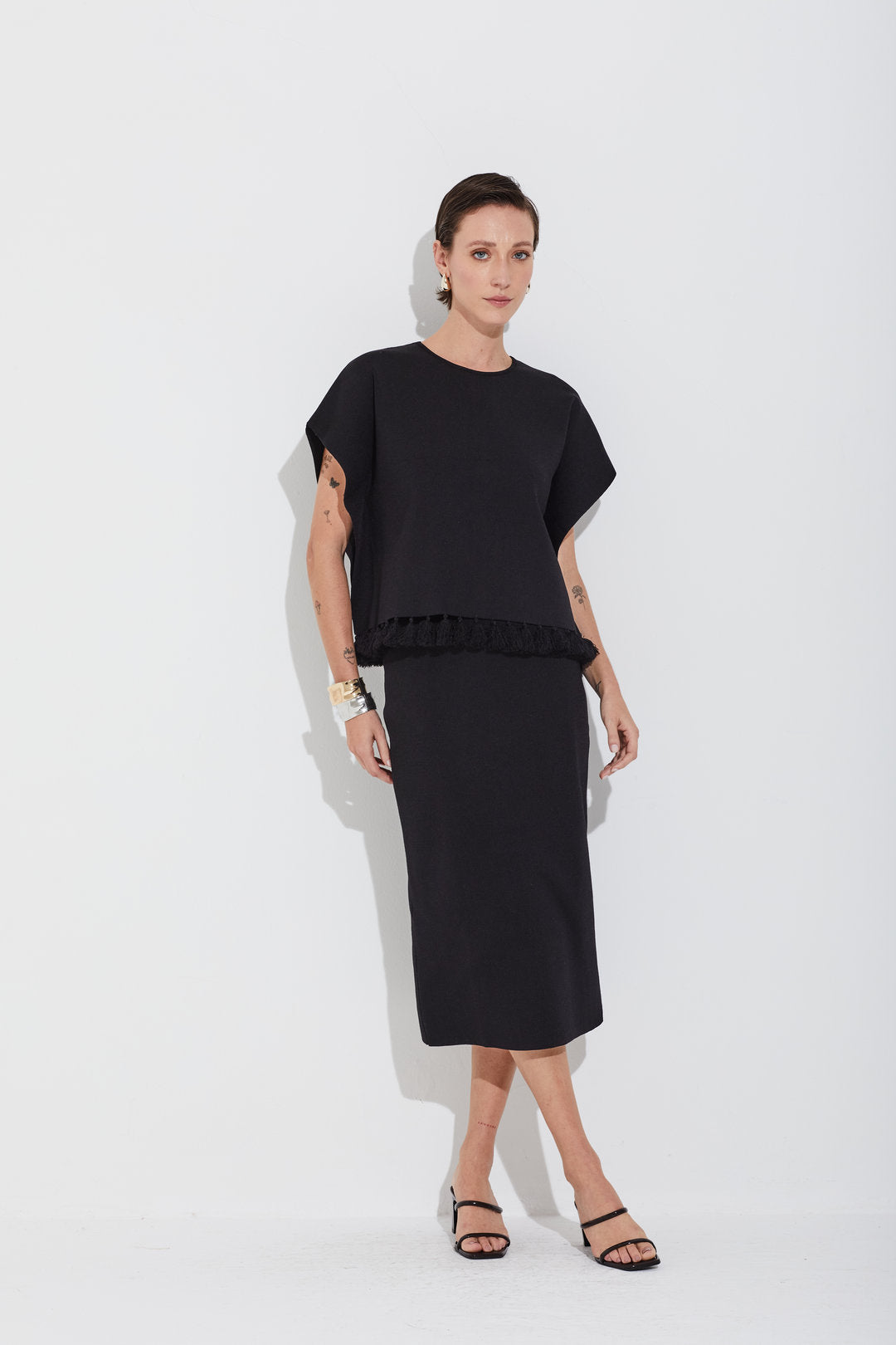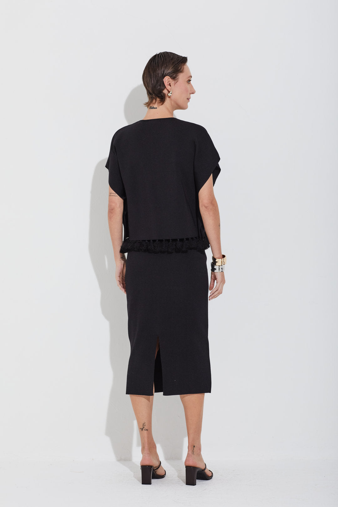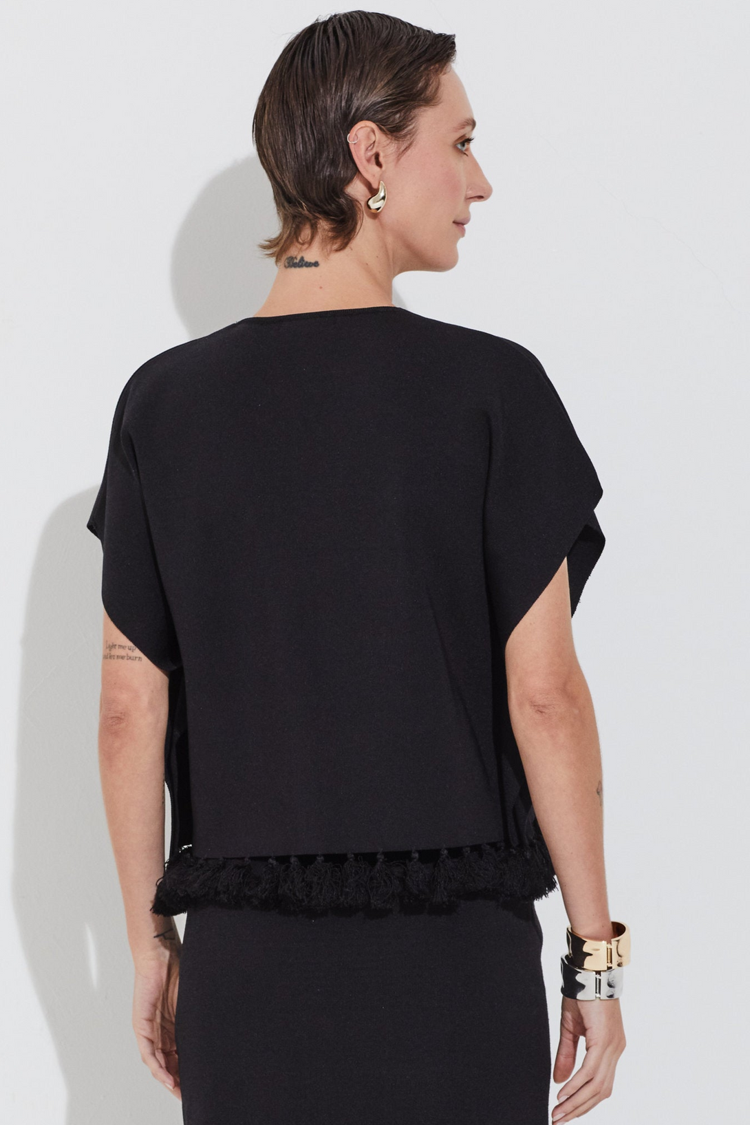 Blusa sem mangas em tricot encorpado, com modelagem ampla, ombros deslocados e gola redonda. O destaque fica para o acabamento na barra com barbicachos delicados, que criam franjas elegantes, trazendo movimento e um toque artesanal à peça.