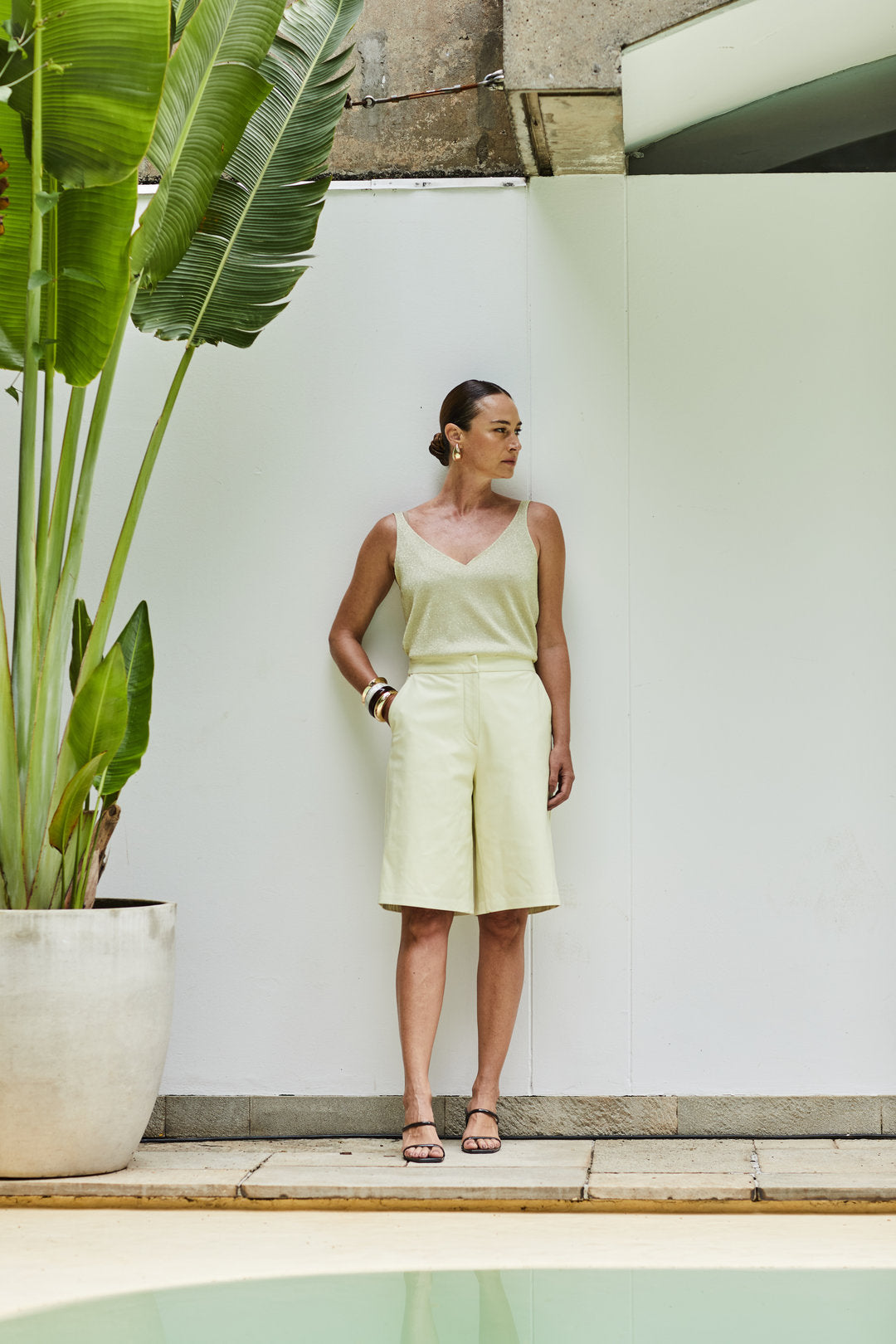 Regata em tricot confeccionada em fio acetinado com lurex, com técnica especial que aplica o brilho apenas na parte externa, mantendo o conforto no contato com a pele. Com decote V frente e costas, alças finas, modelagem confortável e comprimento regular, é uma peça versátil da nossa Linha Essencial — perfeita para composições que pedem conforto e um toque de brilho elegante.