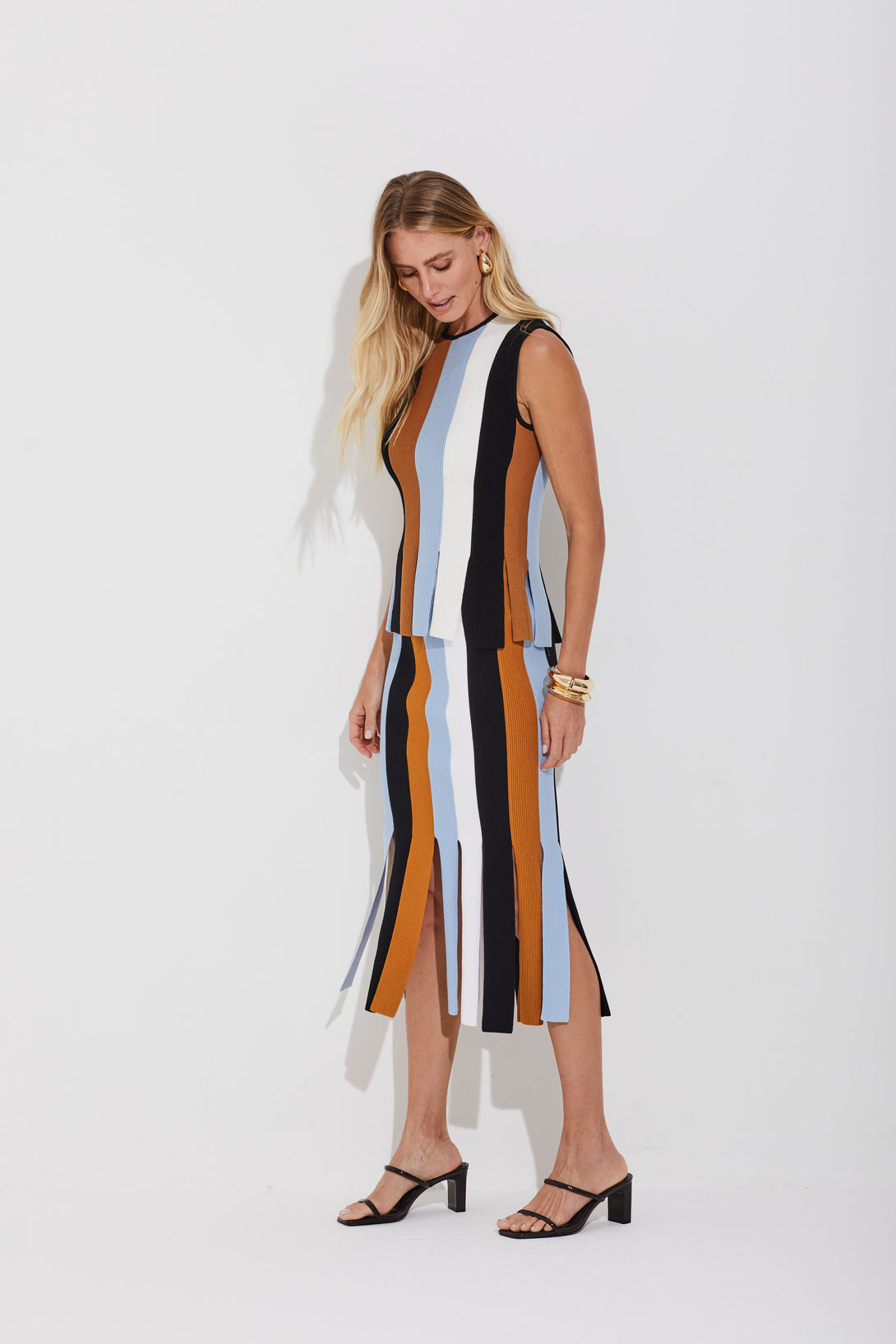 Regata em tricot com listras verticais multicoloridas e gola careca. Modelo com alto percentual de elastano para melhor ajuste. Barra com acabamento em recortes que formam franjas largas, dando um toque moderno e despojado à peça.