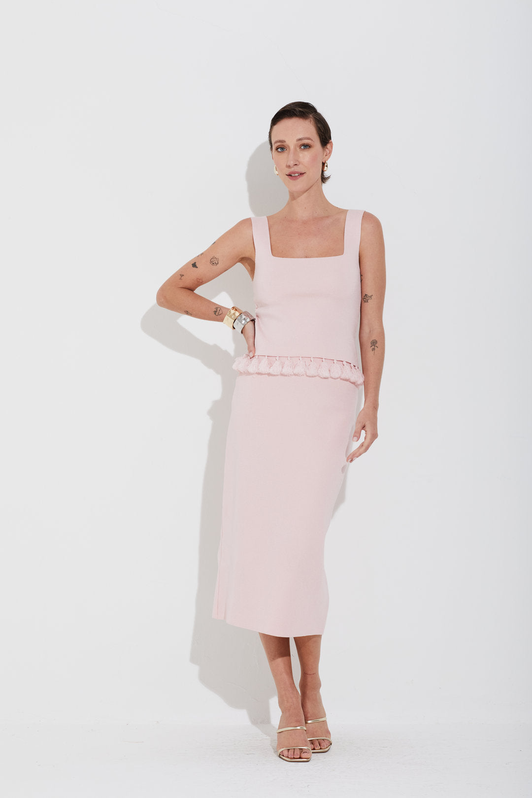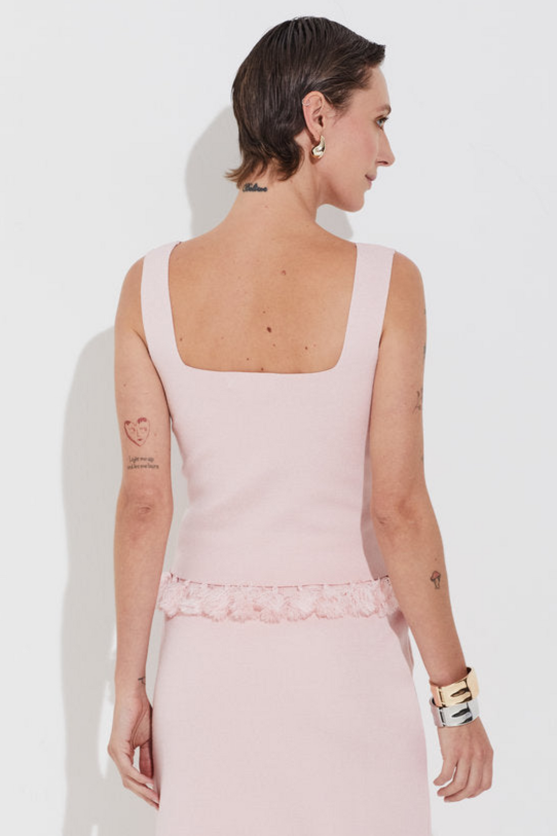Regata em tricot encorpado com modelagem ajustada e comprimento na altura do cós. Possui alças largas e decote quadrado na frente e nas costas. O destaque fica por conta dos acabamentos manuais com barbicachos delicados que finalizam em franjas na barra, trazendo charme e movimento à peça.