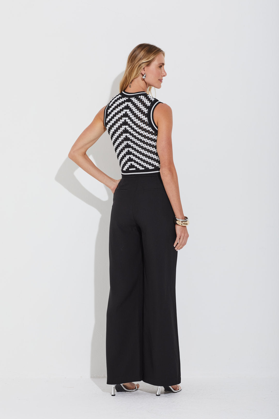 Com gola redonda e modelagem ajustada, a peça valoriza a silhueta com conforto e leveza. As listras diagonais se encontram no centro, criando formas exclusivas que destacam o visual. O ponto em tela remete ao trabalho artesanal do crochê, conferindo textura e frescor. De comprimento na altura do cós, pode ser usada sozinha ou como sobreposição, compondo looks versáteis e atemporal .