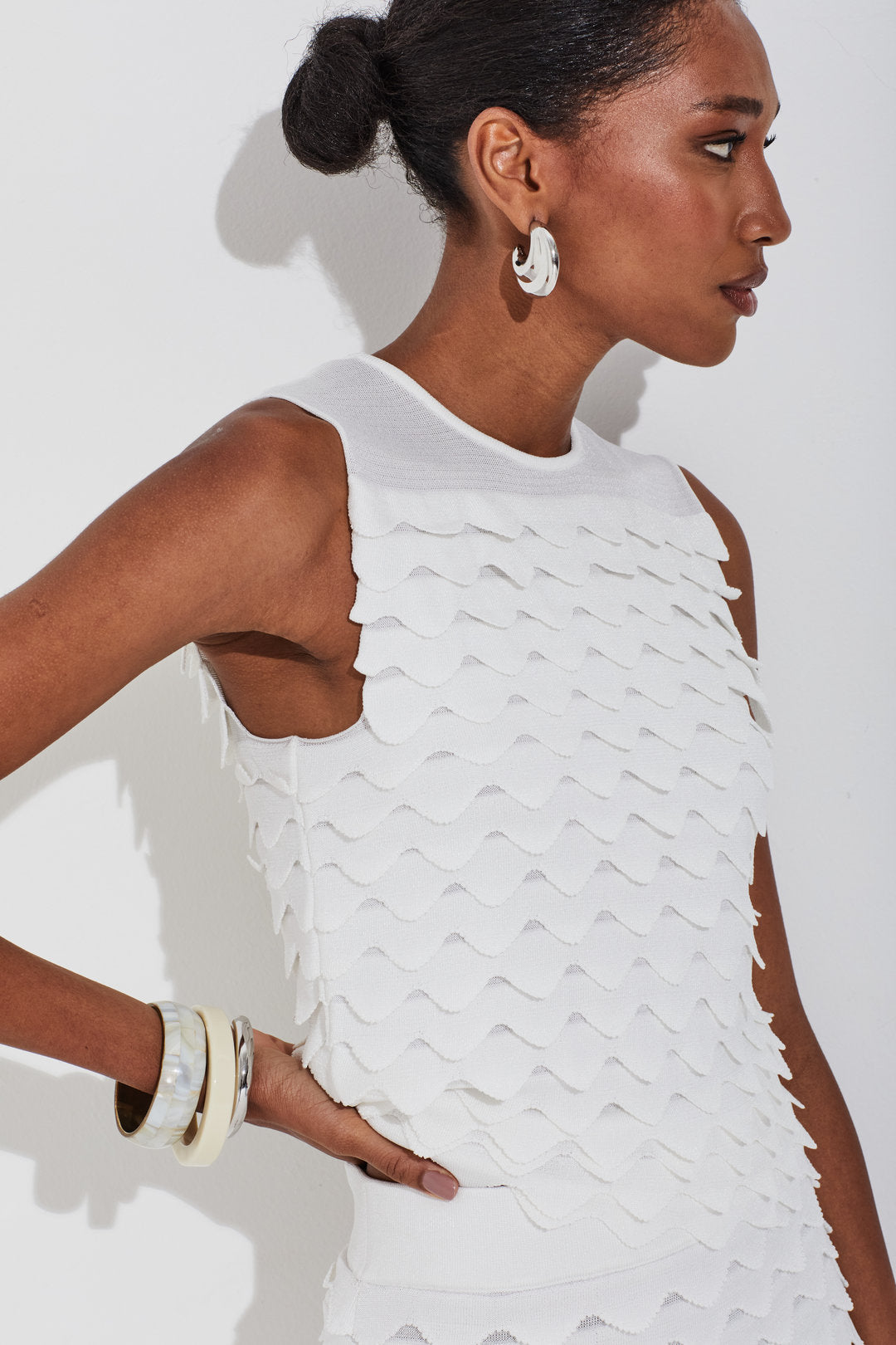 Regata em tricot com acabamento em ondas sobrepostas que criam camadas texturizadas. Possui alças largas, gola redonda e comprimento e largura regulares, garantindo conforto e um caimento equilibrado. Uma peça moderna e versátil.