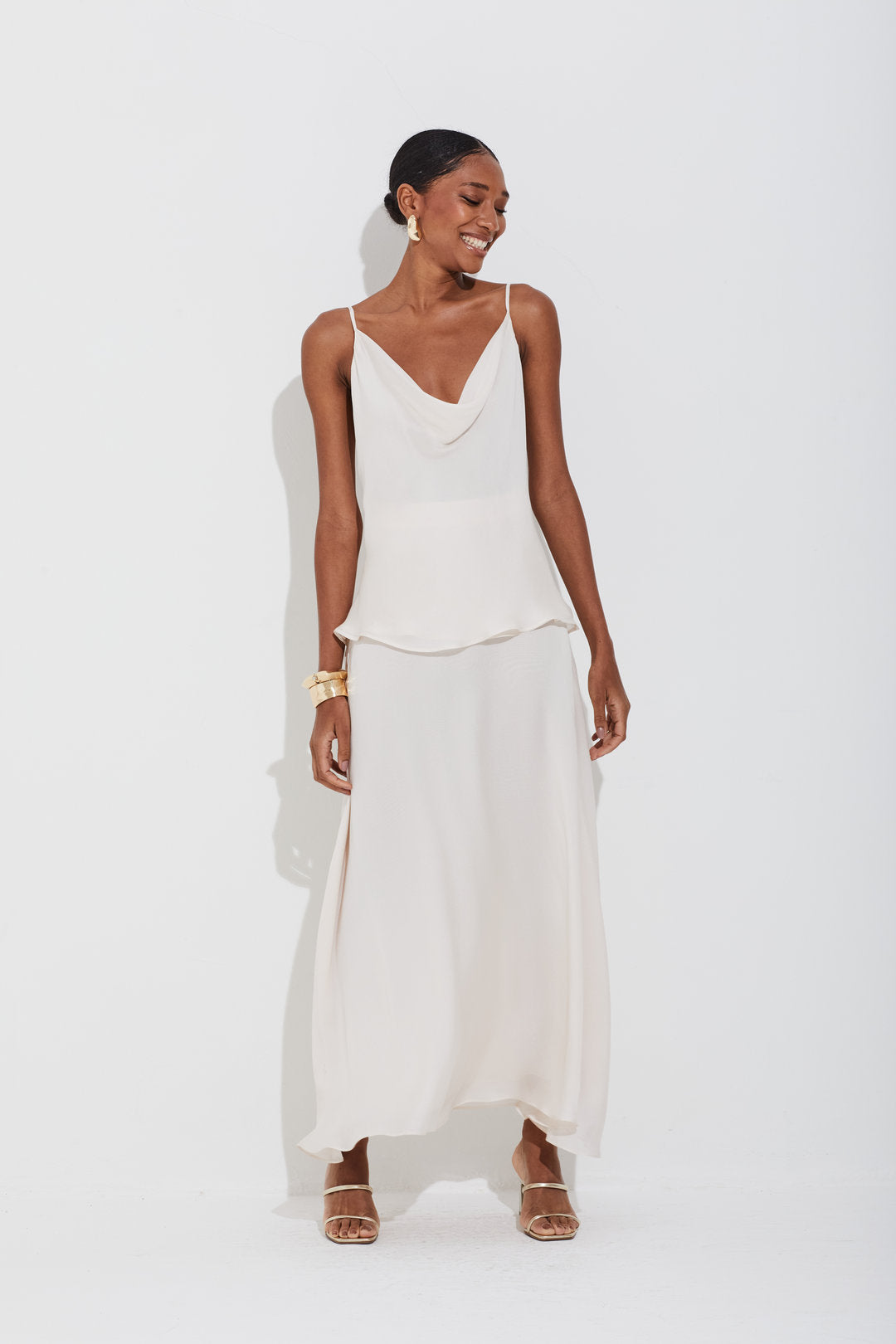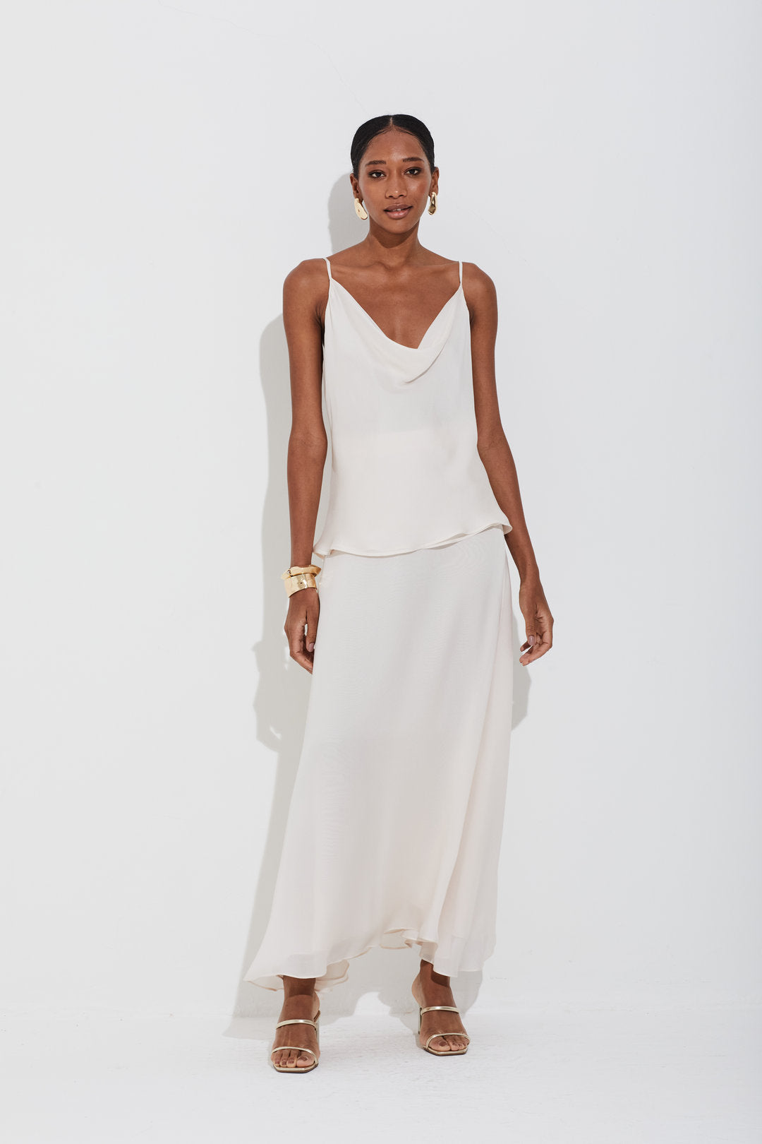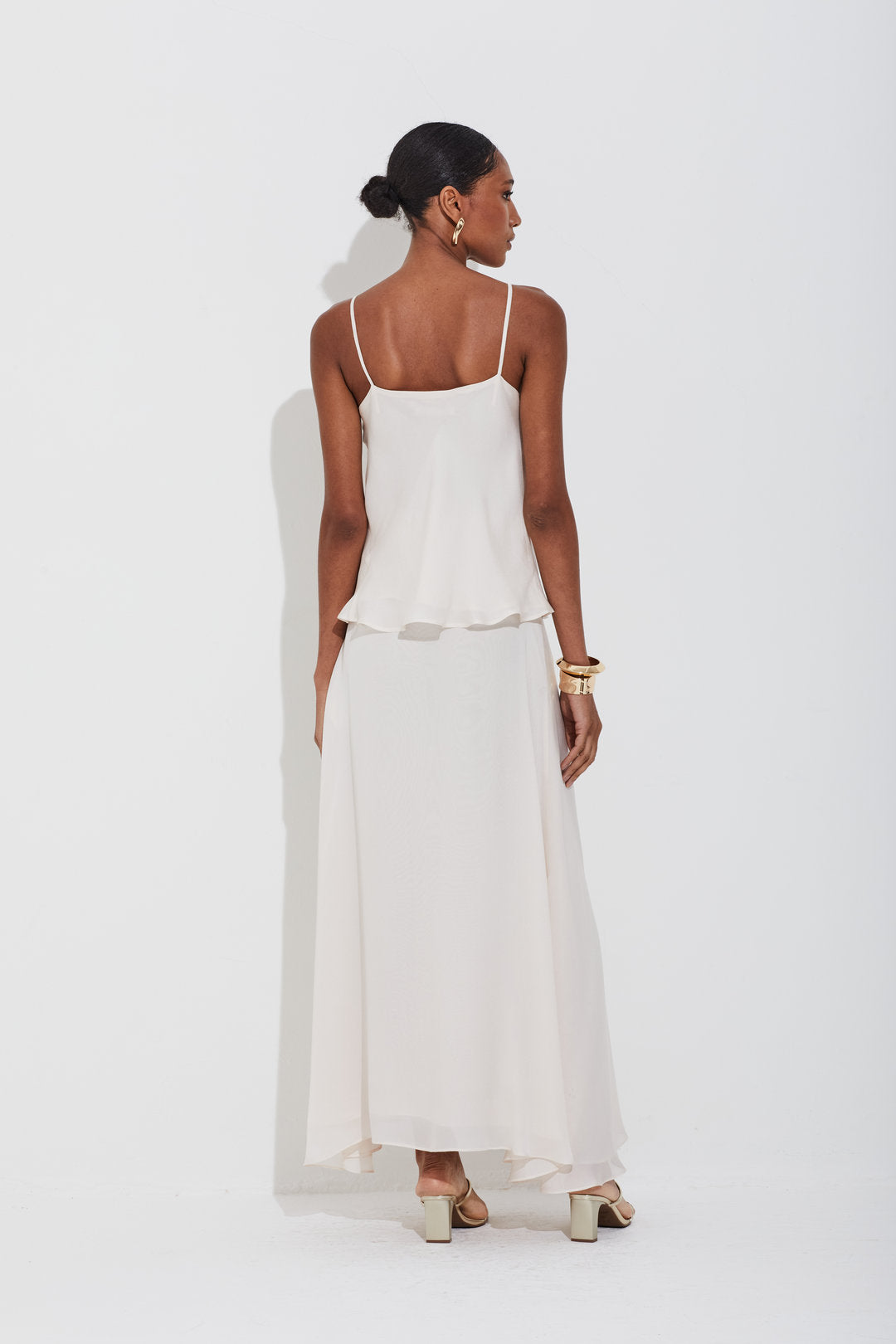 Saia Em Georgette Leve Com Franzidos Longa Marfim