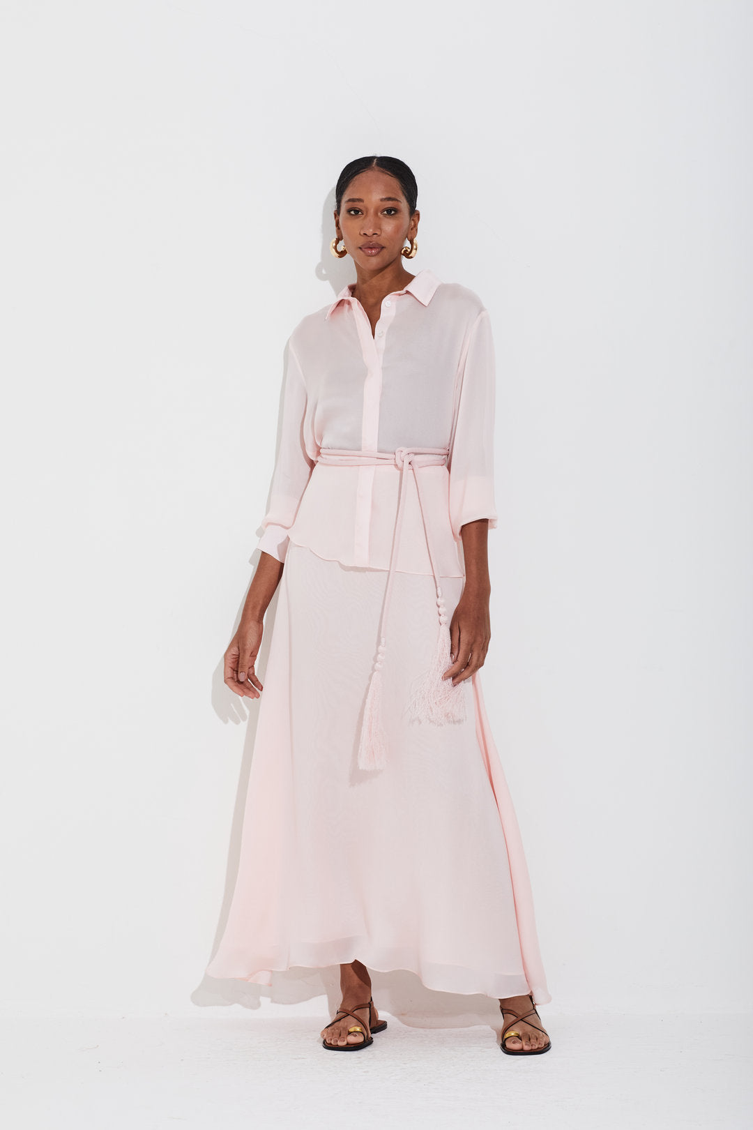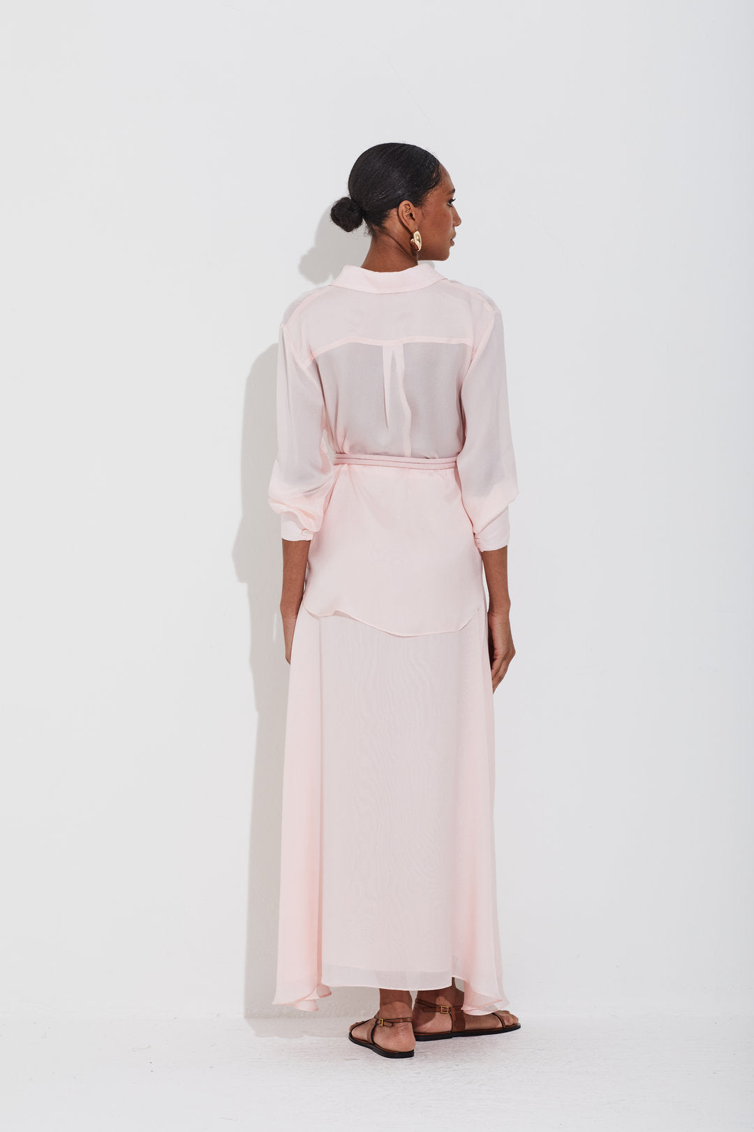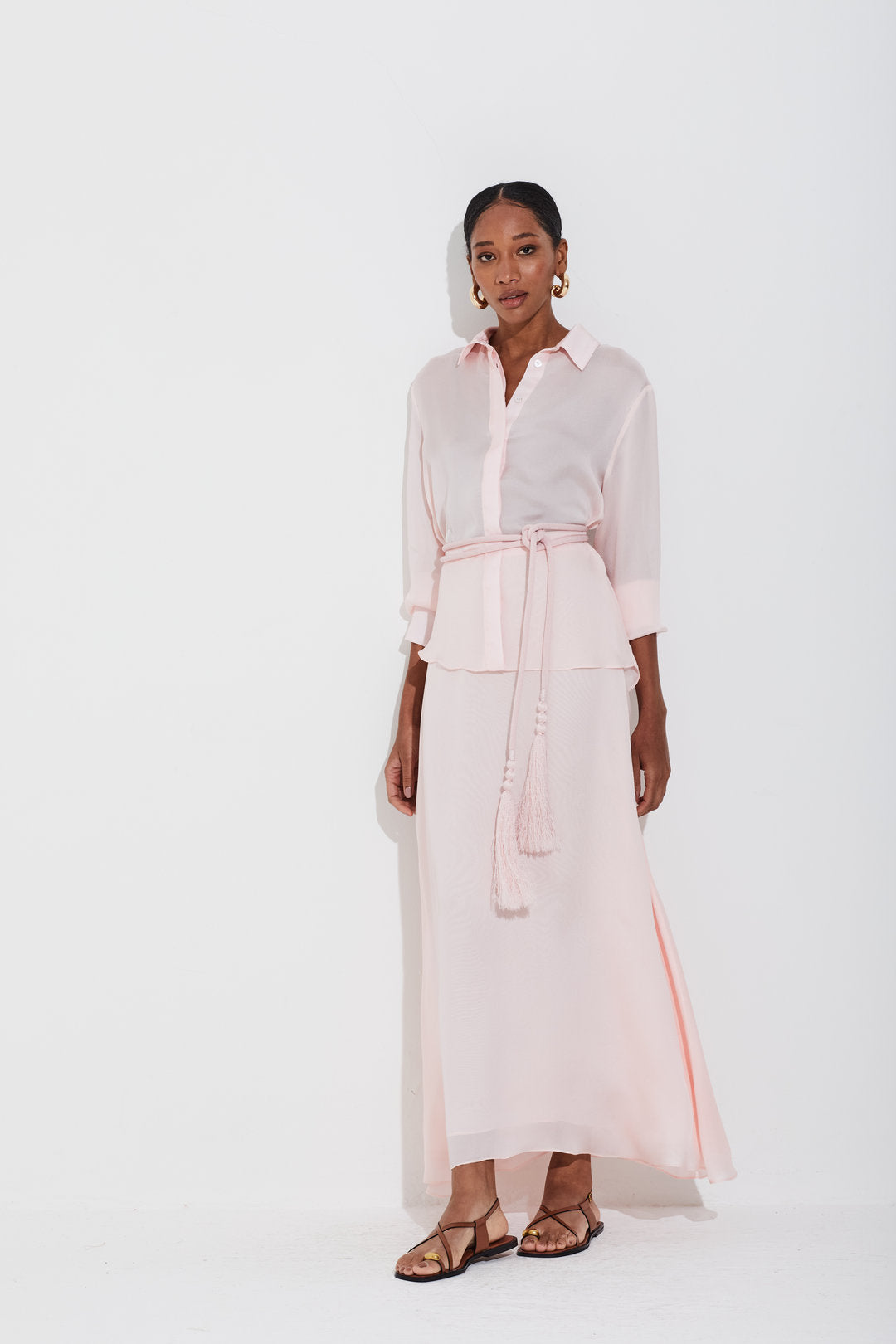 Saia Em Georgette Leve Com Franzidos Longa Quartzo Rosa