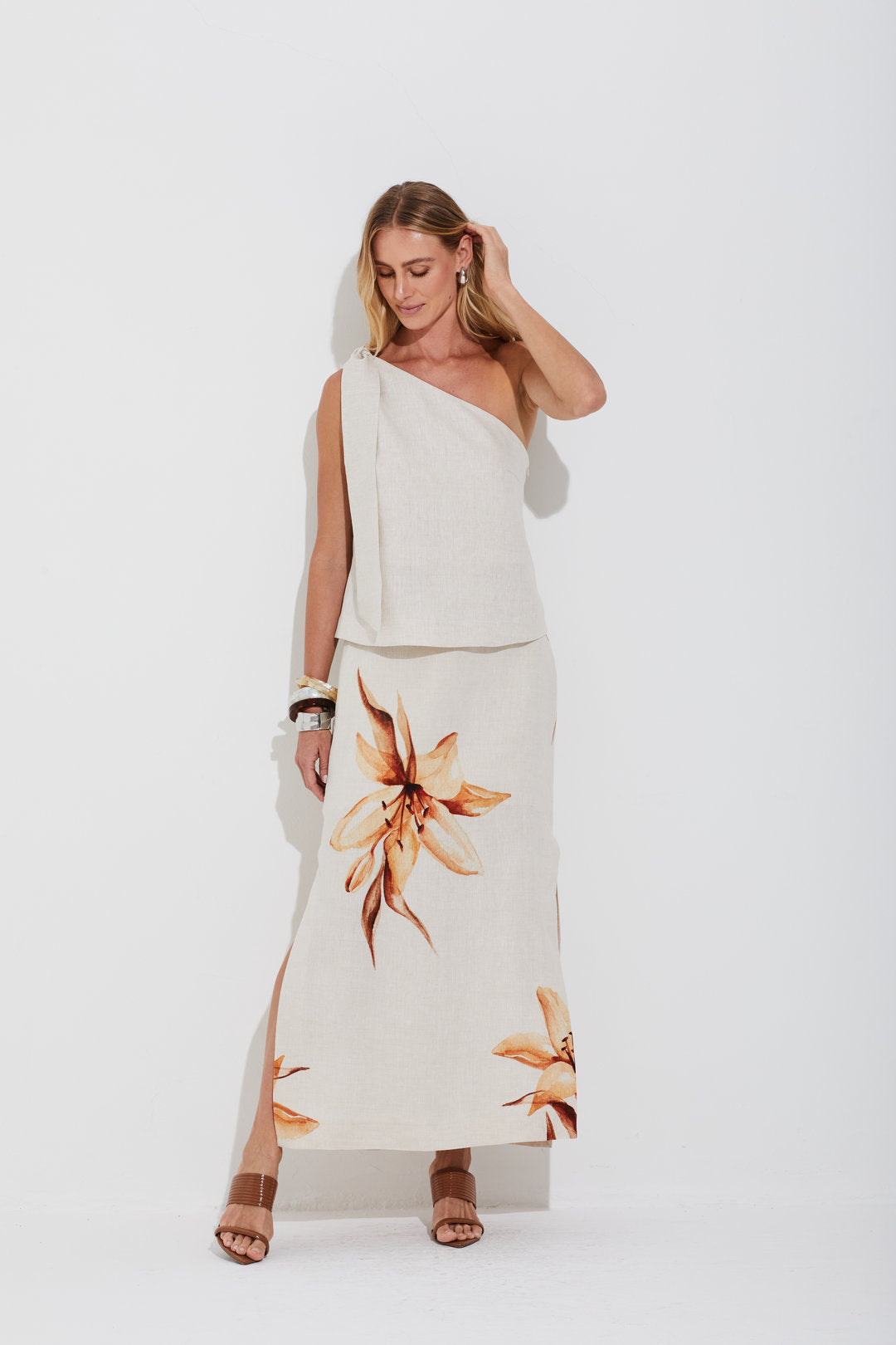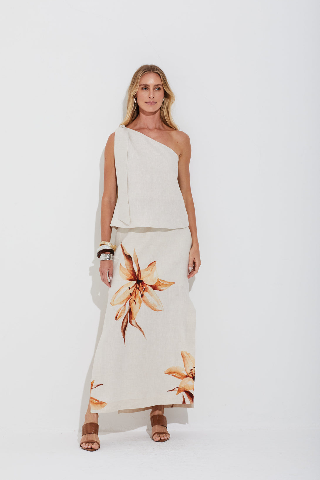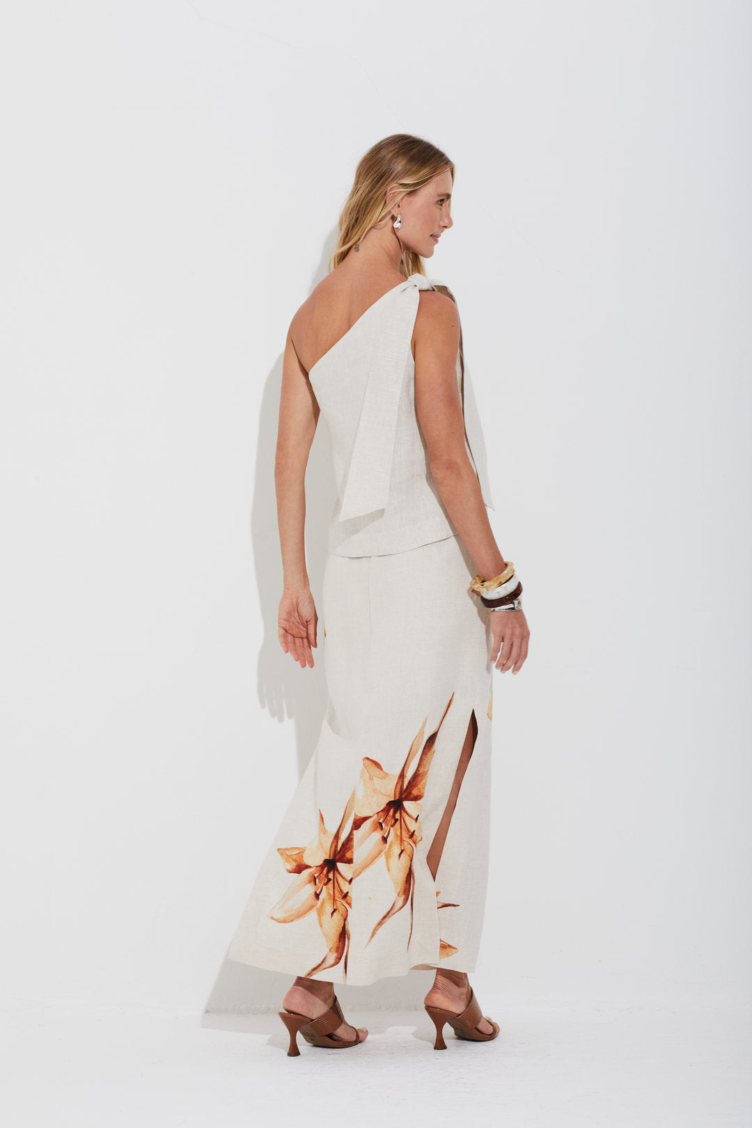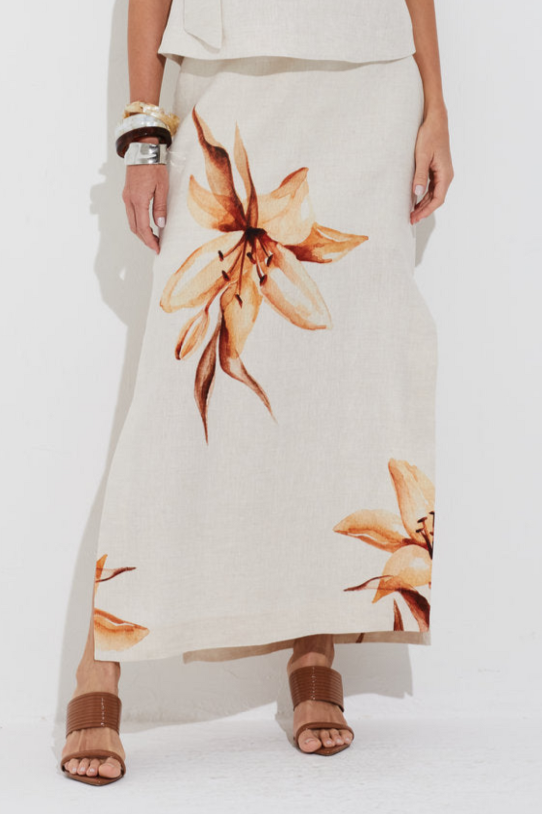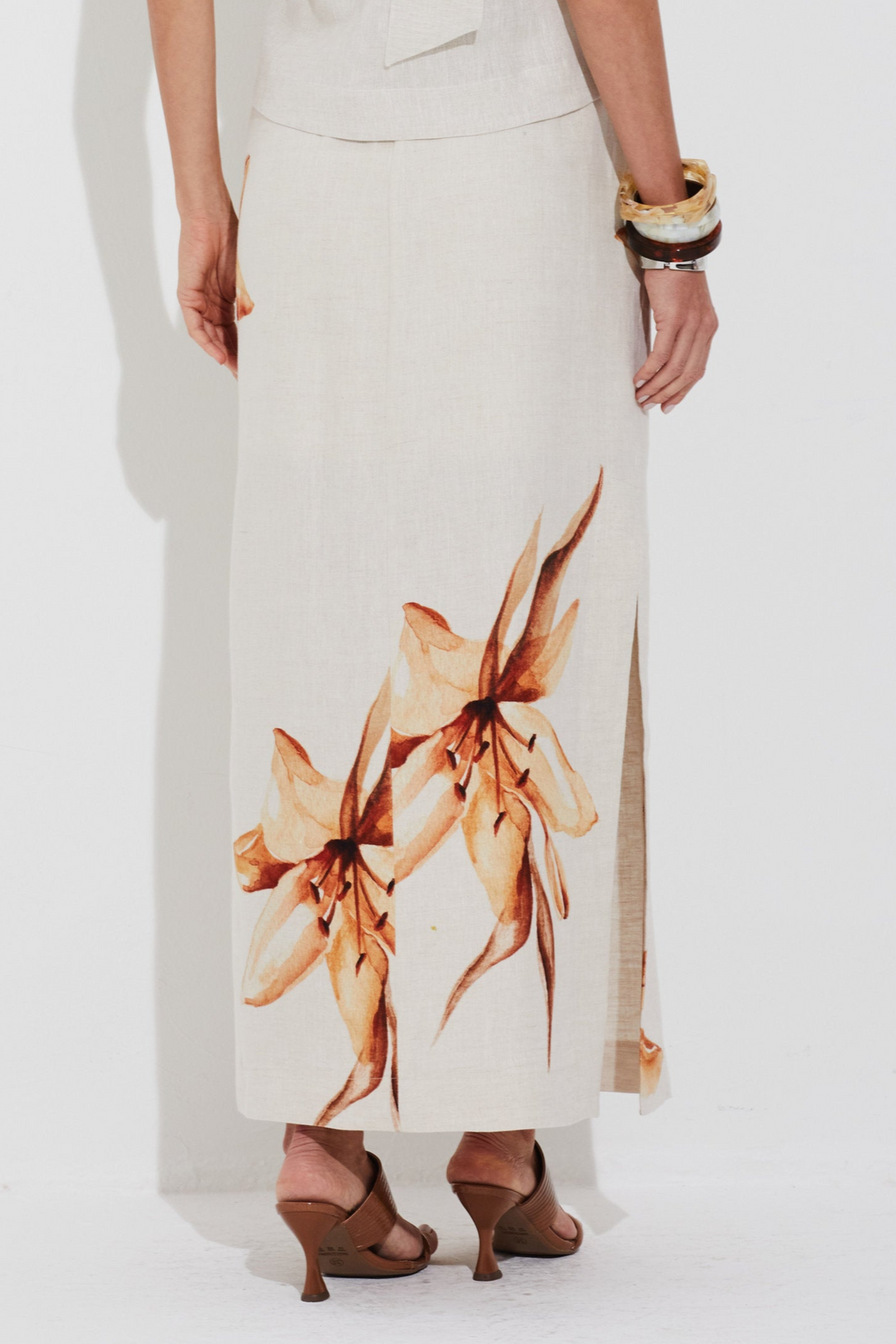 Saia Em Linho 100% Estampa Florescer Longa Estampado Linho Natural