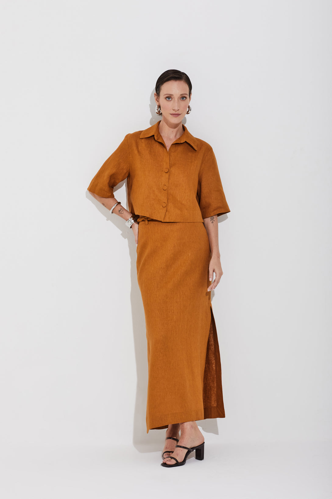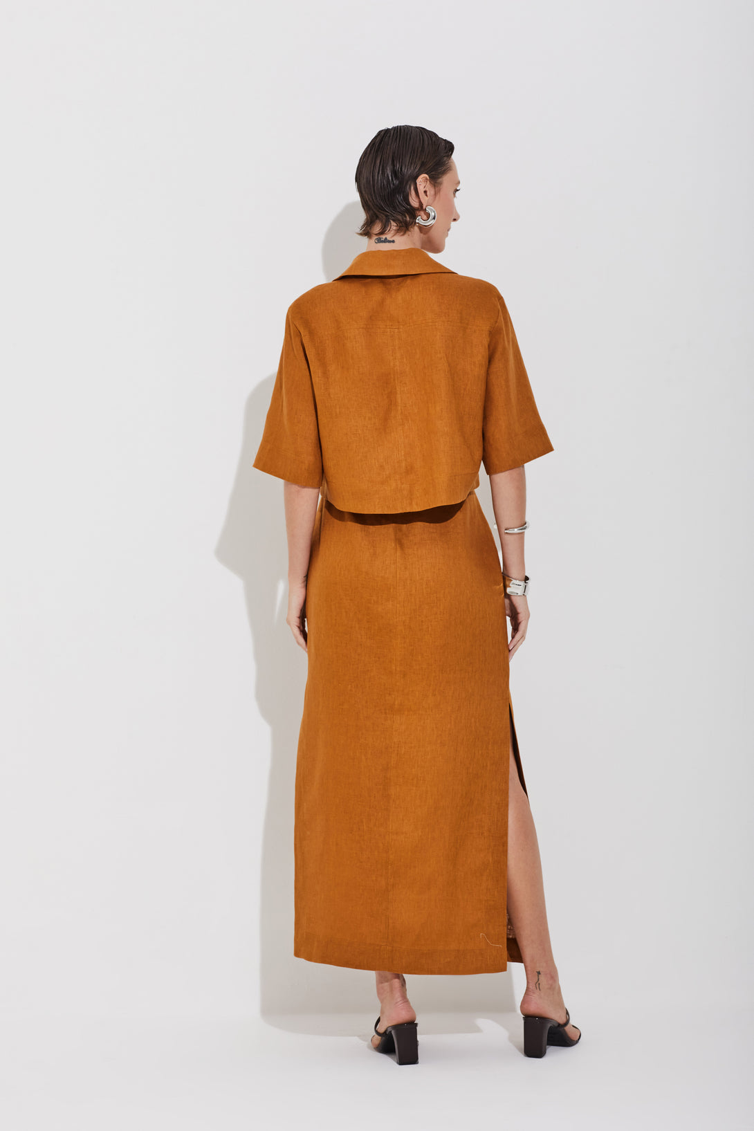 OUTRAS CORES:: Saia Lápis Linho Puro Ambar Terroso