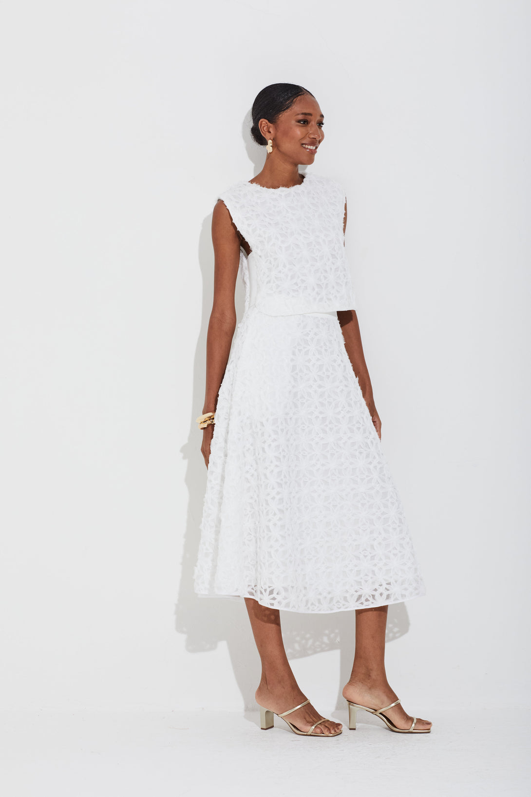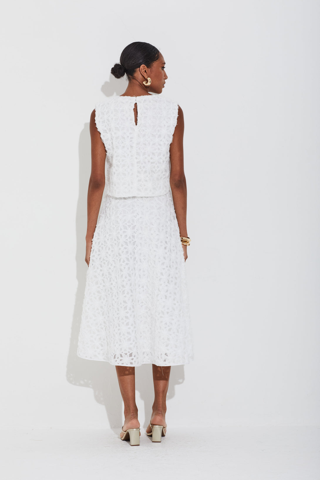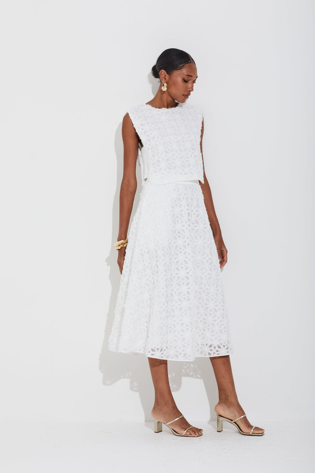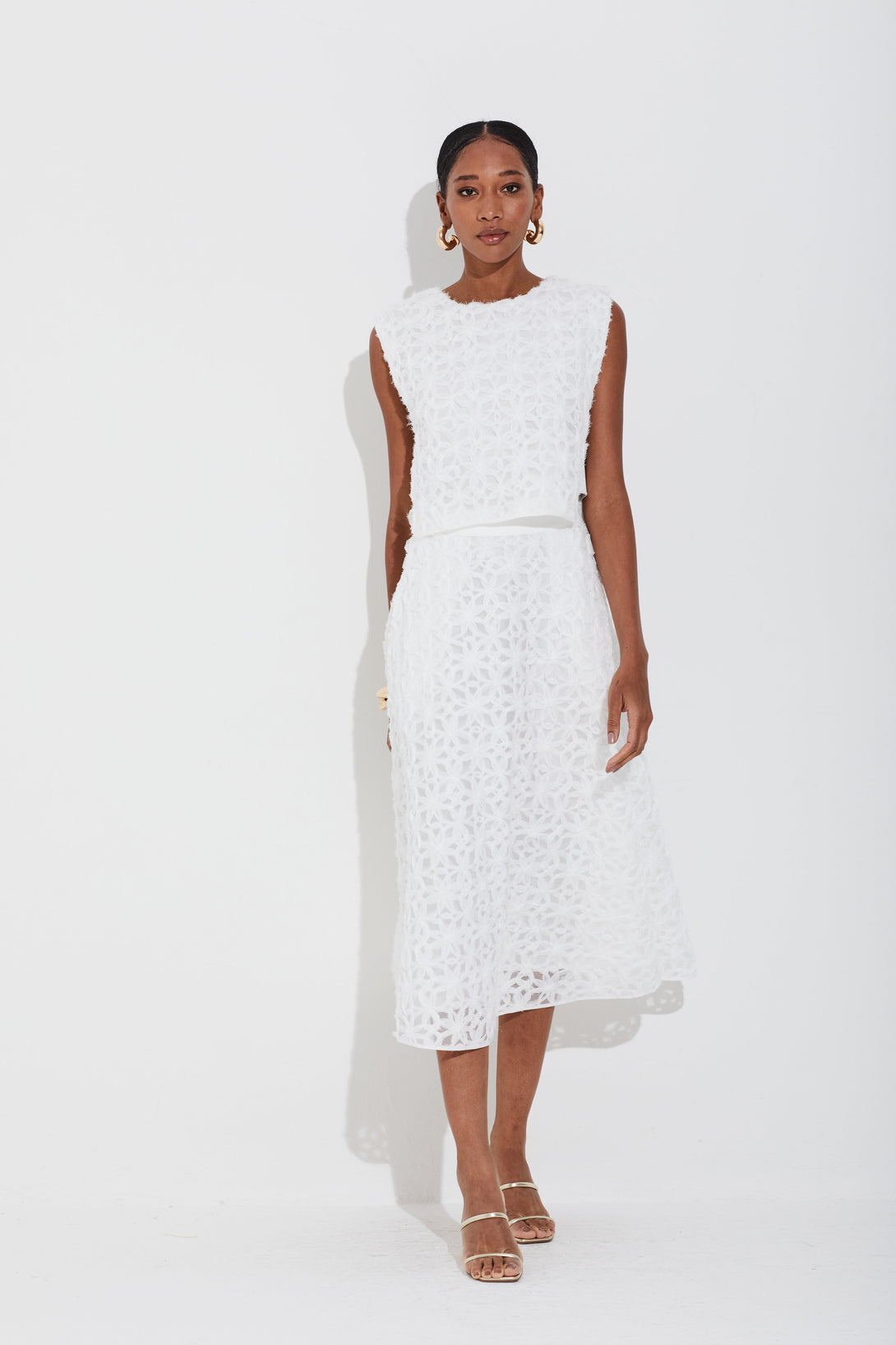 Saia midi em tule bordado 3D com modelagem evasê que proporciona movimento. Cós em tricot confortável e fechamento por zíper invisível lateral, garantindo praticidade. Conta ainda com bolsos laterais, unindo estilo e funcionalidade.
