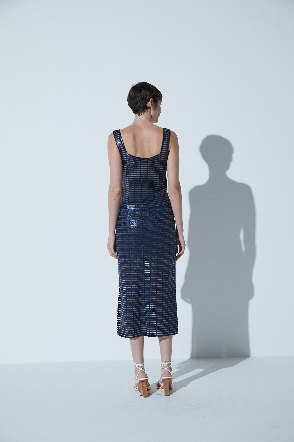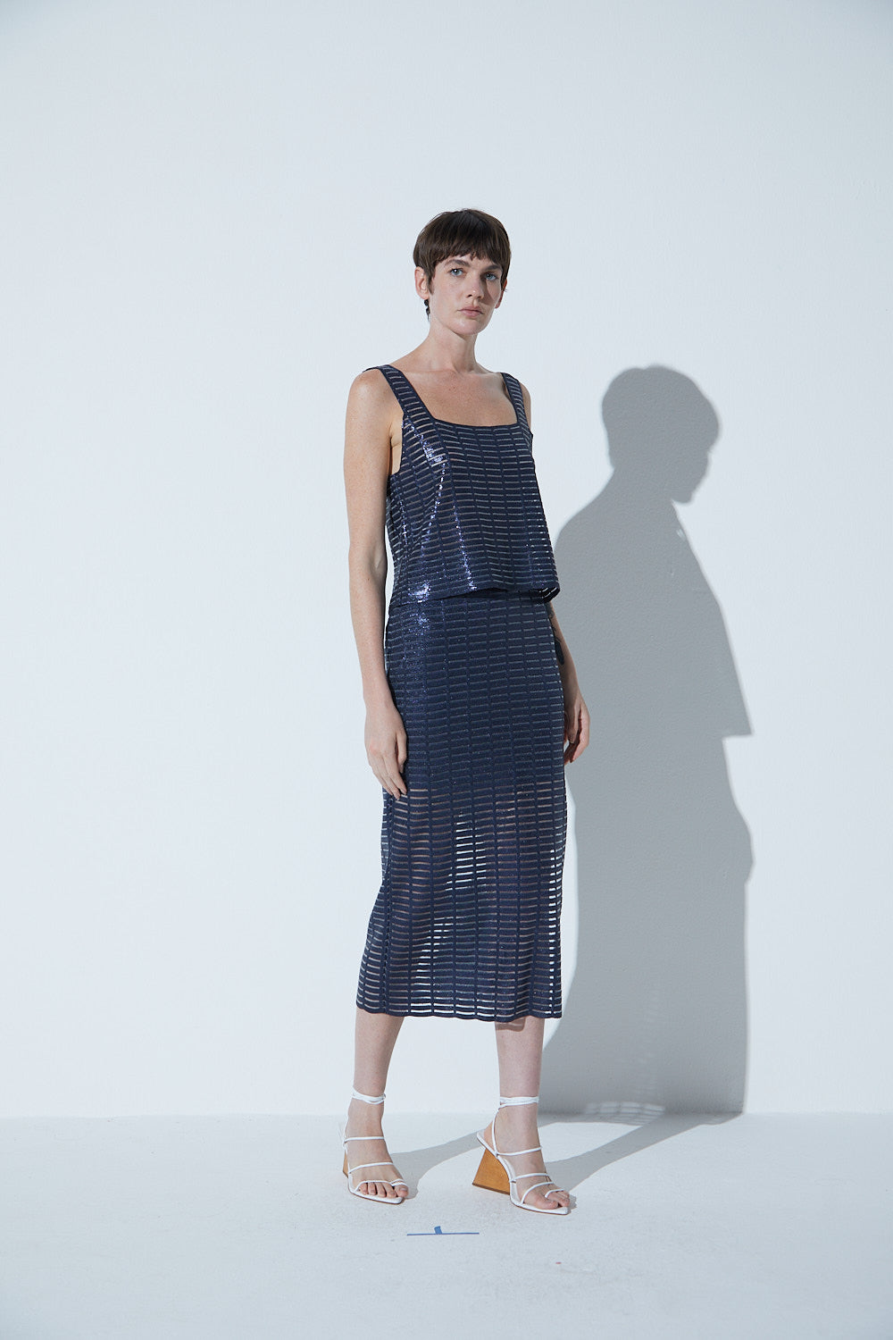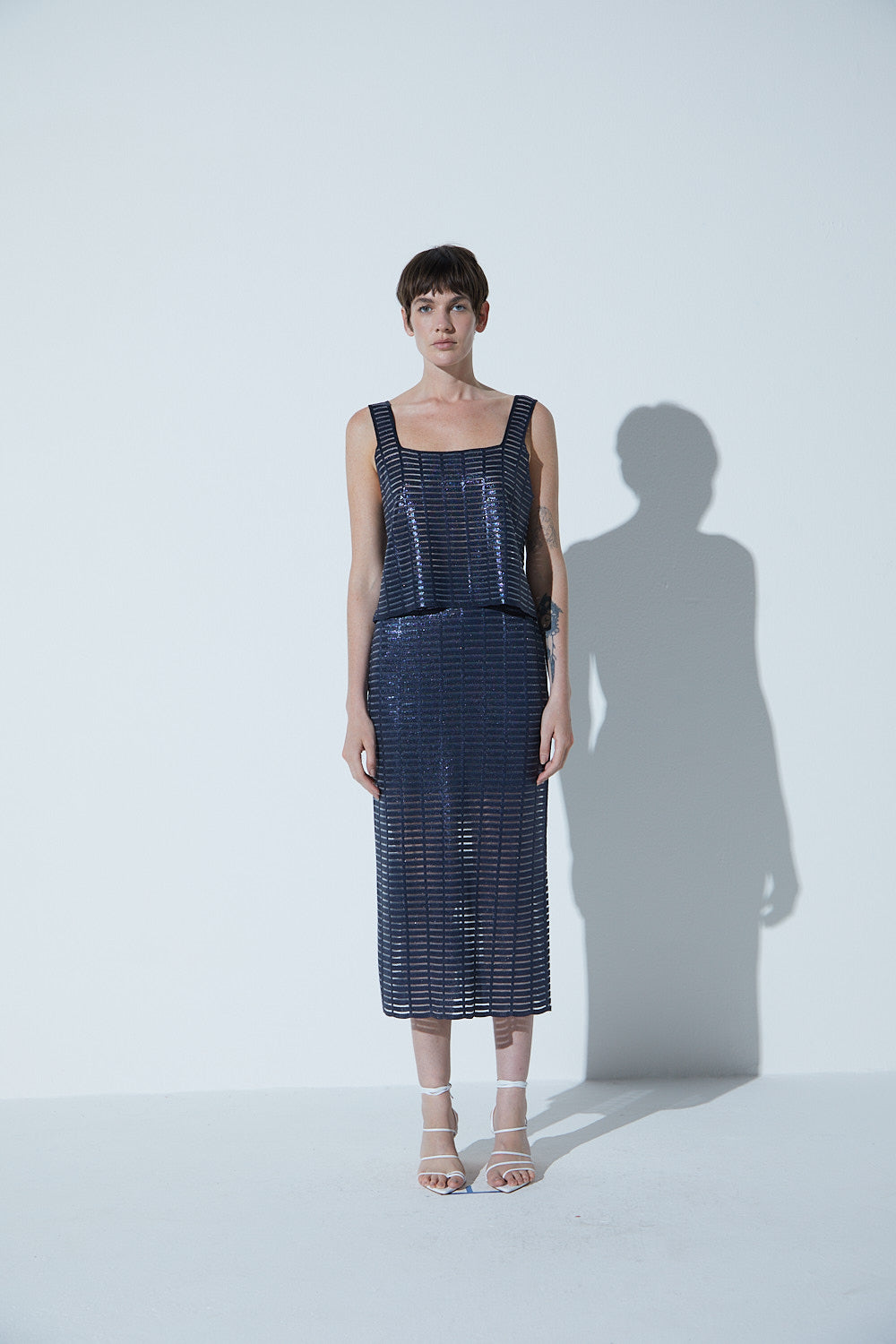 Saia Lápis Em Tricot Com Foil Azul Marinho