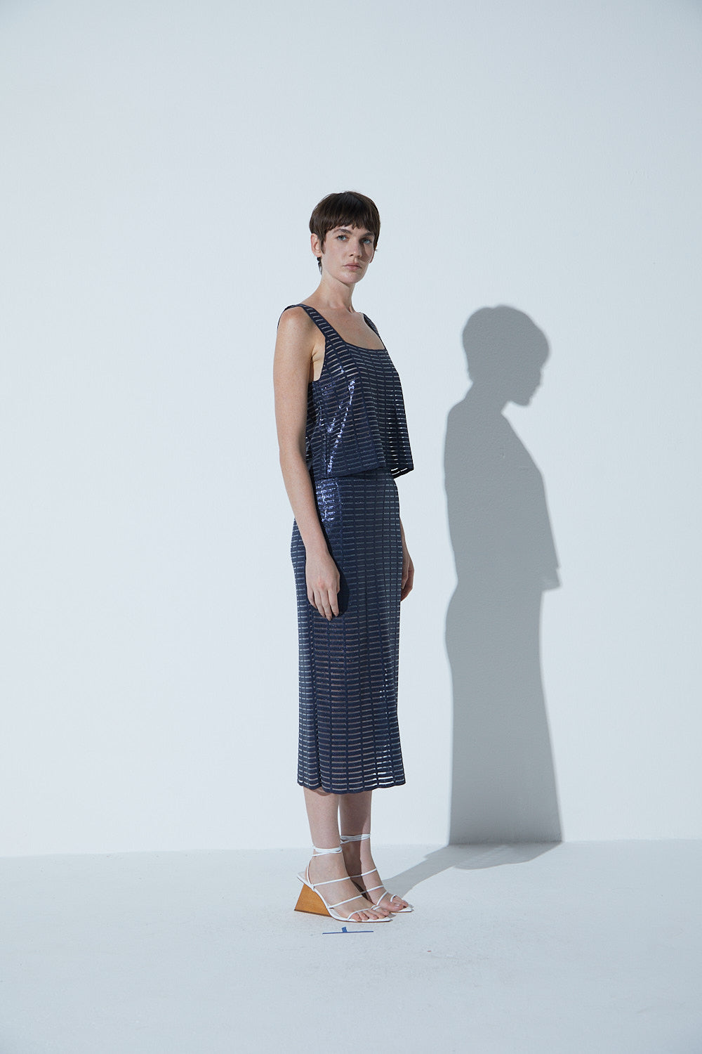 A Saia Lápis em Tricot é a escolha ideal para looks despojados e cheios de estilo. Ela tem midi, listras, leve transparência e um charmoso aplique em foil azul marinho. O tecido de tricot proporciona conforto e movimento, para você se sentir linda e à vontade!