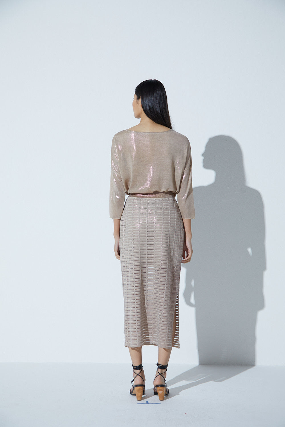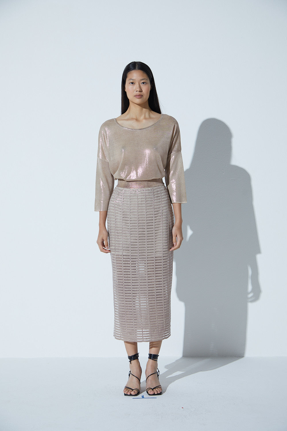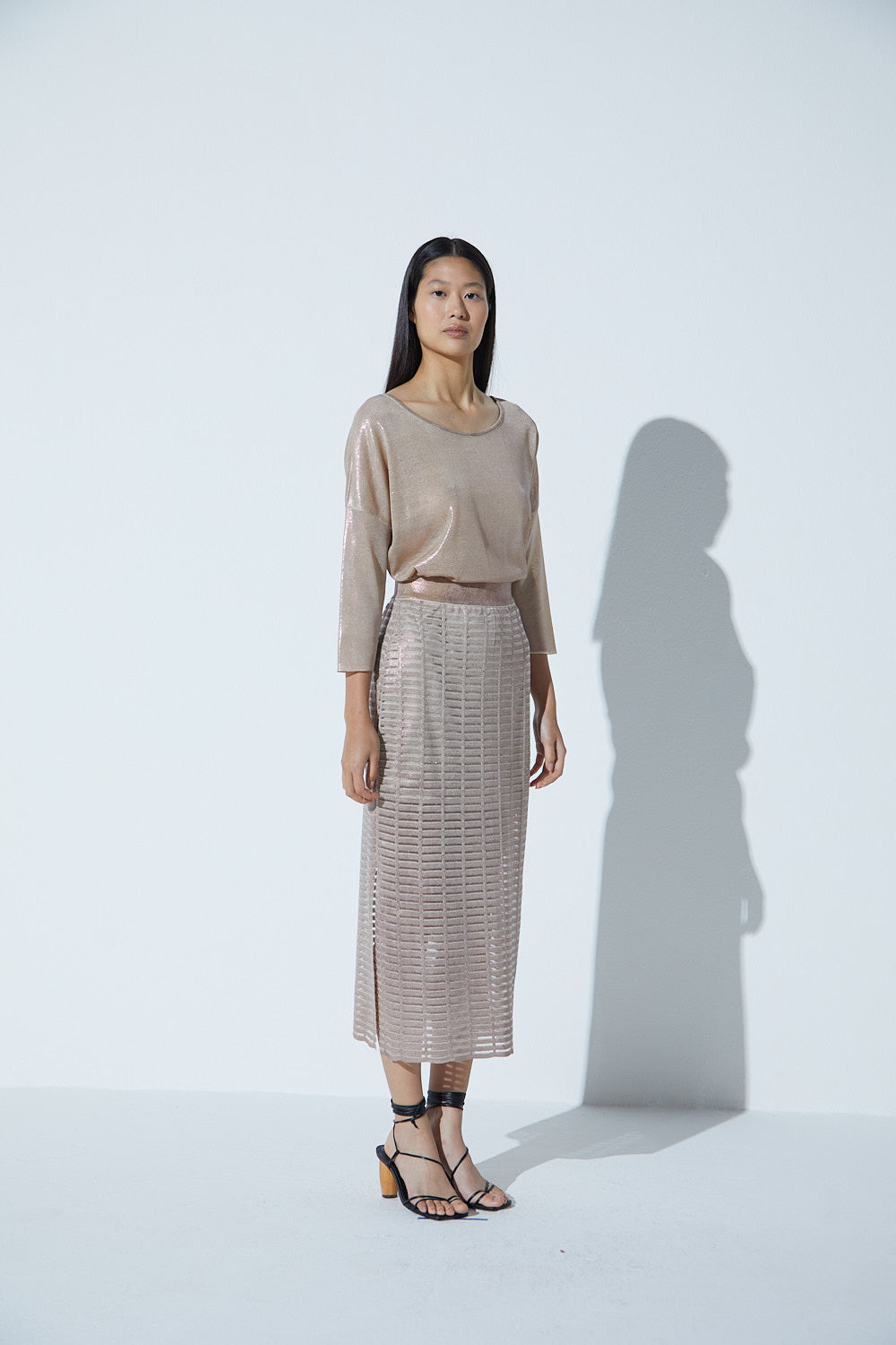 A Saia Lápis em Tricot é a escolha ideal para looks despojados e cheios de estilo. Ela tem midi, listras, leve transparência e um charmoso aplique em foil azul marinho. O tecido de tricot proporciona conforto e movimento, para você se sentir linda e à vontade!