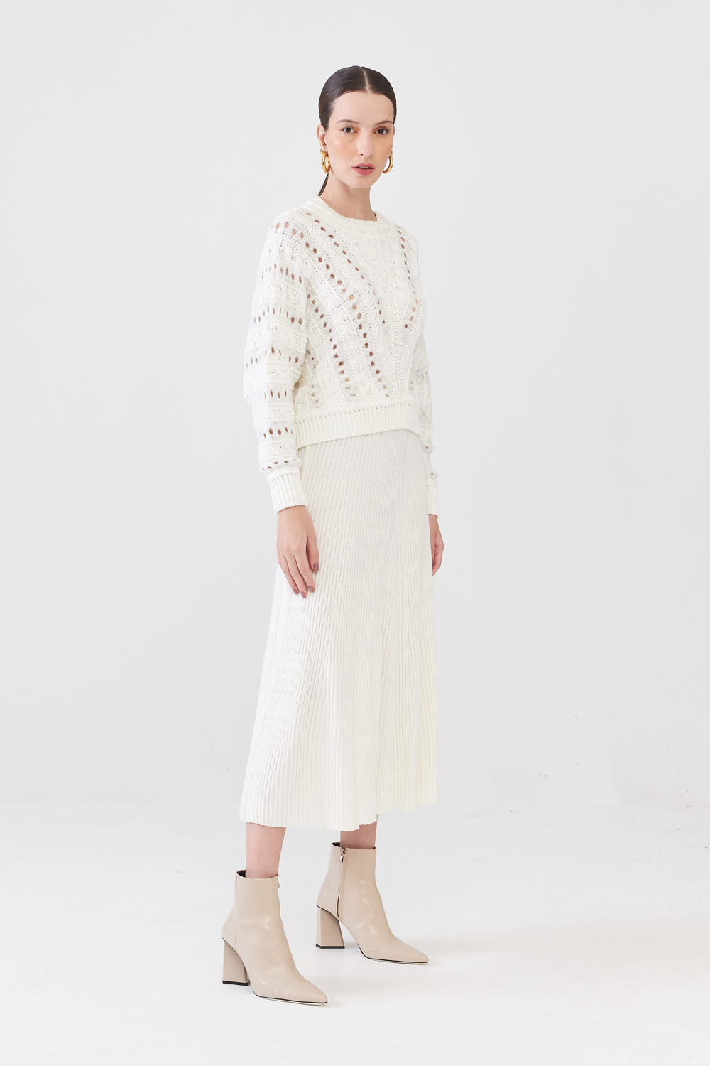 Esta saia midi canelada em hoya é perfeita para qualquer ocasião. Confeccionada em tricot macio e toque suave, proporciona conforto e elegância. Possui cintura alta e modelagem levemente rodada, valorizando a silhueta feminina. Ideal para compor qualquer look com estilo e sofisticação.