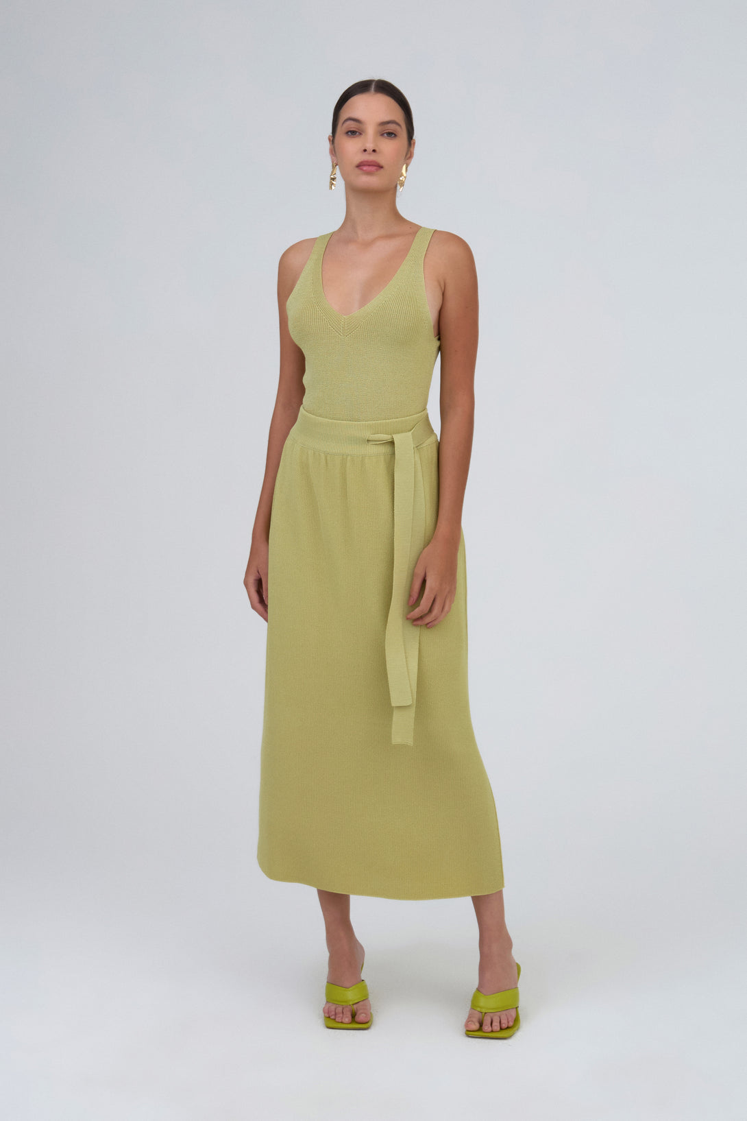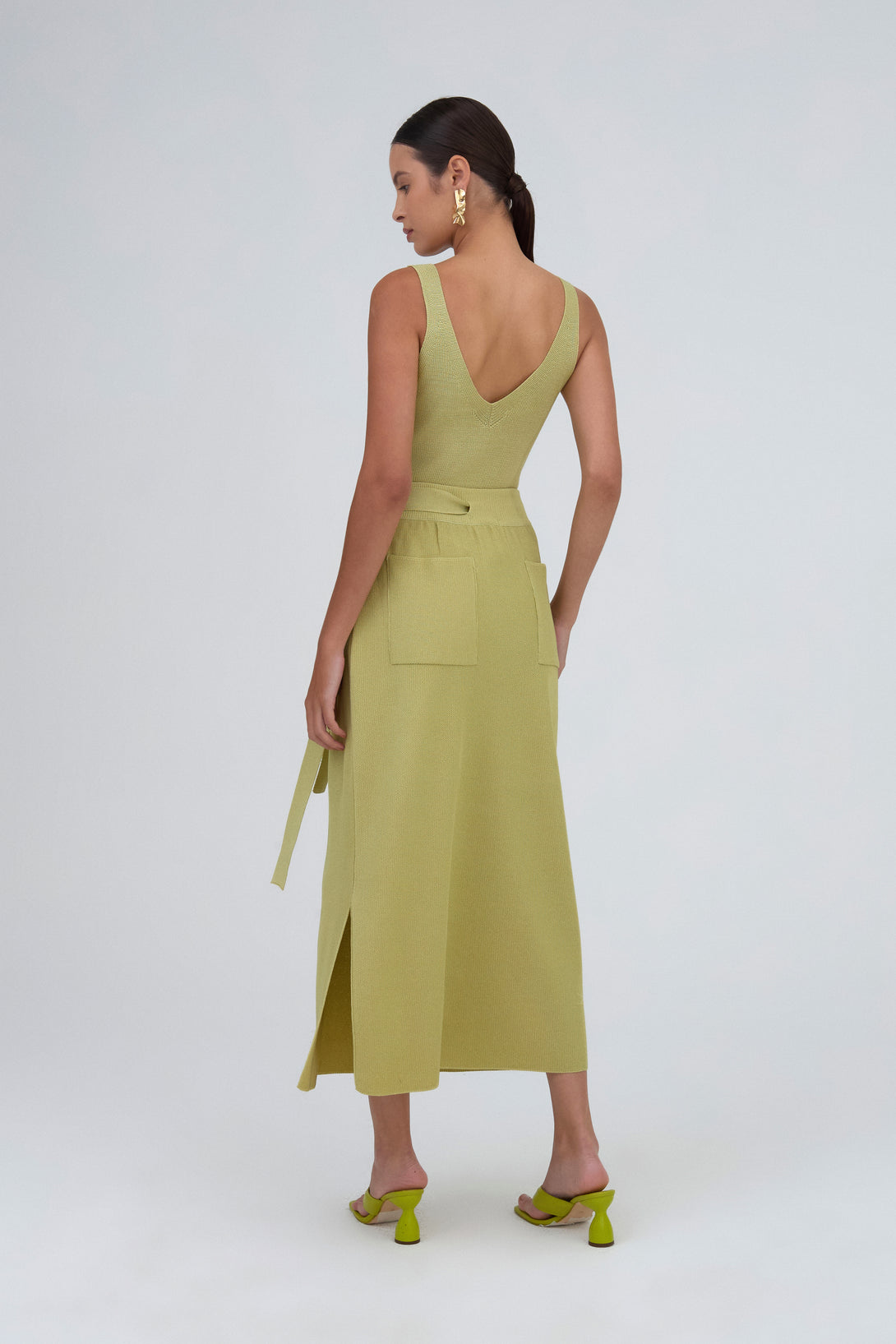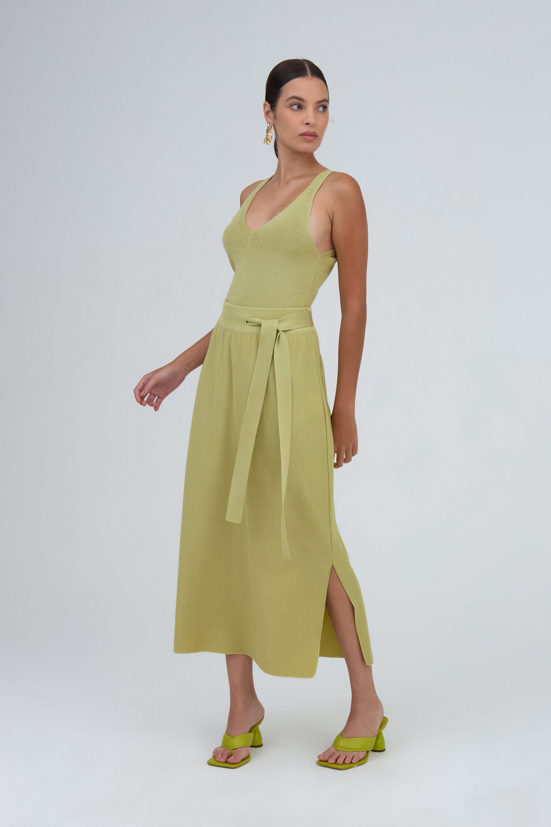 Saia Midi Com Cinto Amarração Em Tricot Piquet Avocado