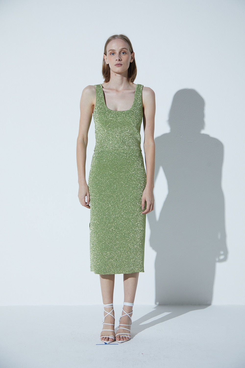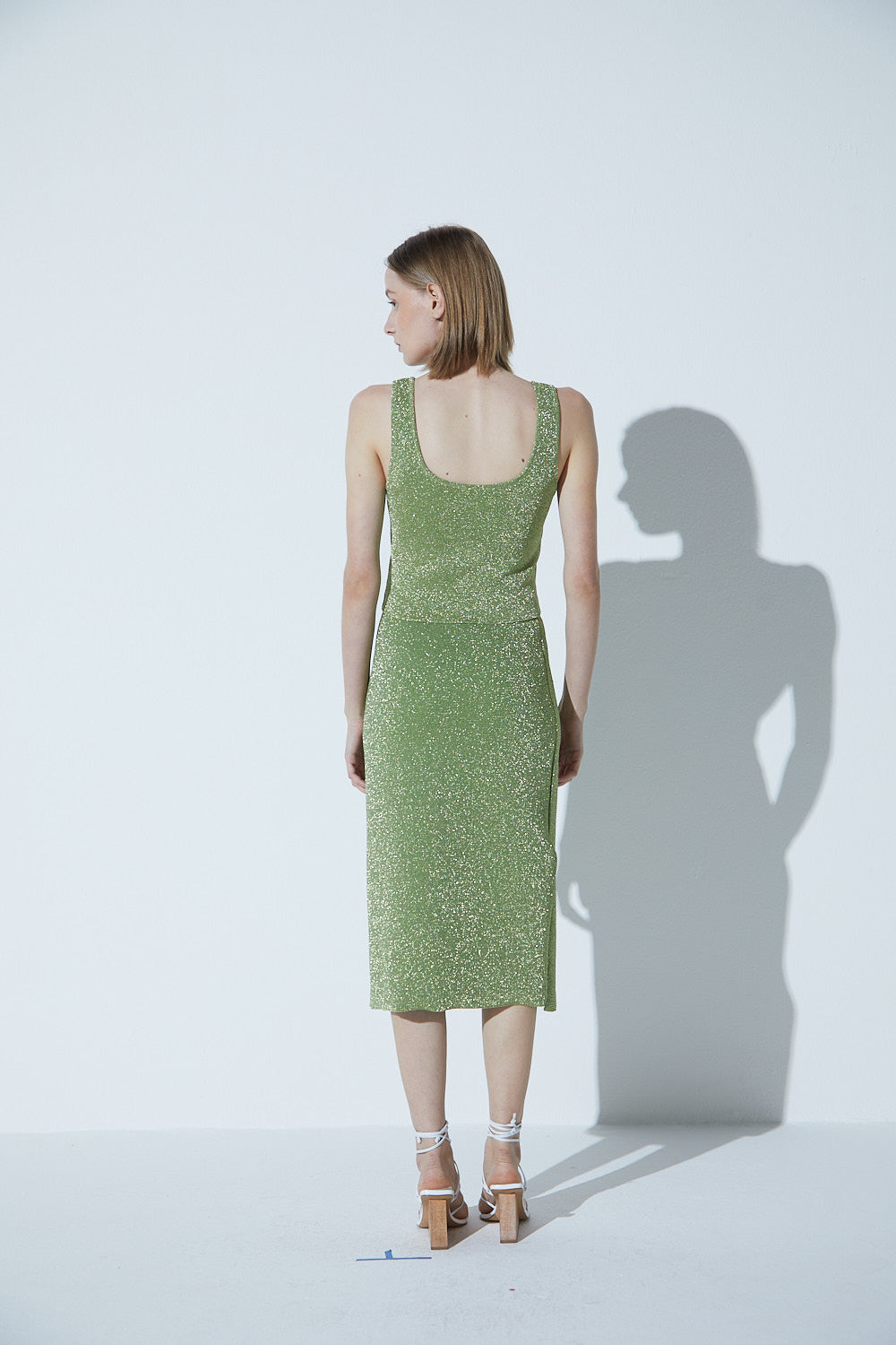 Saia Midi Com Fenda Em Tricot Lurex Verde