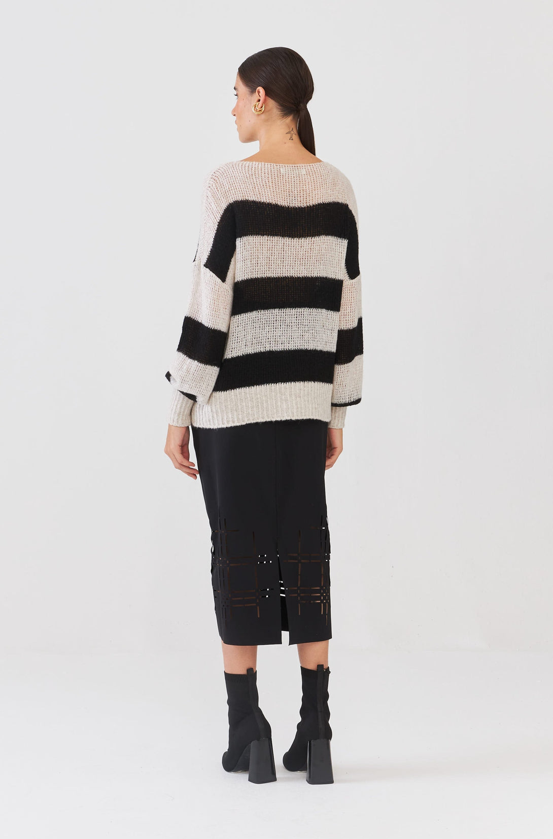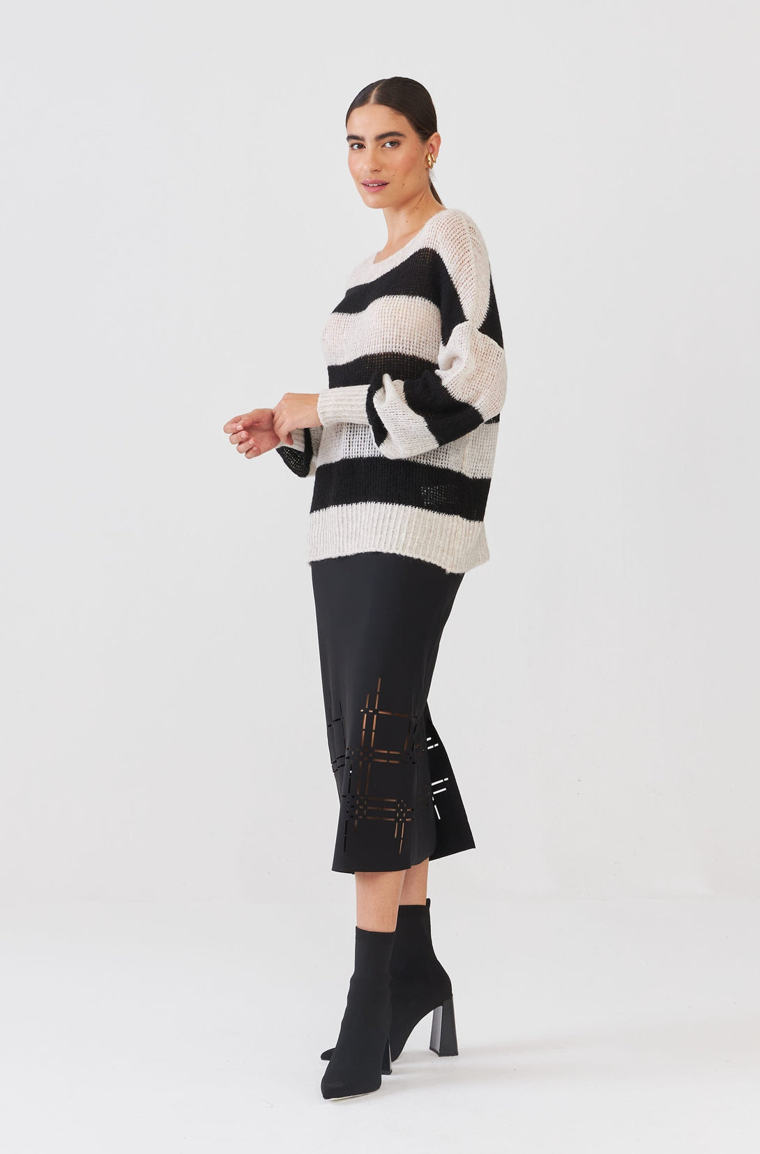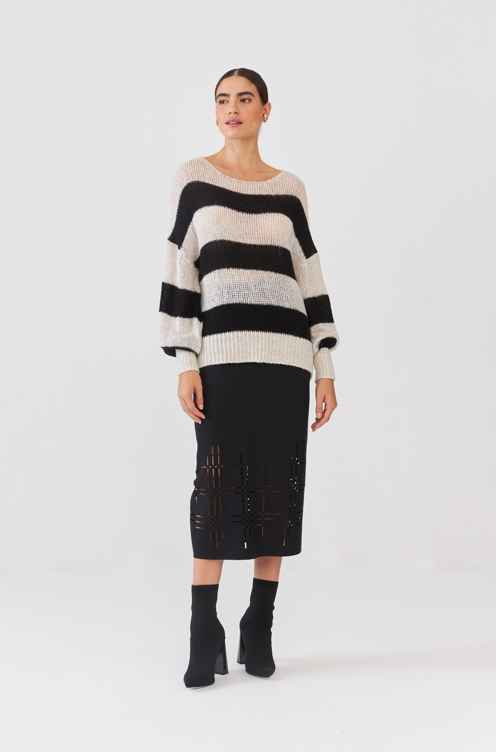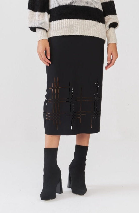 A saia midi possui recortes estratégicos feitos a laser, conferindo-lhe um visual moderno e sofisticado. Feita em malha block possui um caimento estruturado, é confortável e garante que você se sinta confiante e elegante no shape midi.