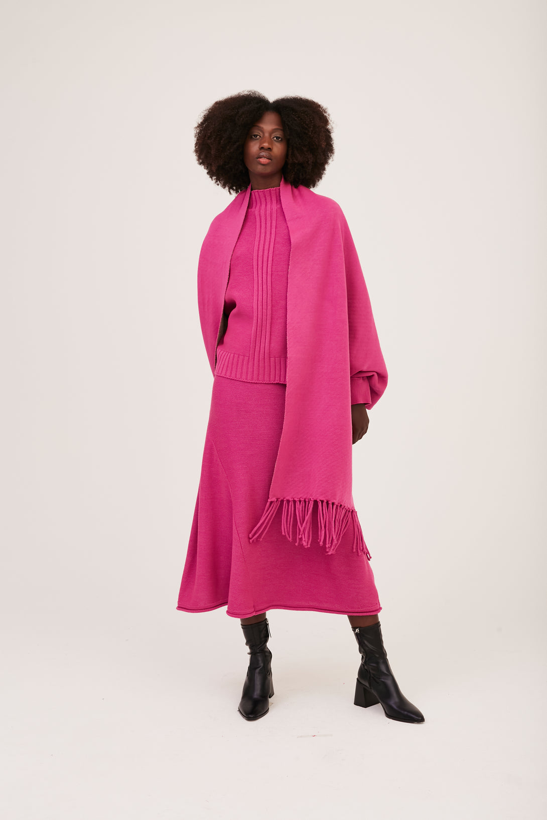 Sua modelagem midi com leve abertura cria uma silhueta alongada e feminina, enquanto os acabamentos impecáveis reforçam o DNA premium da marca. Versátil, a peça transita com naturalidade entre produções casuais chiques e composições mais formais, combinando perfeitamente com tricots amplos, camisas ou blusas ajustadas.