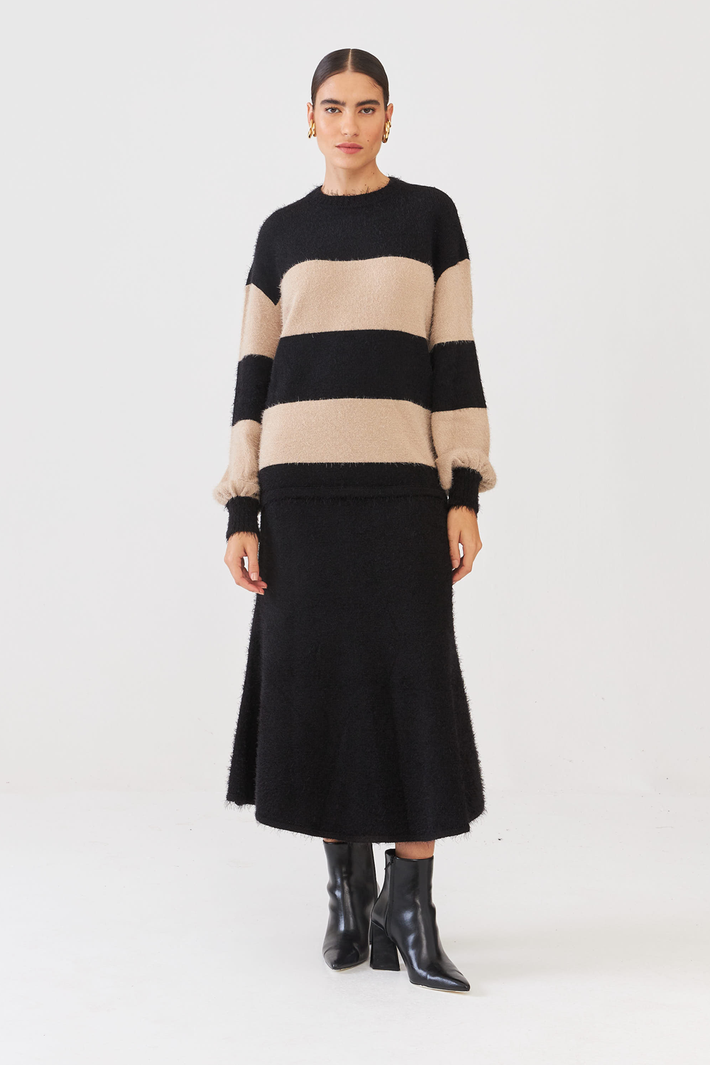 A Saia Midi Em Tricot Peluche é a combinação perfeita entre conforto e estilo, confeccionada em tricot de pelúcia, possui comprimento midi e detalhes únicos que adicionam elegância ao seu look. Ideal para criar produções sofisticadas e modernas.