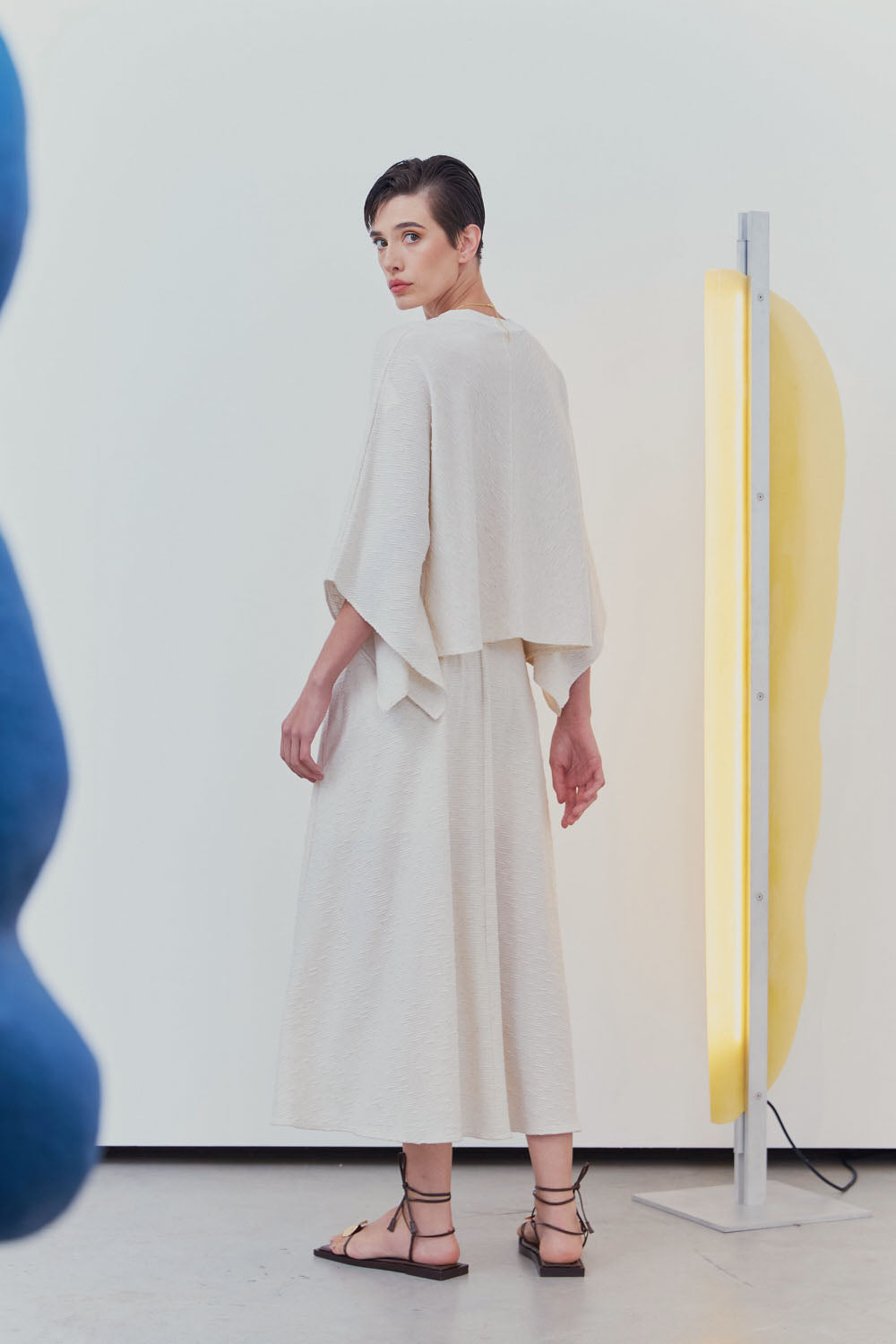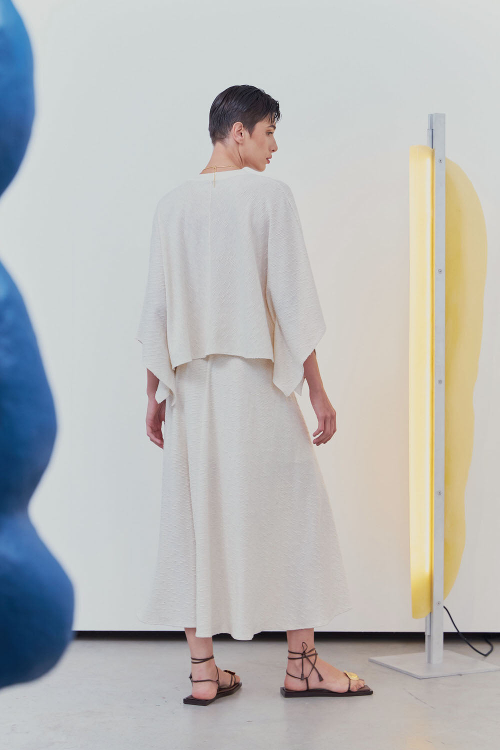 Tecida em malha flamê linho, a saia apresenta uma construção que remete a um canelado fino e delicado. Com modelagem solta ao corpo e comprimento midi, é perfeita para um look elegante e descontraído.