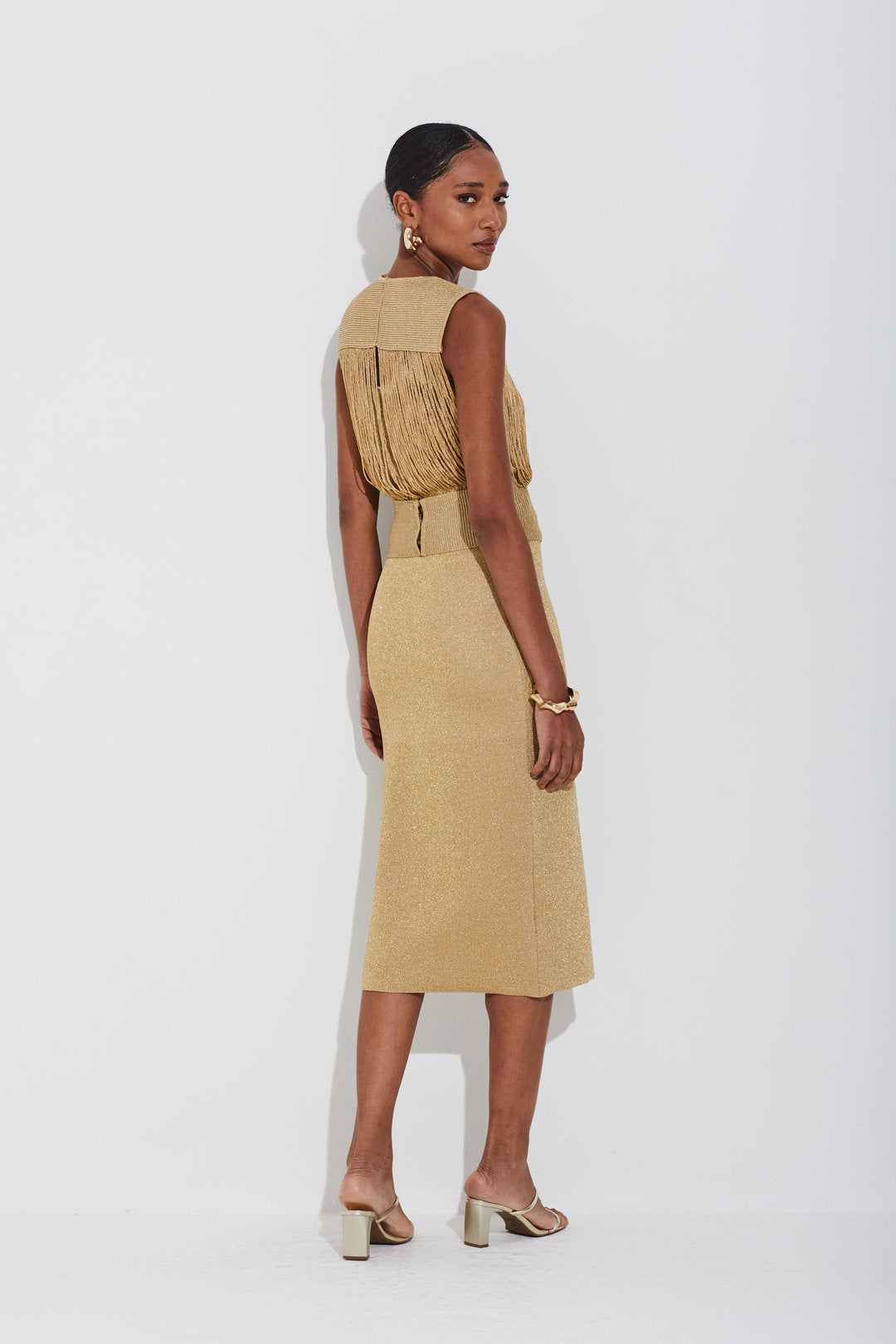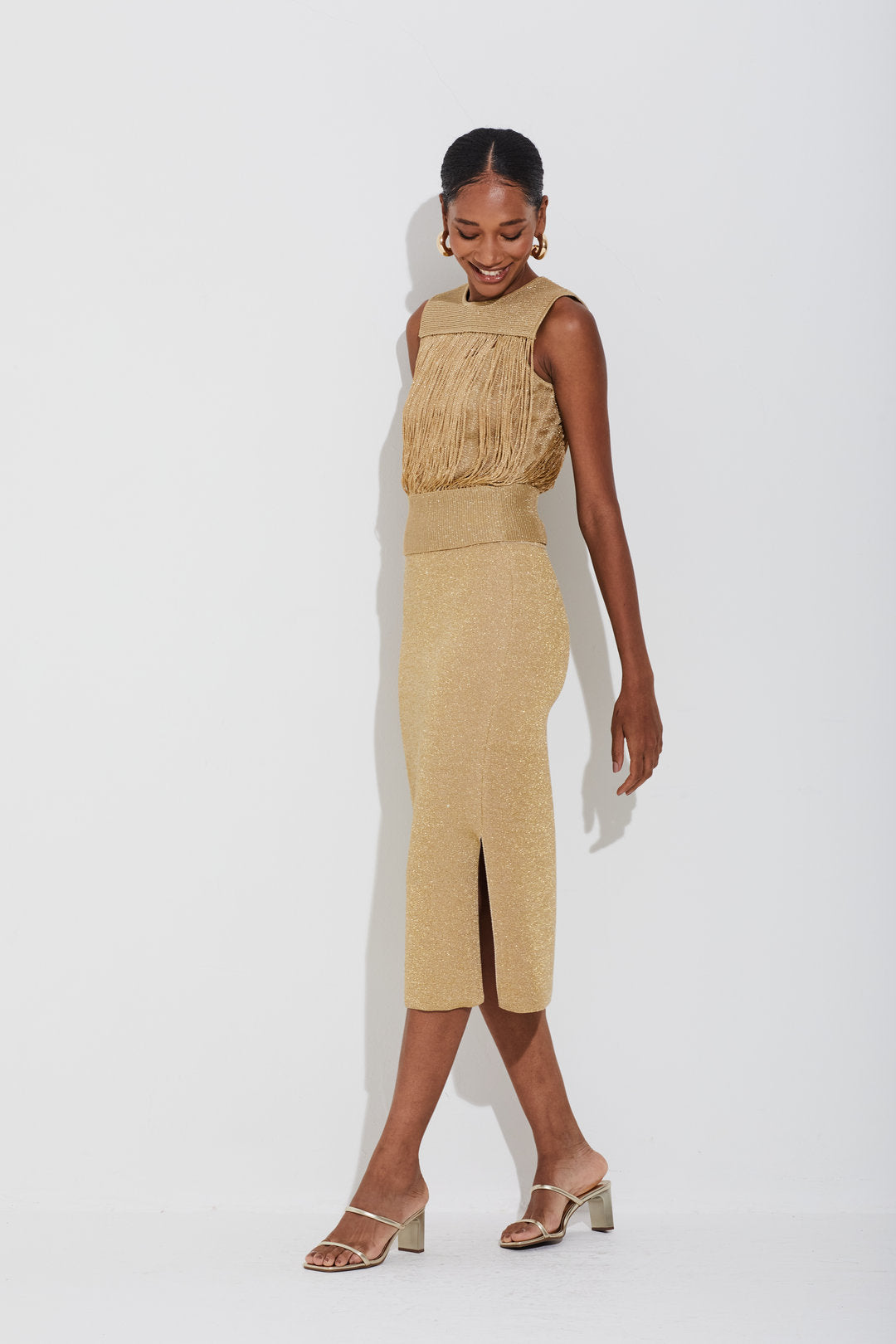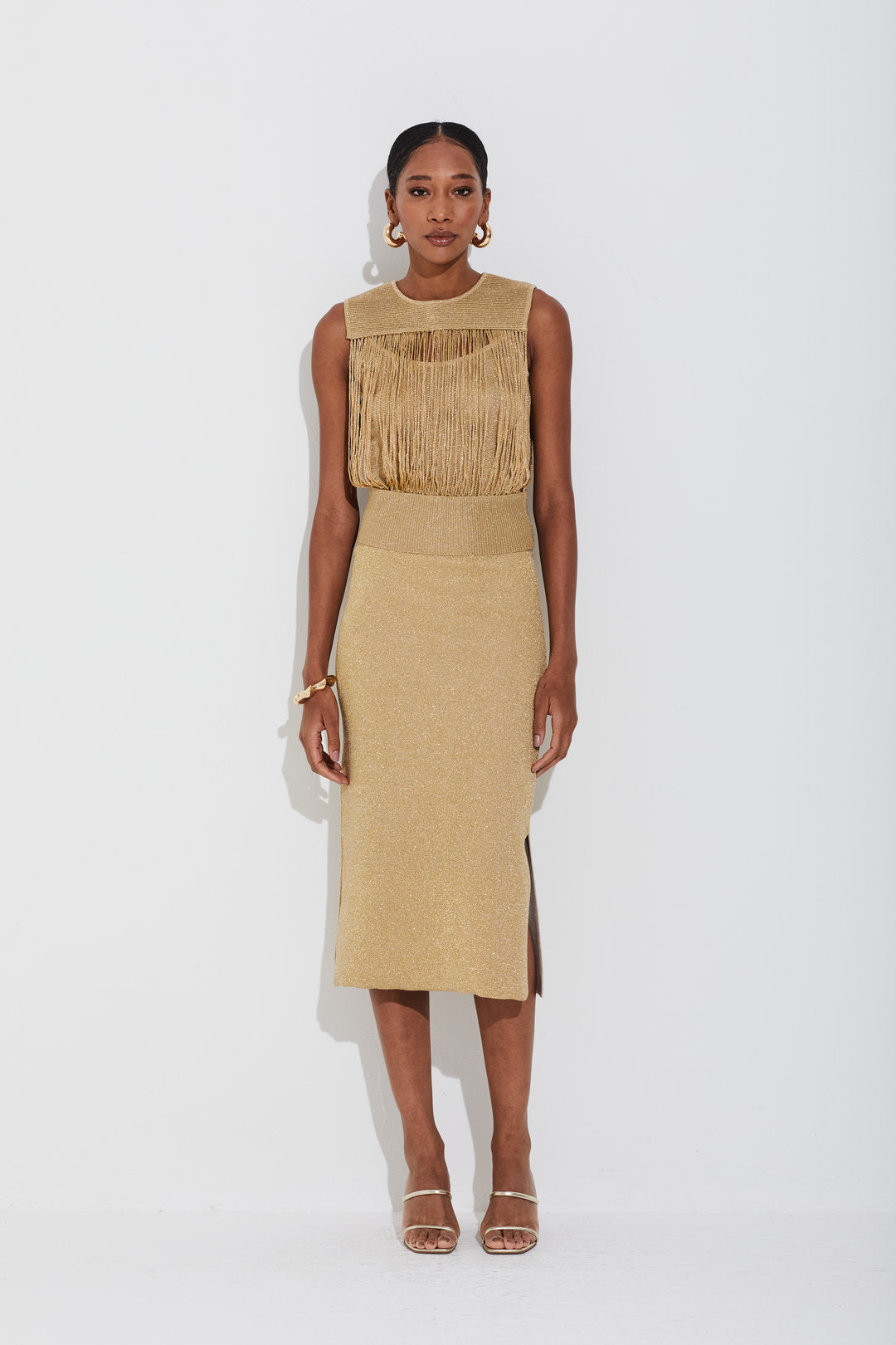Saia Midi Tricot Com Lurex Transparencia Dourado