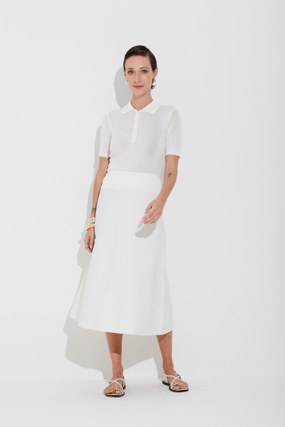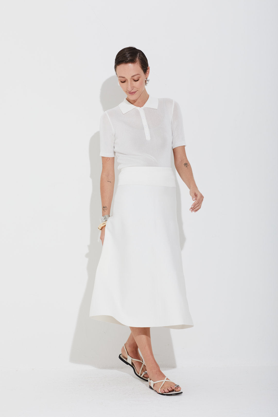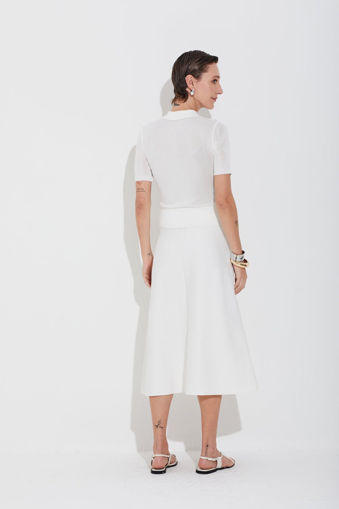 Saia midi em tricot encorpado com elastano, com modelagem evasê que garante movimento e conforto. O cós com elástico e detalhe de pala valoriza a cintura, enquanto a costura única na parte de trás confere um acabamento clean e sofisticado.