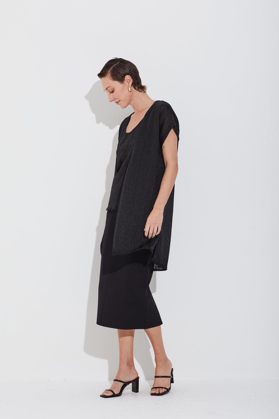 Saia lápis midi em tricot encorpado com elastano, que valoriza as formas com conforto e estrutura. Possui cós com elástico embutido, fenda nas costas e acabamento com brilho acetinado, que traz um toque moderno e sofisticado à peça.