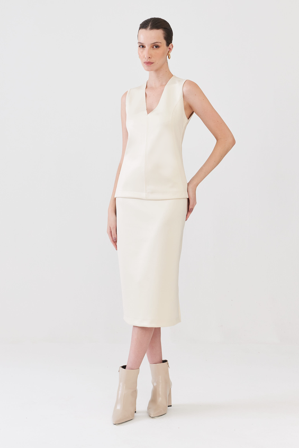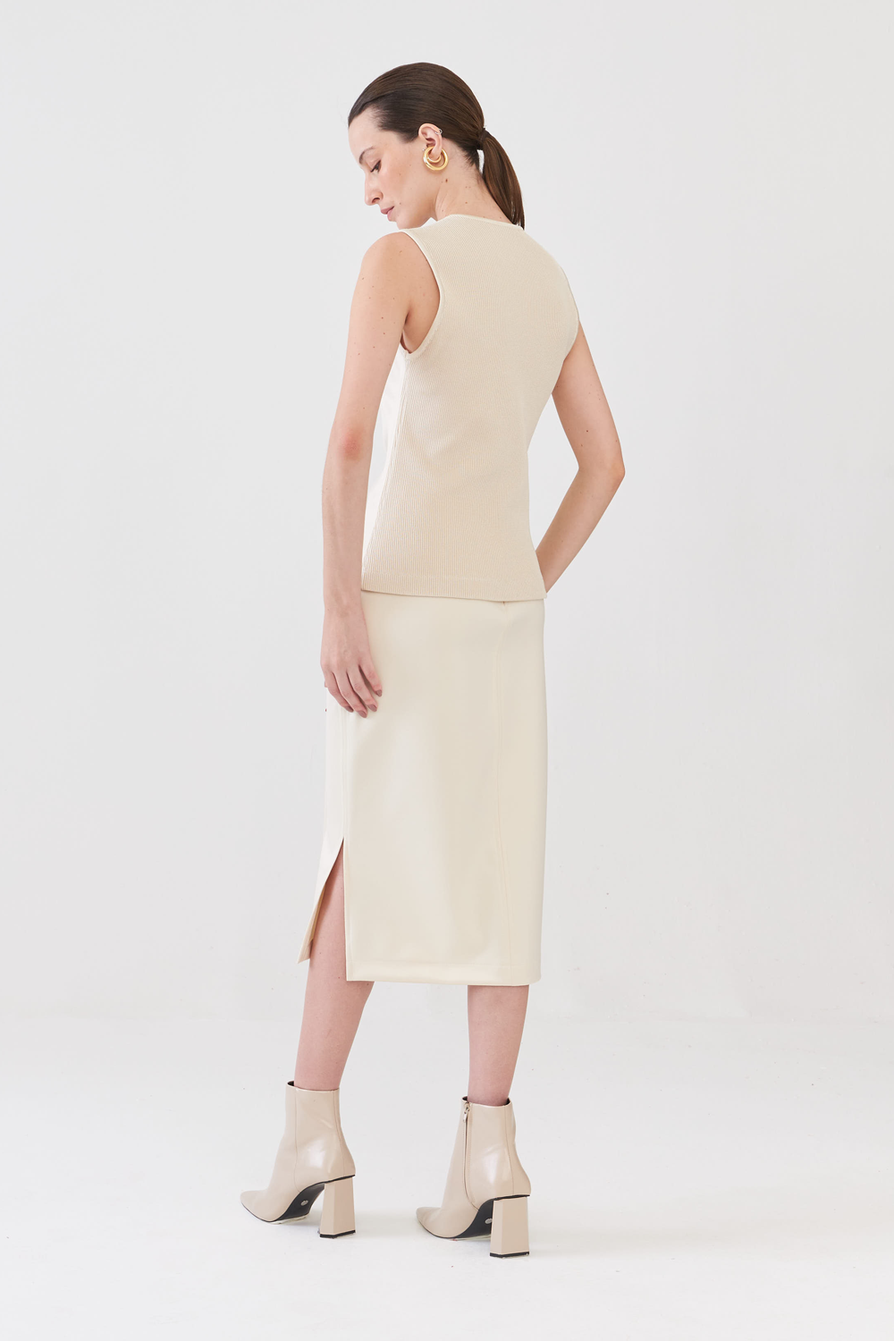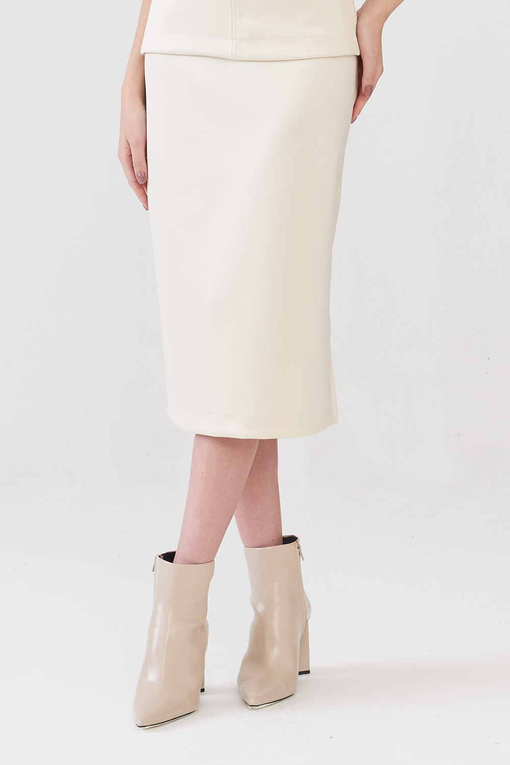 Esta saia reta longuete feita em malha leather é perfeita para qualquer ocasião. Sua malha possui um beneficiamento especial que proporciona um acabamento similar ao couro. Ideal para um look moderno e elegante.