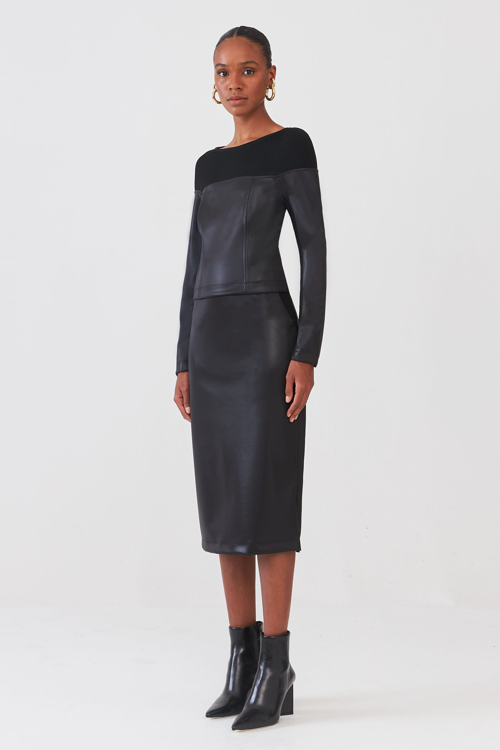 Esta saia reta longuete feita em malha leather é perfeita para qualquer ocasião. Sua malha possui um beneficiamento especial que proporciona um acabamento similar ao couro. Ideal para um look moderno e elegante.