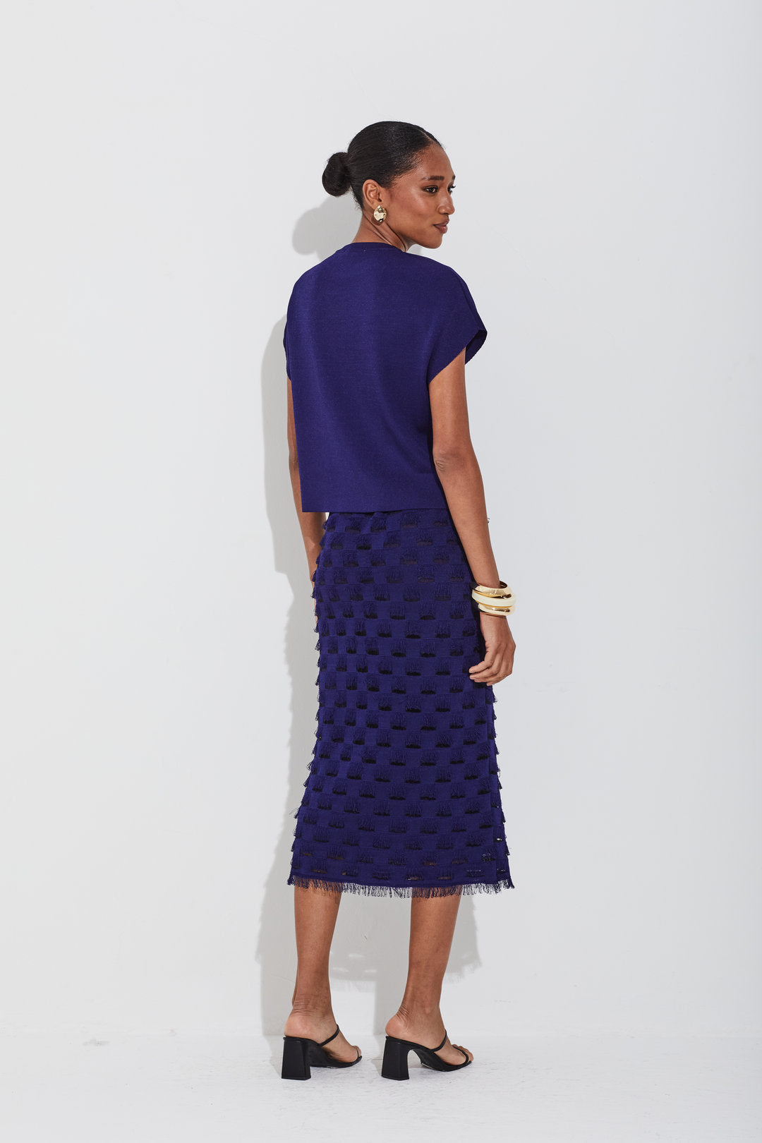 Saia reta midi em tricot com detalhes geométricos vazados que trazem transparência sutil. Possui forro no mesmo fio de tricot, cós em elástico para conforto e barra com franjas delicadas, finalizando o visual com estilo.
