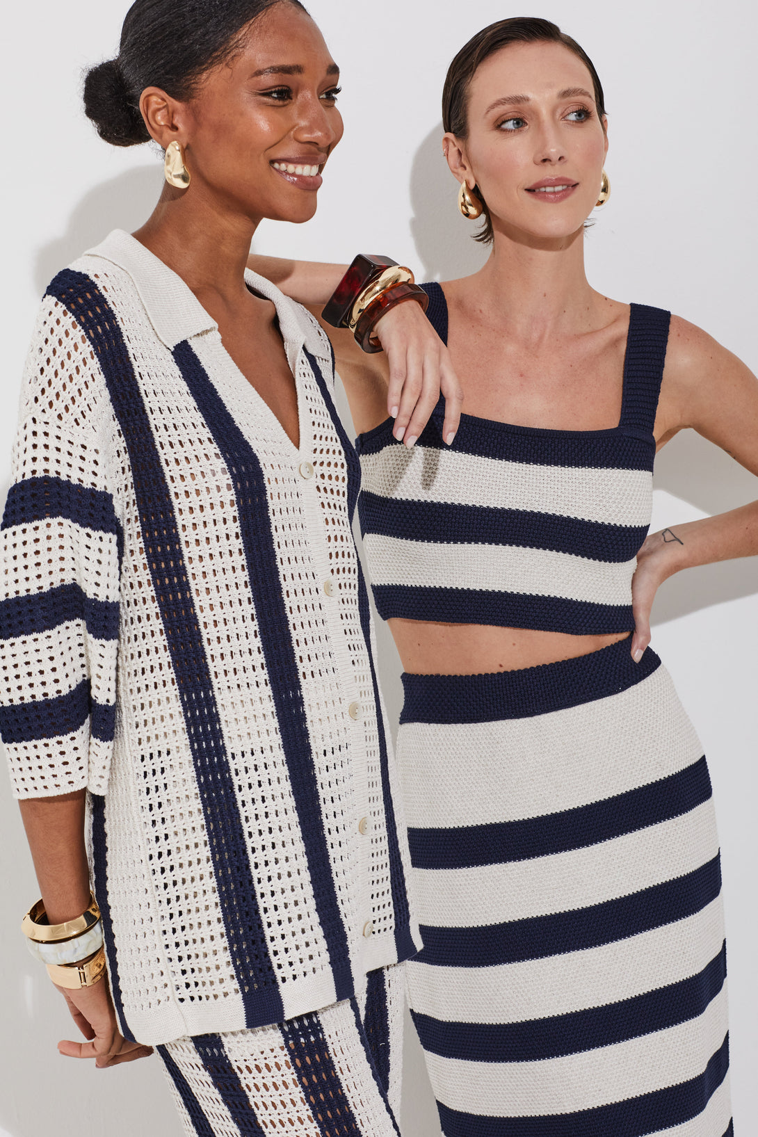Saia midi reta em tricot com textura rústica, em fio de viscose com elastano para conforto e elasticidade. O cós com elástico garante ajuste prático e facilidade no vestir. Com listras horizontais que dão um toque atemporal ao visual, a peça é versátil e perfeita para looks casuais e elegantes.