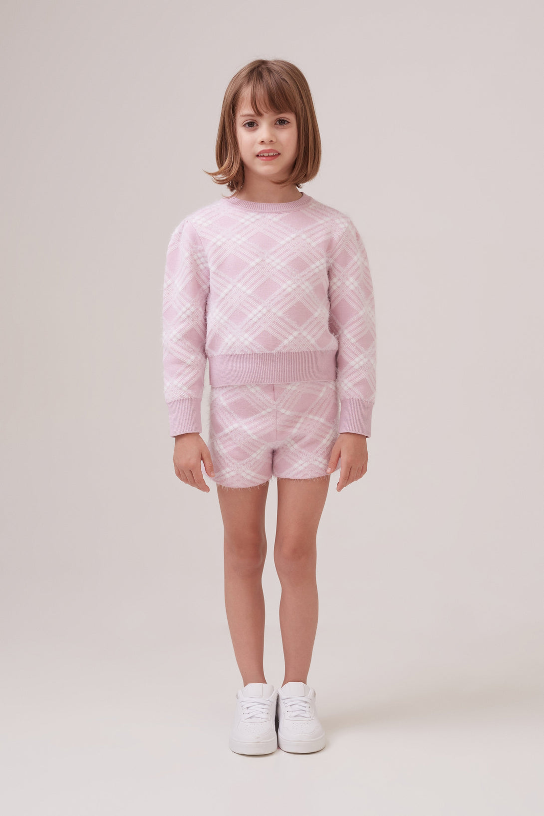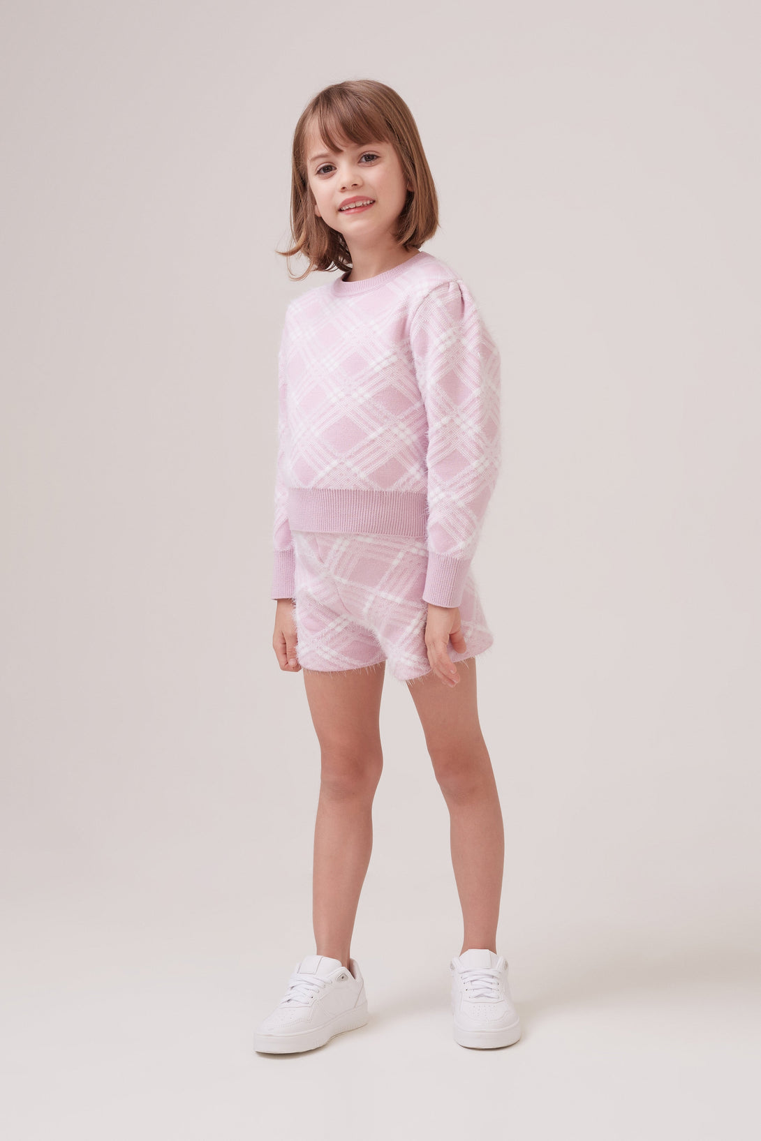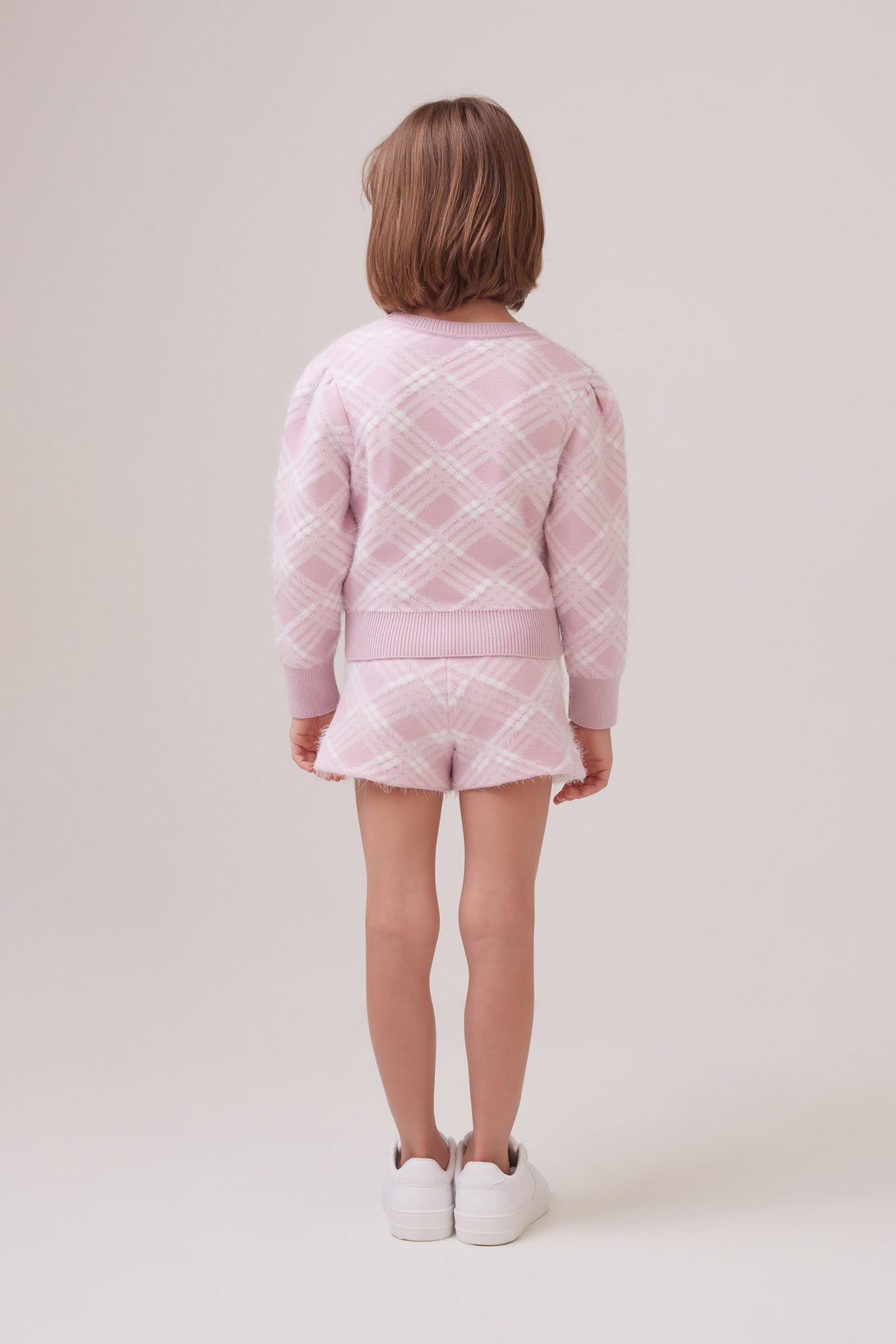Shorts Infantil Evasê Em Tricot Jacquard Xadrez Lilac