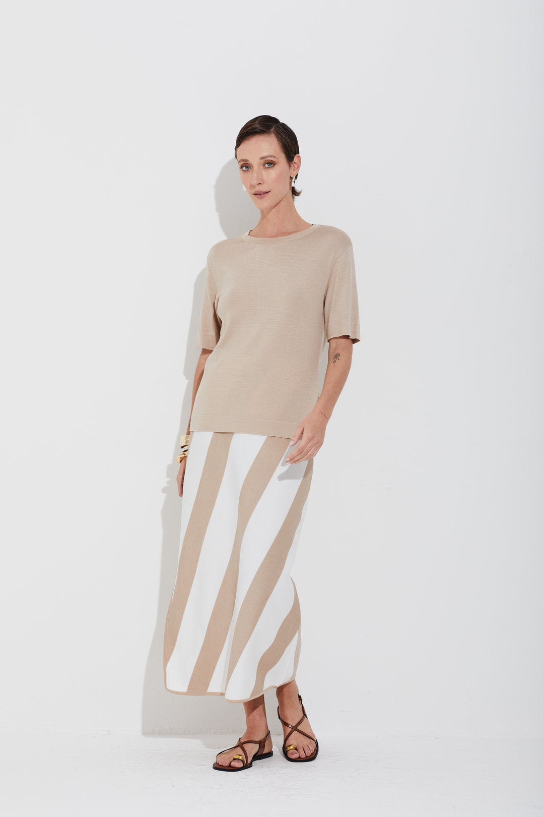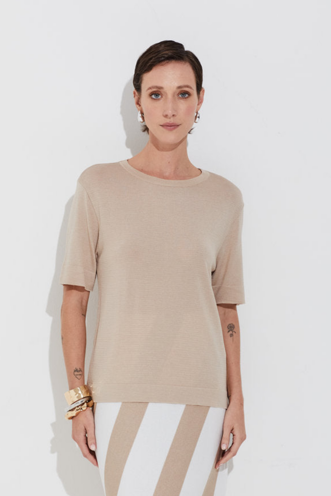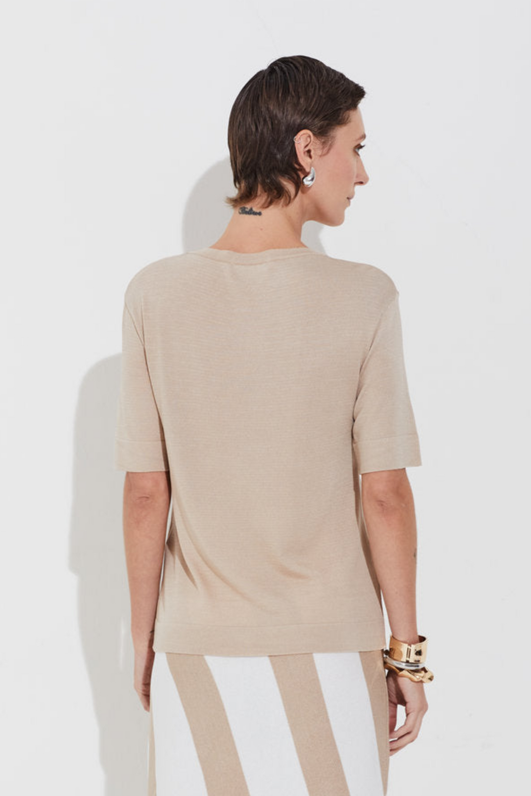 T-shirt em tricot confeccionada no fio Rayon Flex, com leve brilho acetinado e toque suave. De modelagem regular, tem gola redonda e acabamento limpo, unindo conforto e elegância no dia a dia. Um básico repaginado da nossa linha VF Essencial — leve, versátil e atemporal.