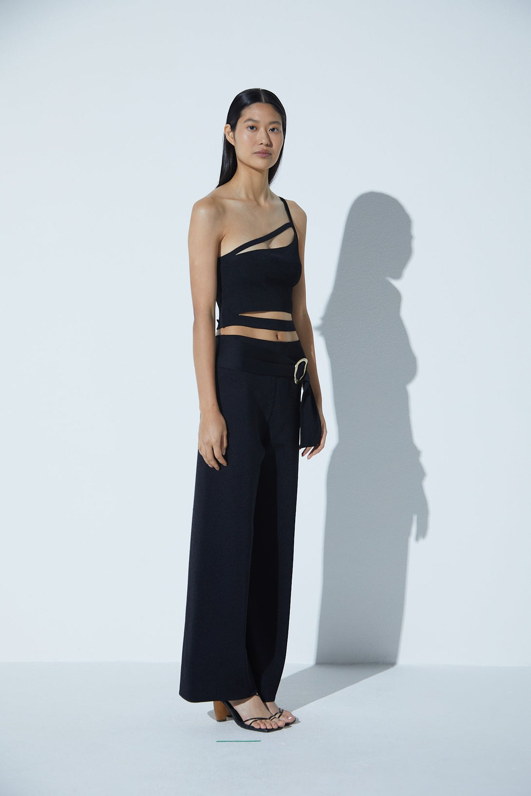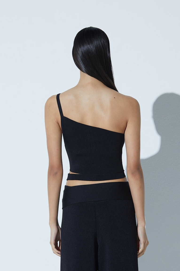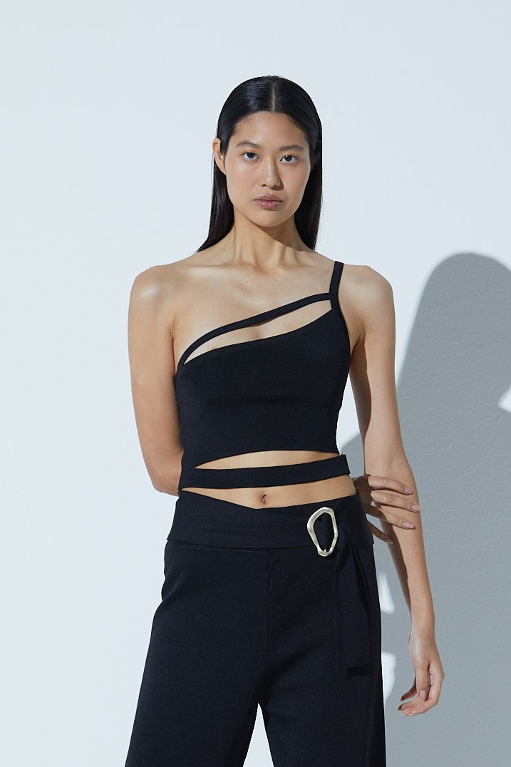 O Top Com Tiras Em Tricot Preto é uma peça versátil e moderna para o guarda-roupa feminino. O top é de um ombro só, com alça fina e detalhe de tiras tendência da estação, proporcionando uma aparência elegante e cheia de personalidade. Seu tecido em tricot rm rayon garante conforto e estilo com estruturação e brilho sutil.