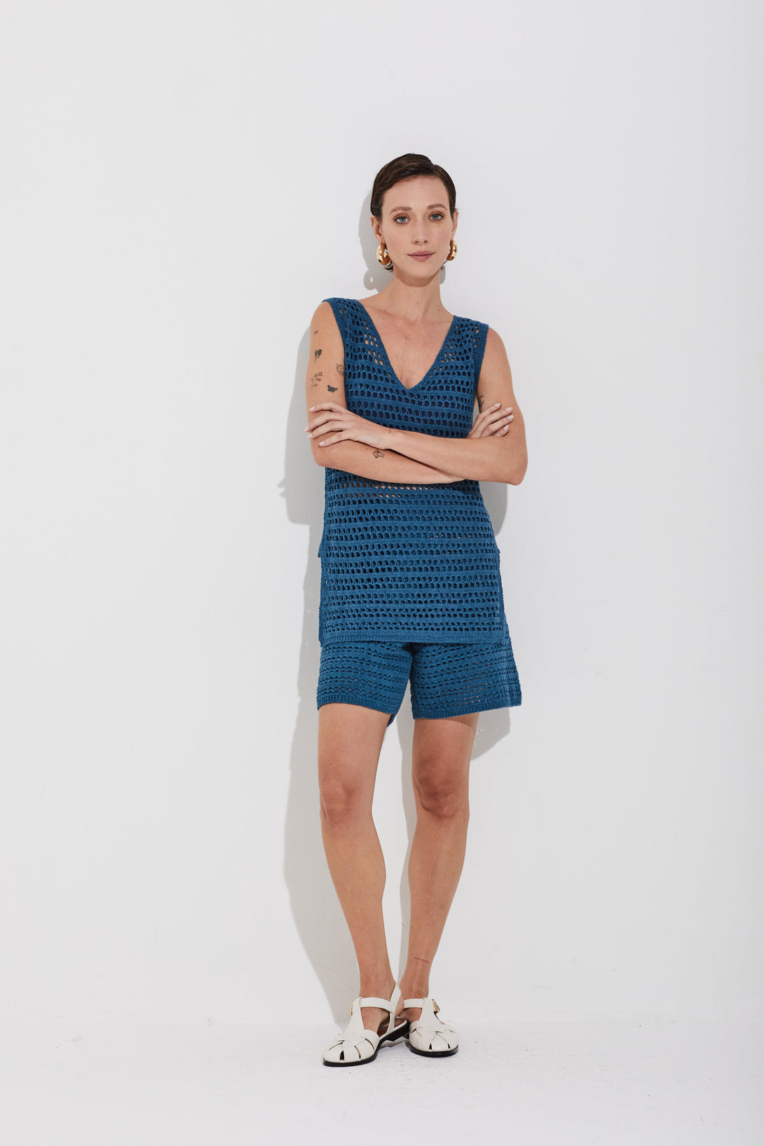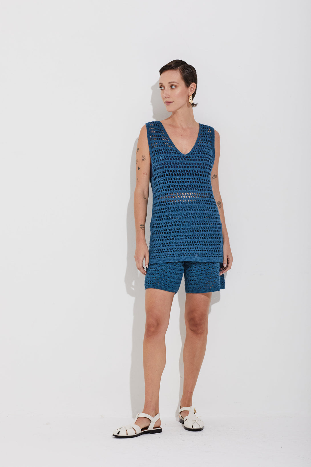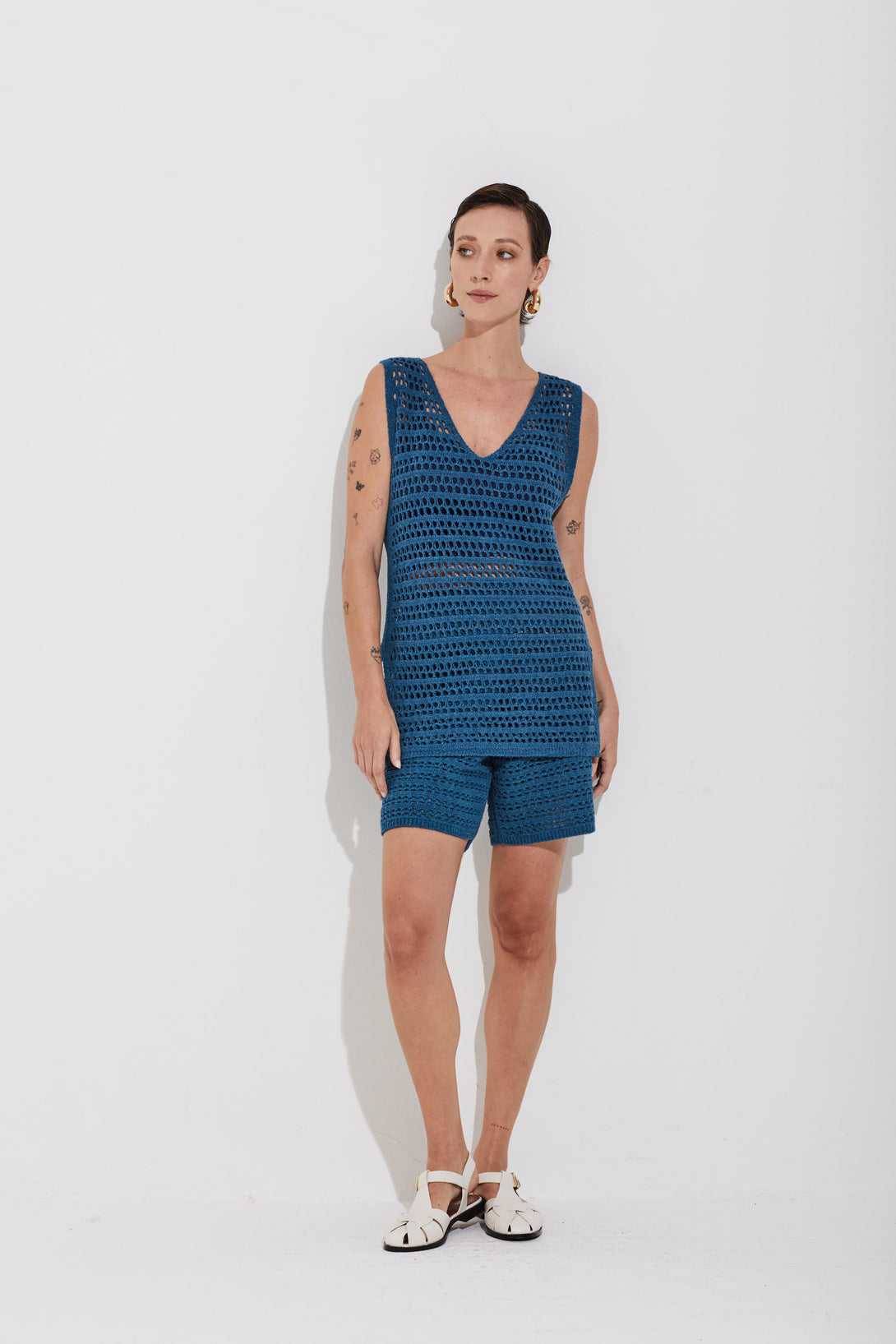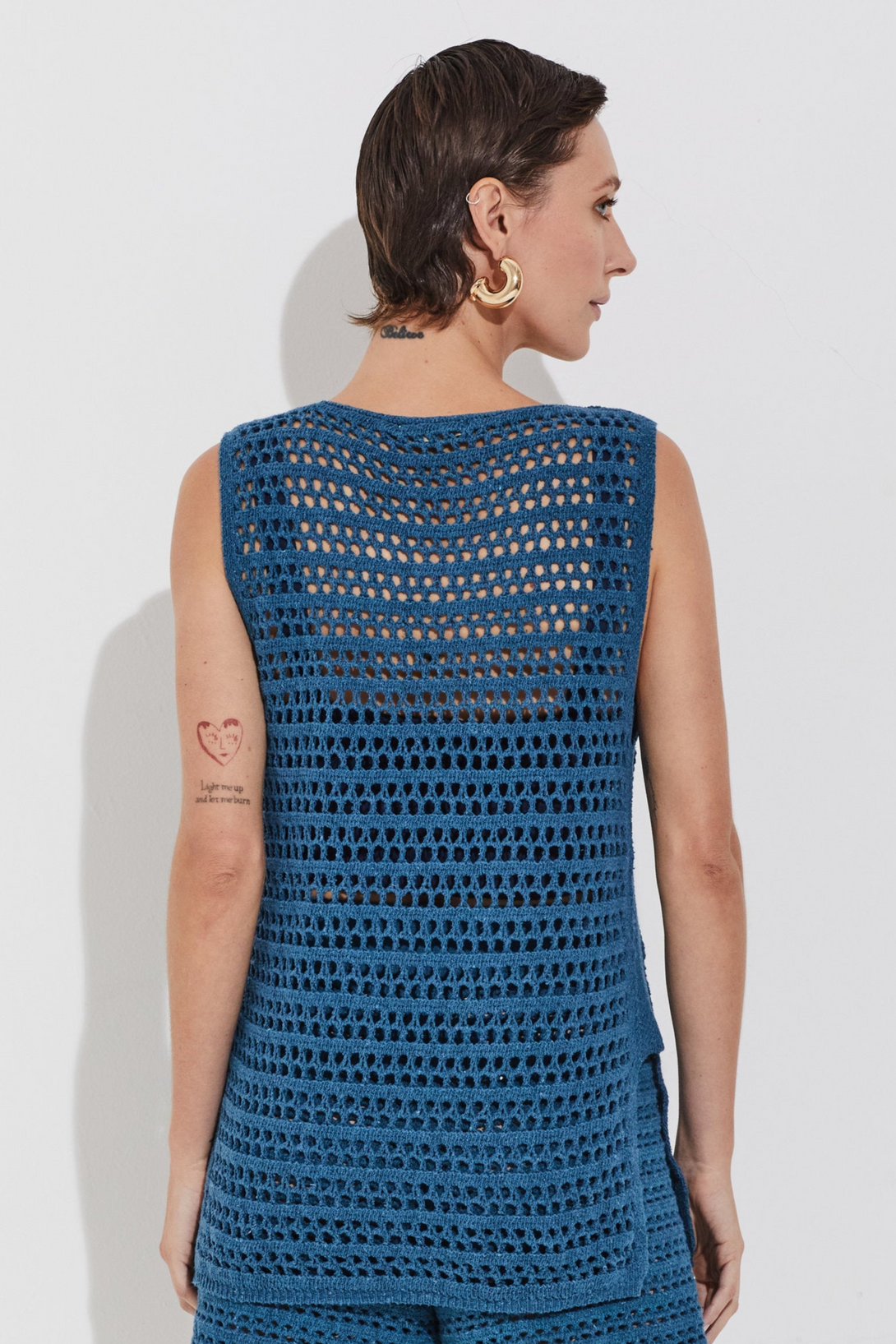 Veste alongada em tricot com inspiração handmade, confeccionada em fio de algodão reciclado que une sustentabilidade e estilo. Com gola V, ponto telado vazado e aberturas laterais que proporcionam maior movimento. As alças largas garantem conforto e versatilidade, tornando a peça perfeita para ser usada também como saída de praia ou em looks casuais. Uma escolha consciente para mulheres que valorizam moda com propósito.