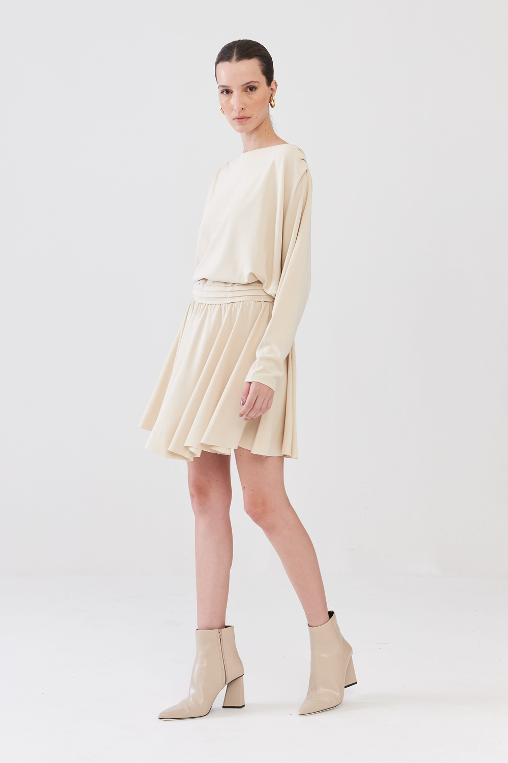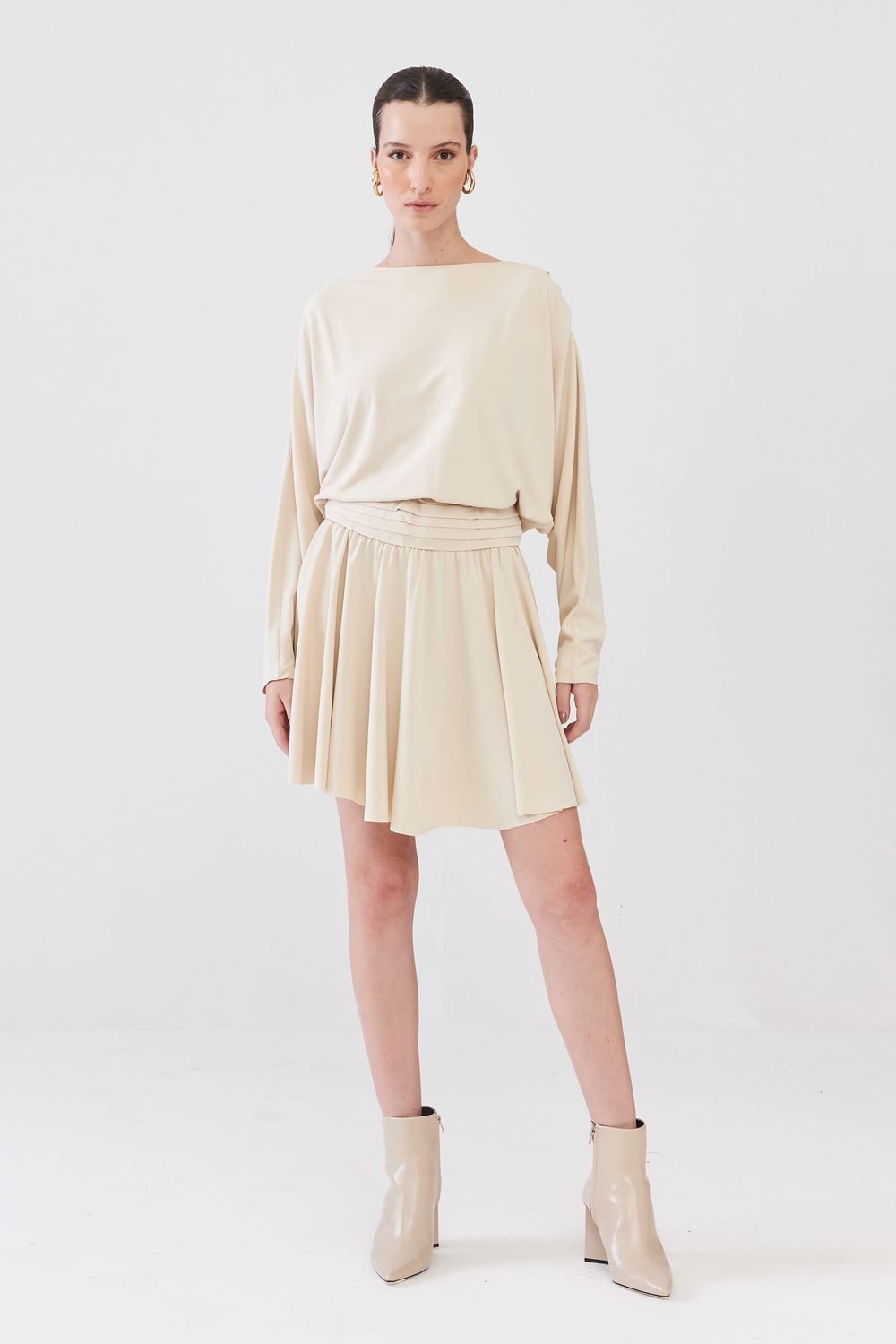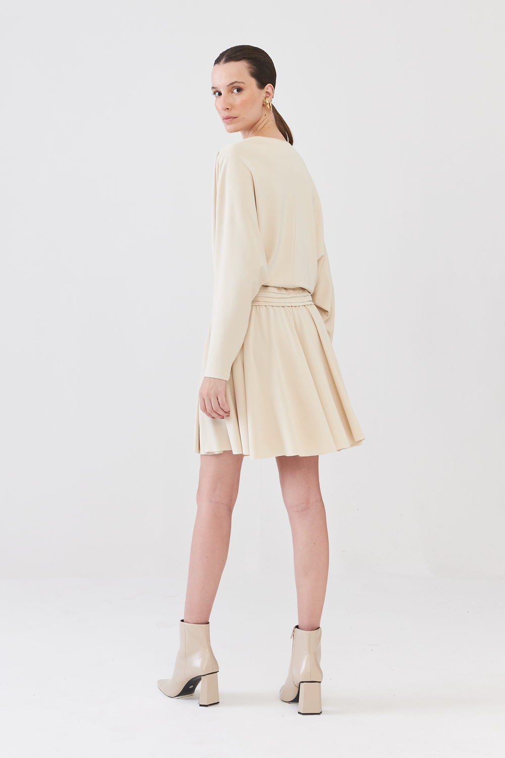 Vestido Curto Manga Morcego Com Pregas Em Malha Areia