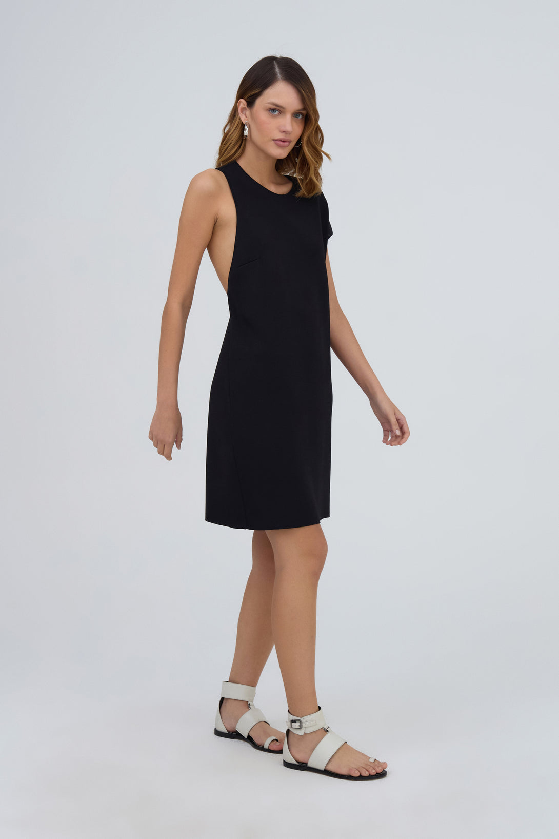 Com um shape inovador, o Vestido Curto Sem Mangas possui uma bela abertura nas costas e uma silhueta solta.