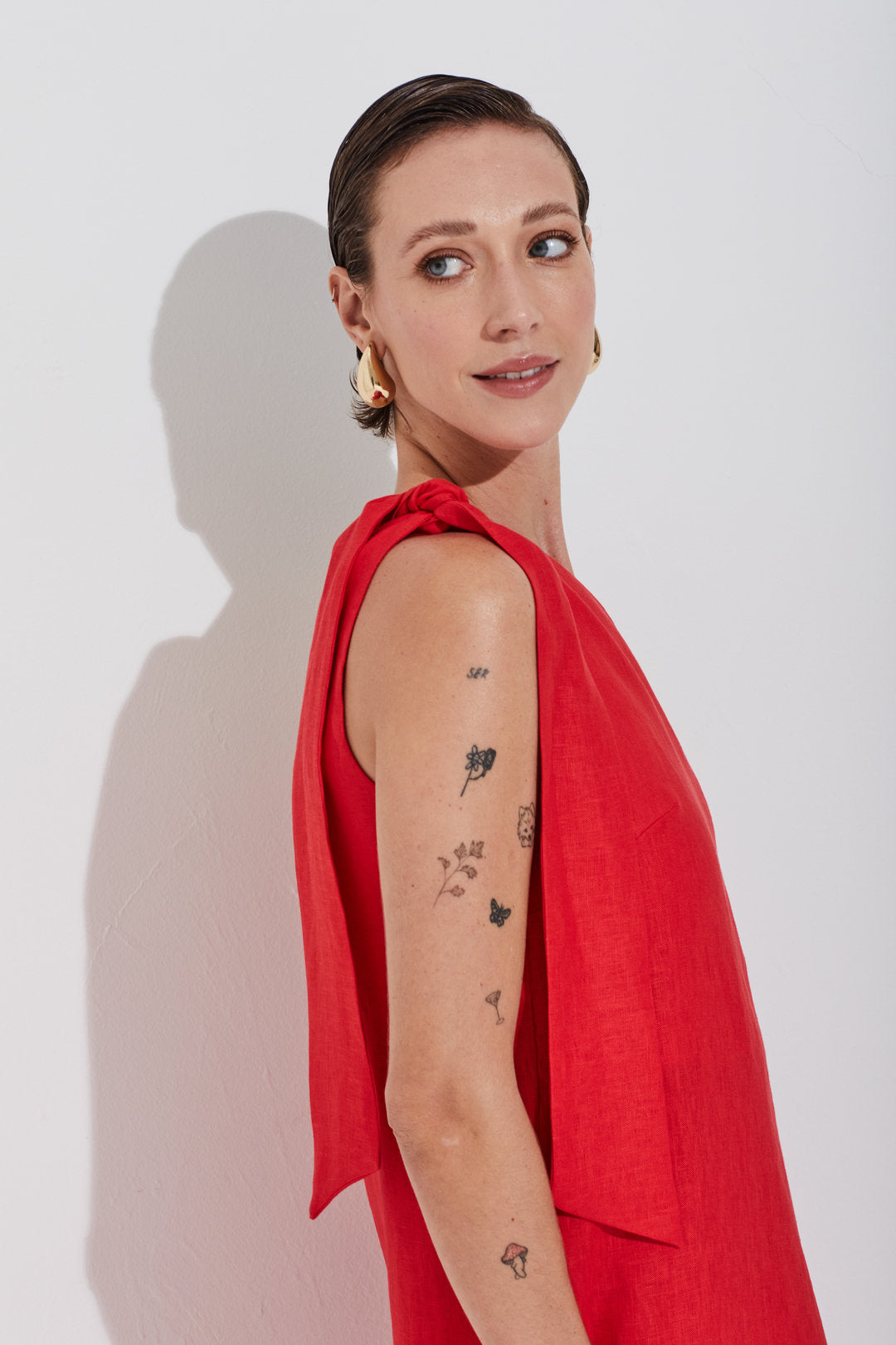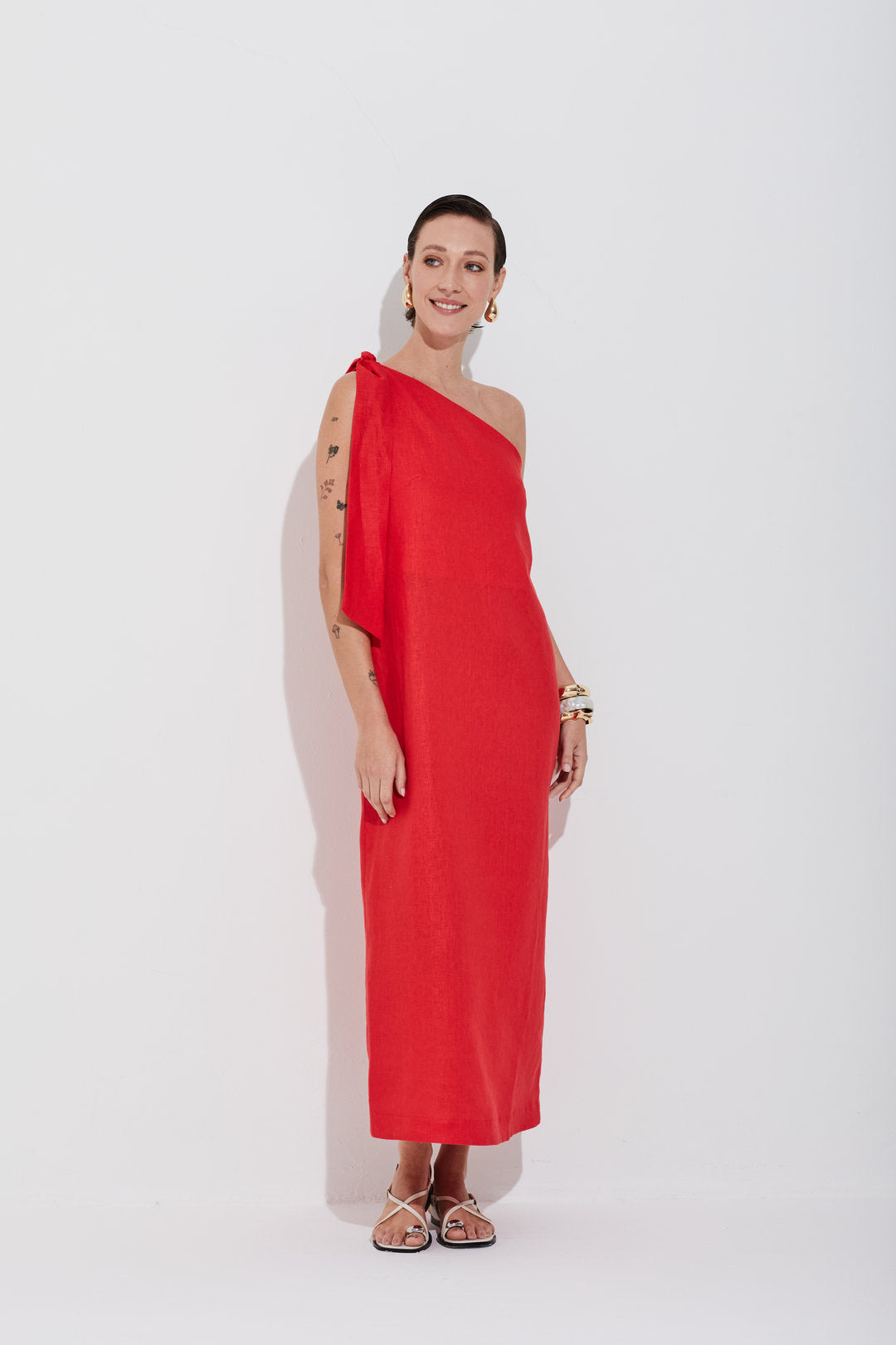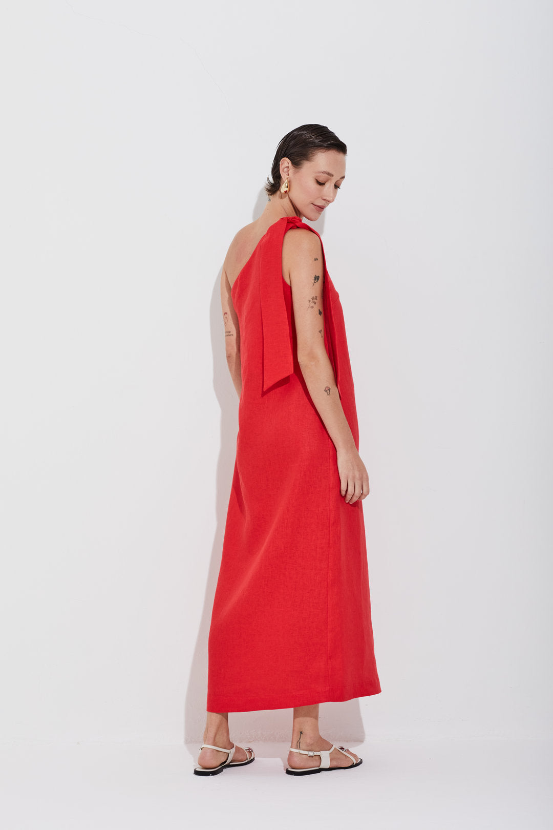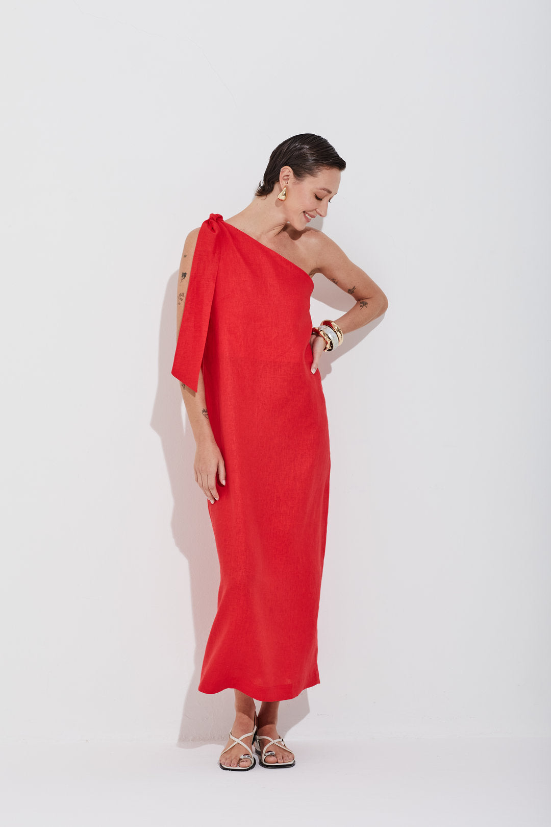 Vestido Em Linho 100% Um Ombro Só Com Faixa Tomate