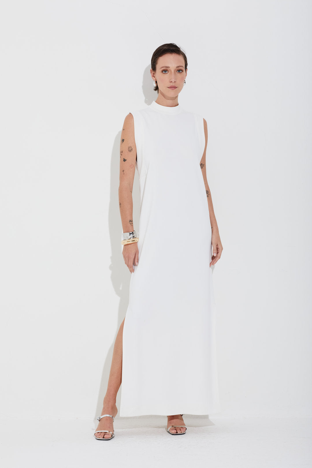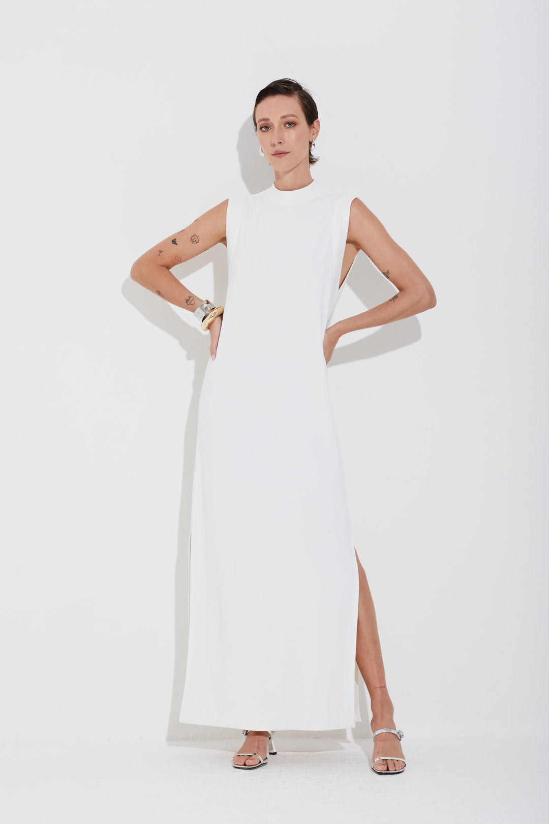 Vestido longo em malha jersey opaque, com pespontos delicados na gola e nas cavas. O fechamento por botões na gola facilita o vestir, enquanto a modelagem reta oferece conforto e versatilidade. As fendas laterais garantem movimento e fluidez, trazendo um toque de leveza para o visual.