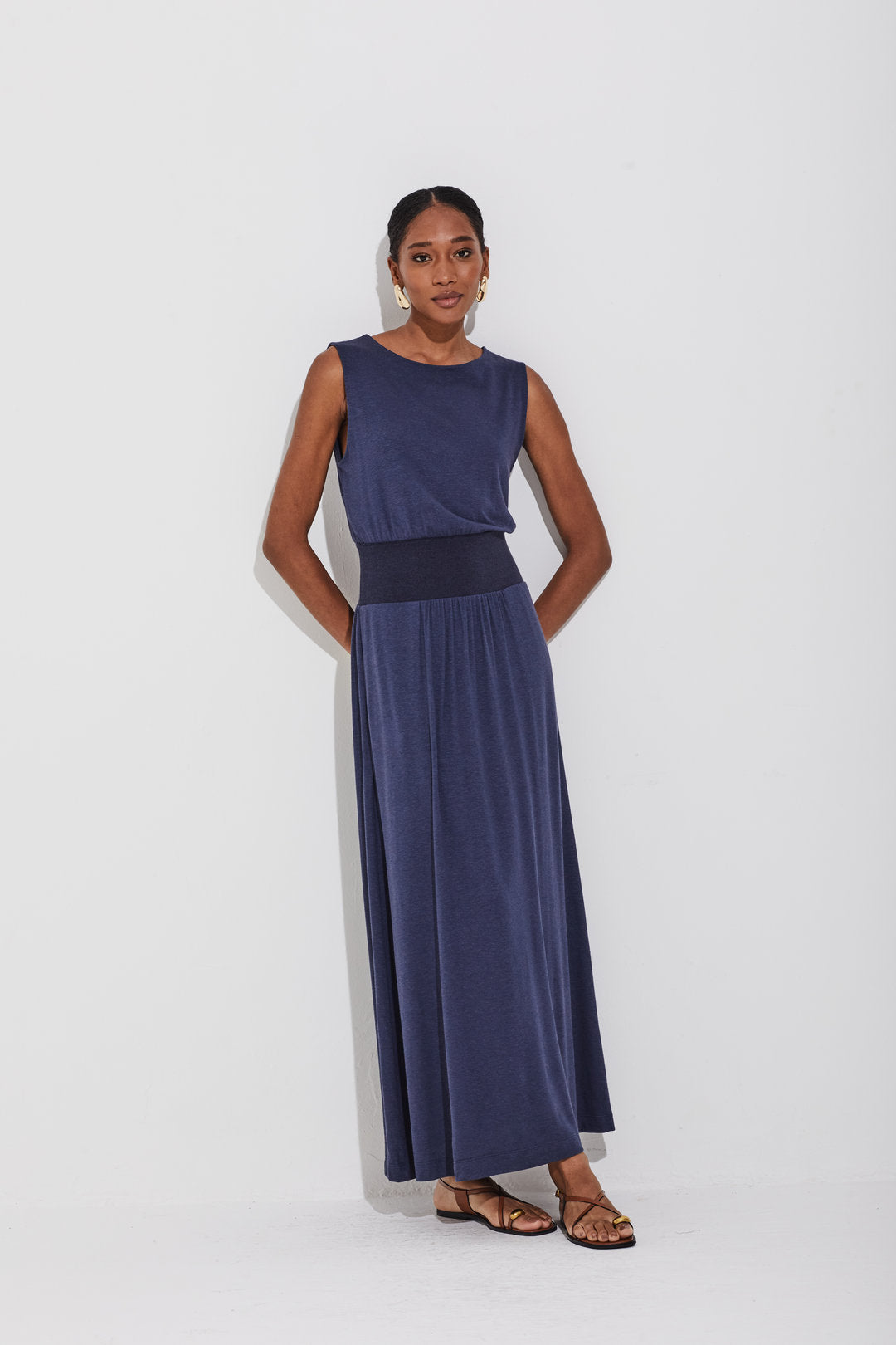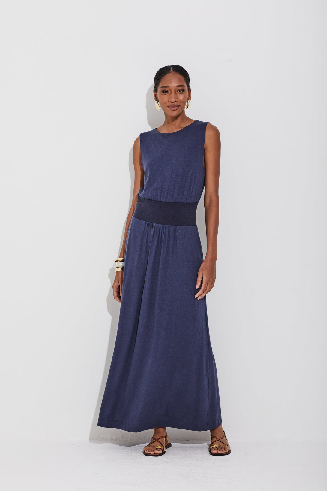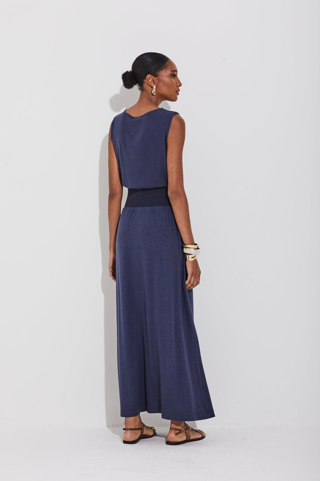 Vestido Em Malha Sem Mangas Com Pala De Tricot Navy Classico