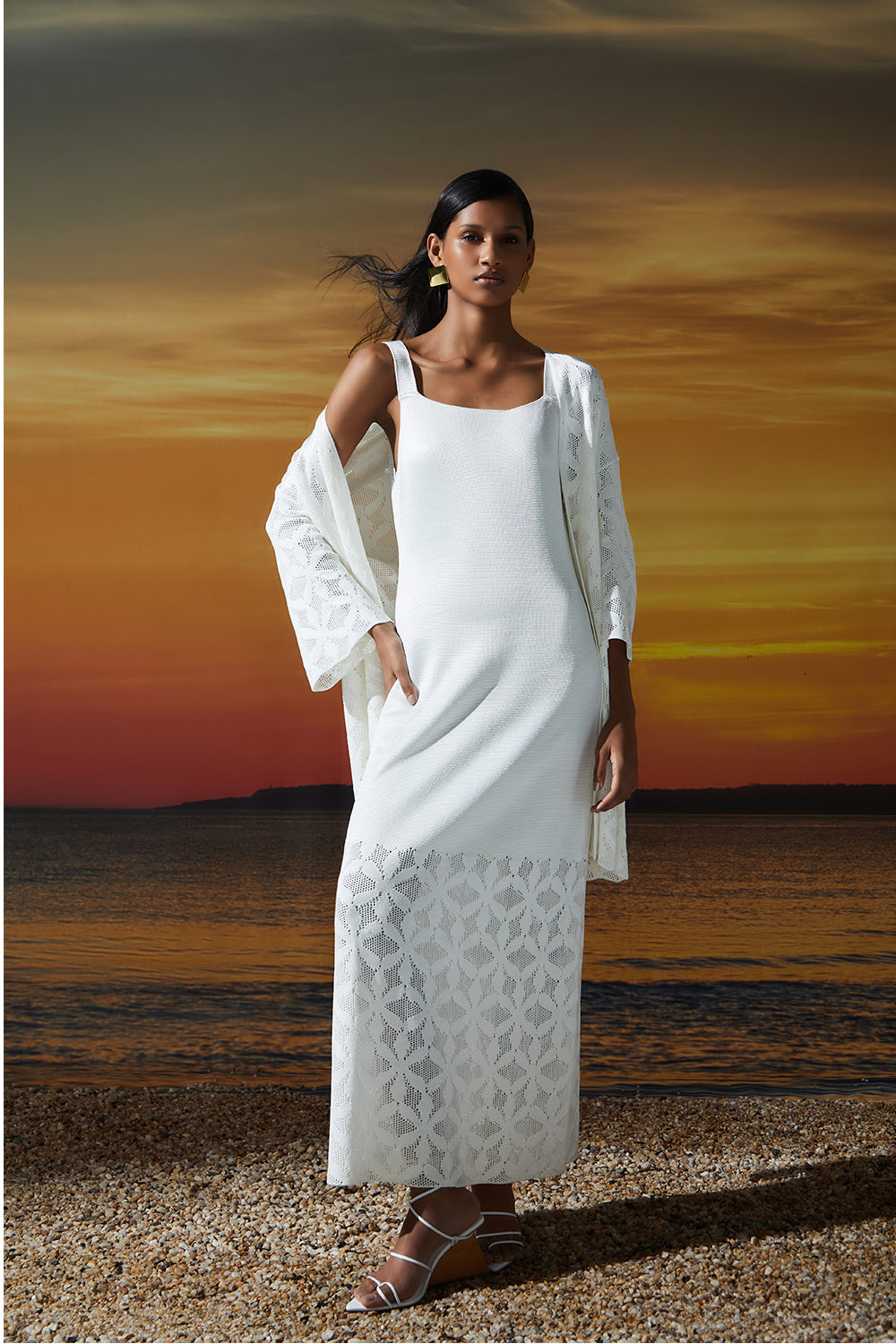 Este vestido de tricot é perfeito para festas e compromissos importantes. Seu design elegante e sofisticado possui alças largas, decote quadrado e uma silhueta longa que é bela e versátil. Traga sofisticação e elegância a todas as suas ocasiões com os desenhos em jacquard com vazados estrategicamente localizados, inspirados nos cobogós da arquitetura sessentista em um tricot com estrutura e brilho sutil!
