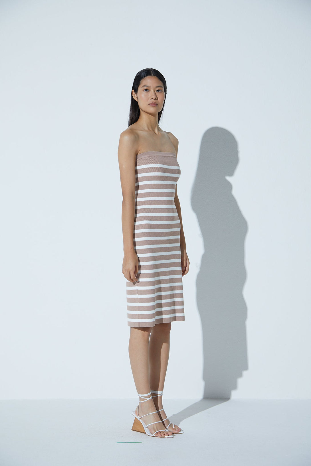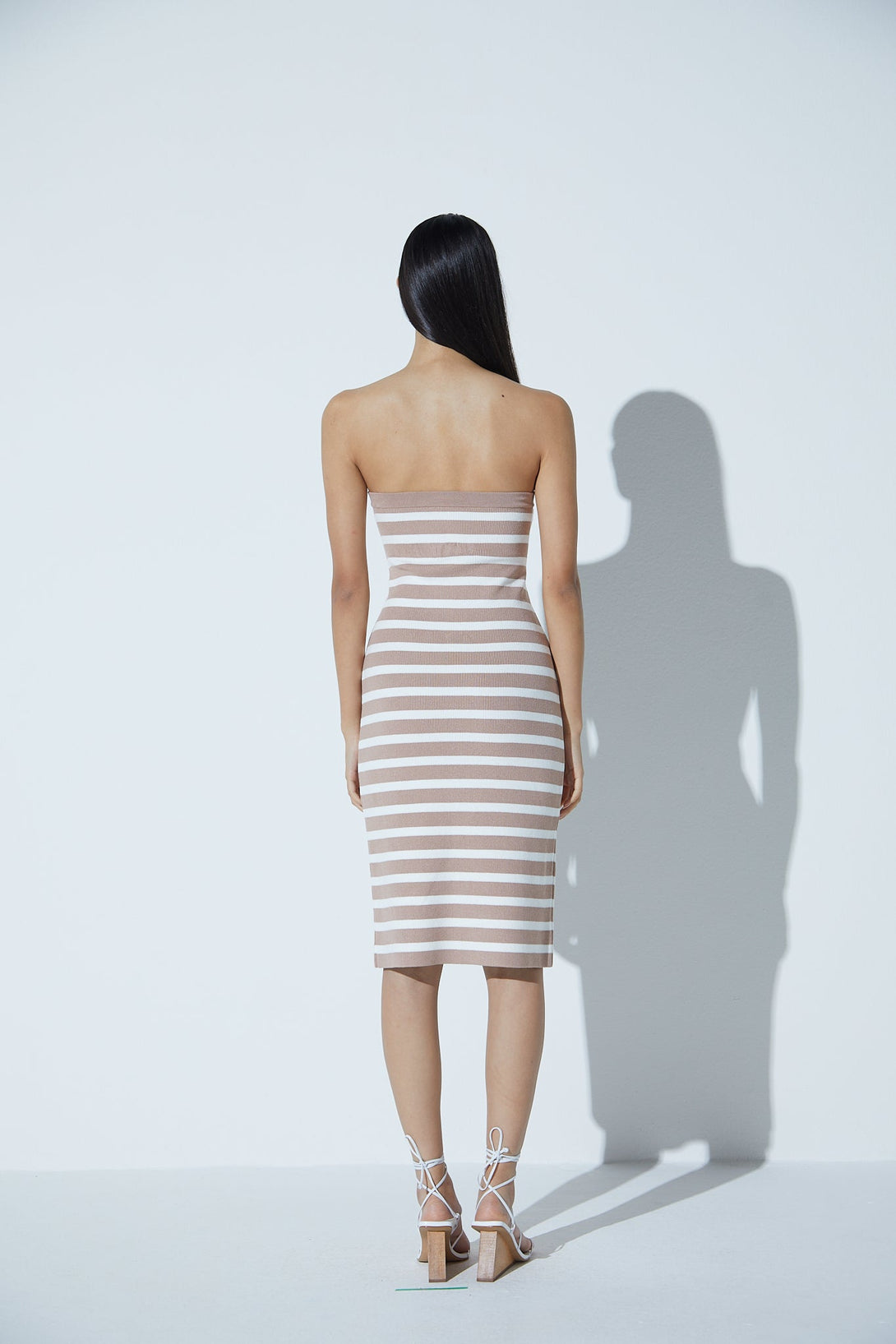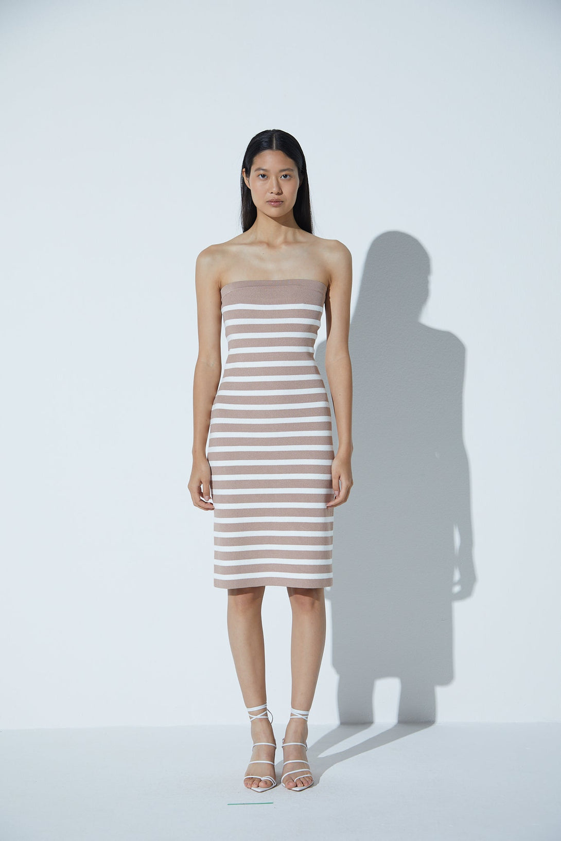 Este vestido tubinho de tricot, com listras horizontais, se encaixa perfeitamente ao corpo para um visual moderno e elegante. O decote tomara-que-caia adiciona charme ao look enquanto o comprimento abaixo dos joelhos remente um look clássico.