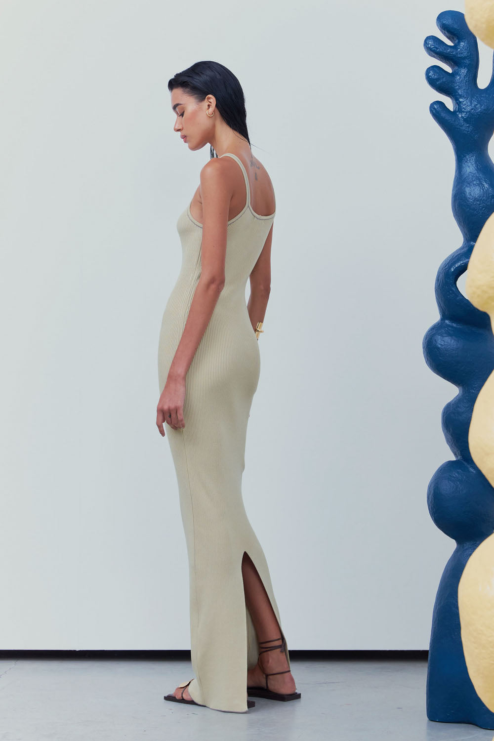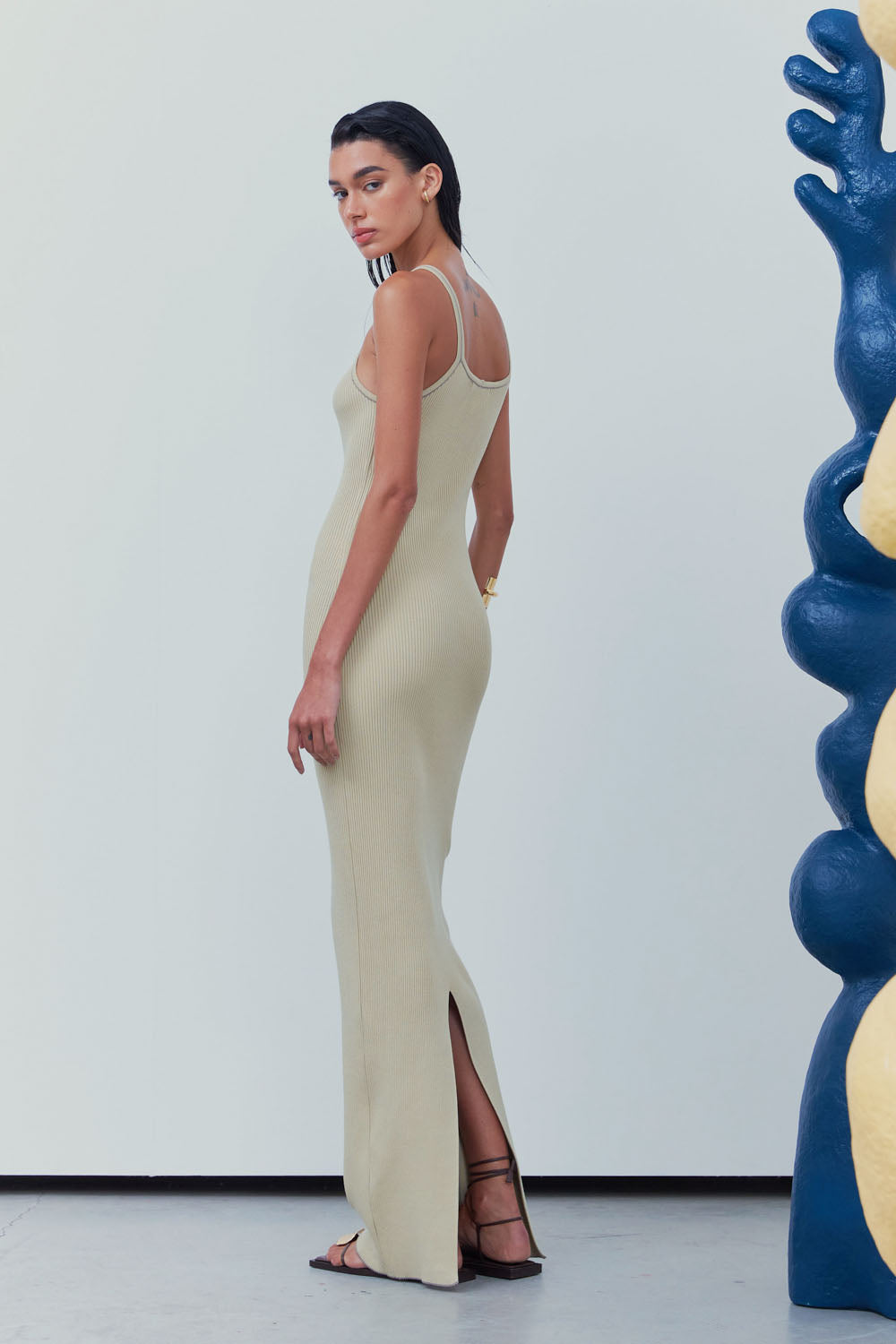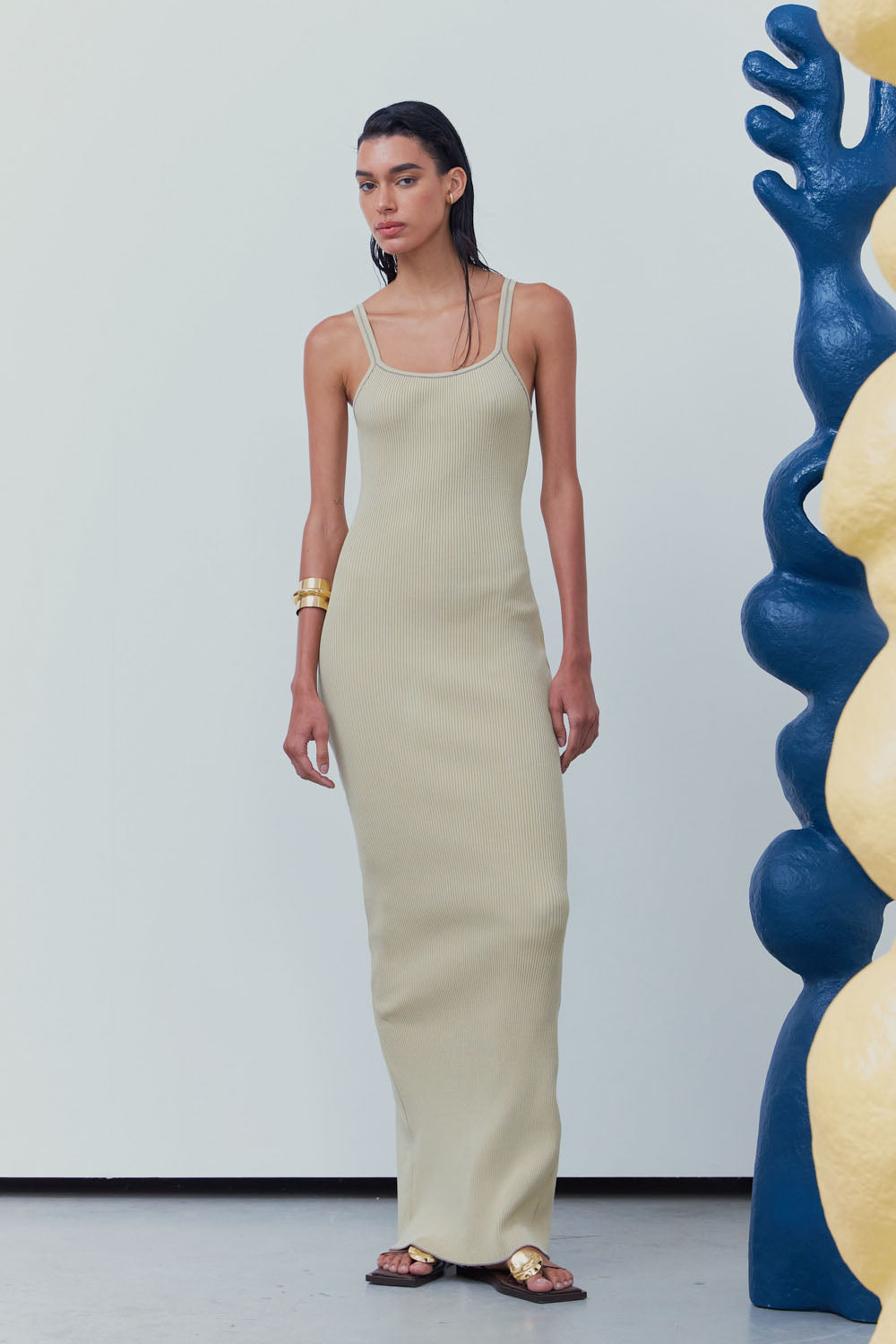 Produzido em um tricot canelado fino e delicado, o Vestido Longo em Tricot apresenta acabamentos com linhas em cores de contraste, alças finas e ajuste próximo ao corpo.