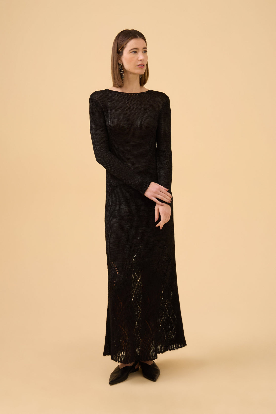 Vestido Longo Manga Longa Mix De Fios Em Tricot Preto