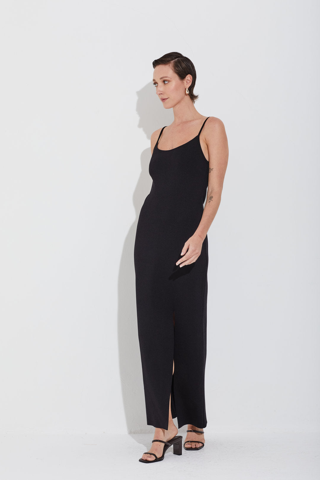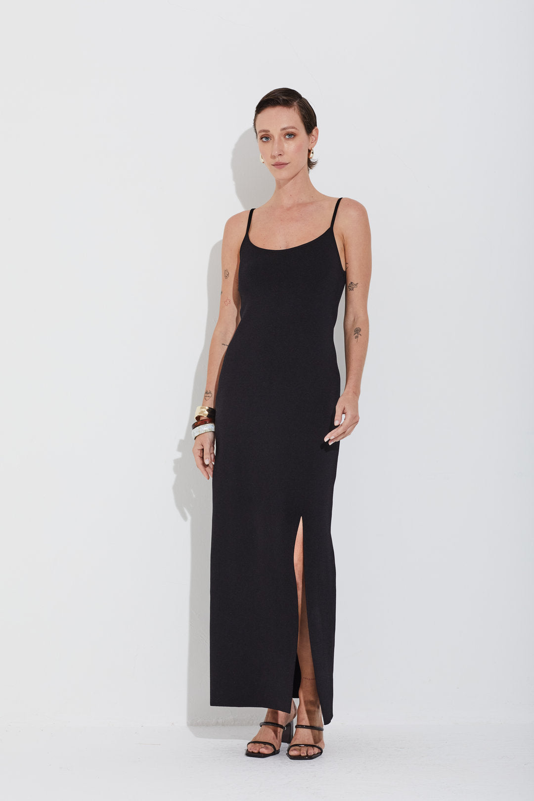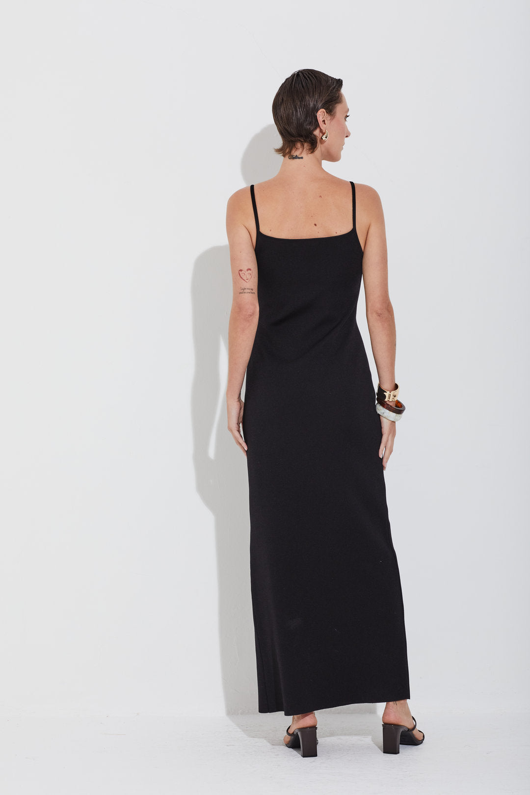 Vestido longuete em tricot encorpado com elastano, com alças finas e leve brilho acetinado. A modelagem ajustada ao corpo valoriza a silhueta, enquanto a fenda frontal do lado esquerdo traz movimento e um toque de ousadia na medida certa. Uma peça feminina e marcante, ideal para ocasiões que pedem presença.