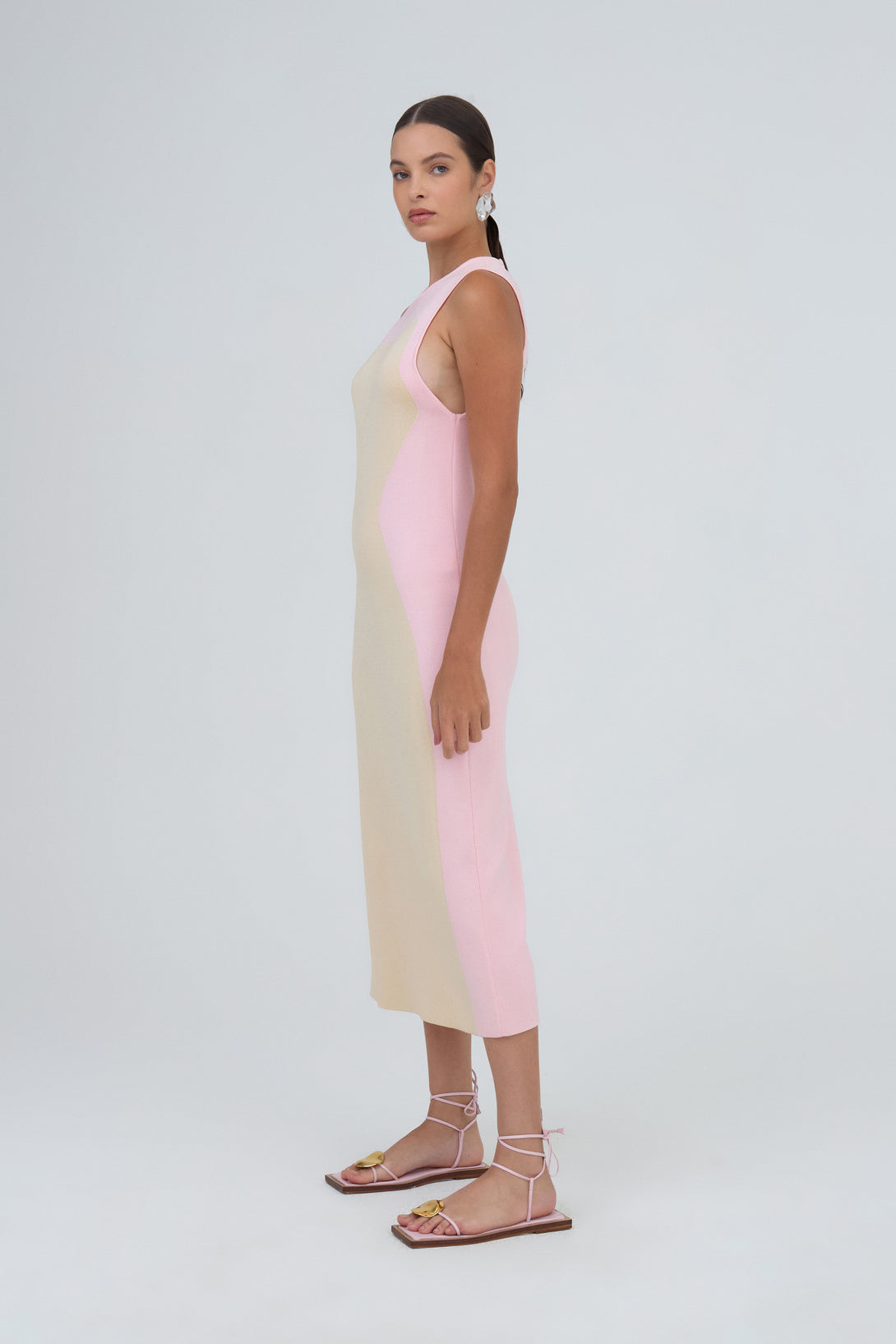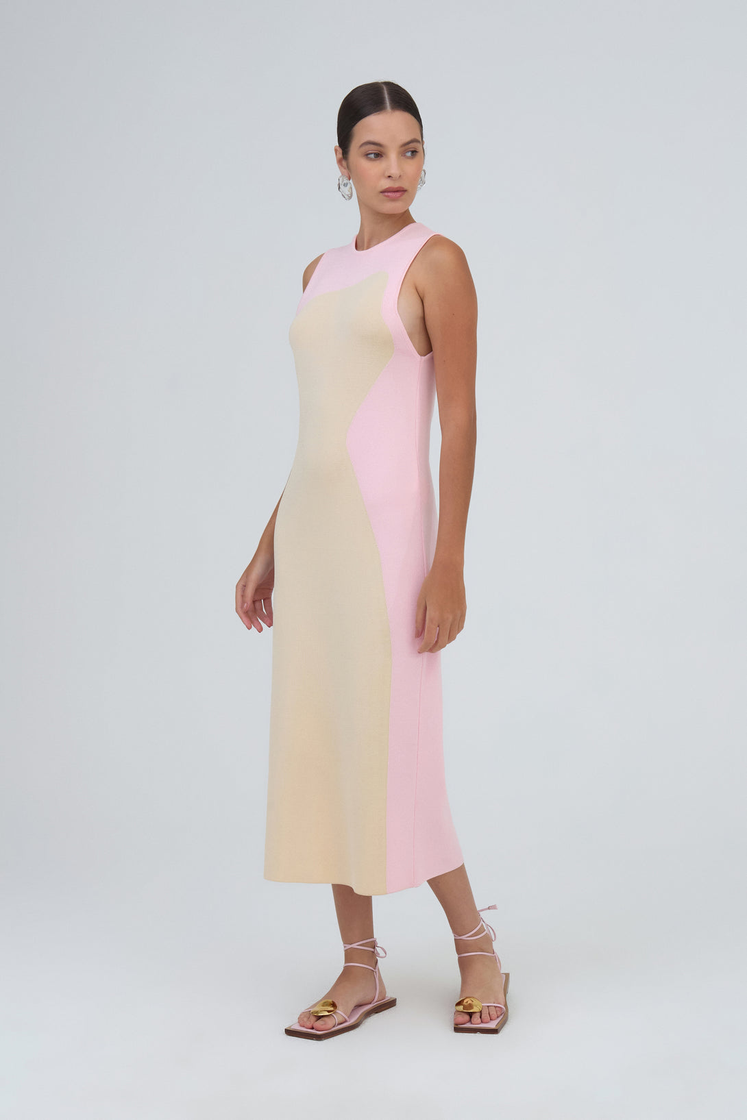Vestido Midi Bicolor Formas Orgânicas Em Tricot Rosa Nude