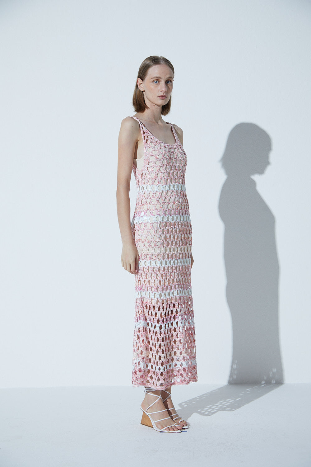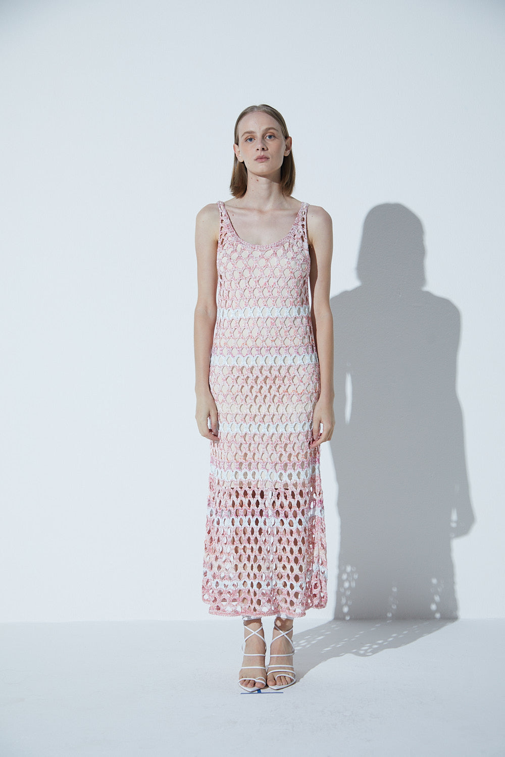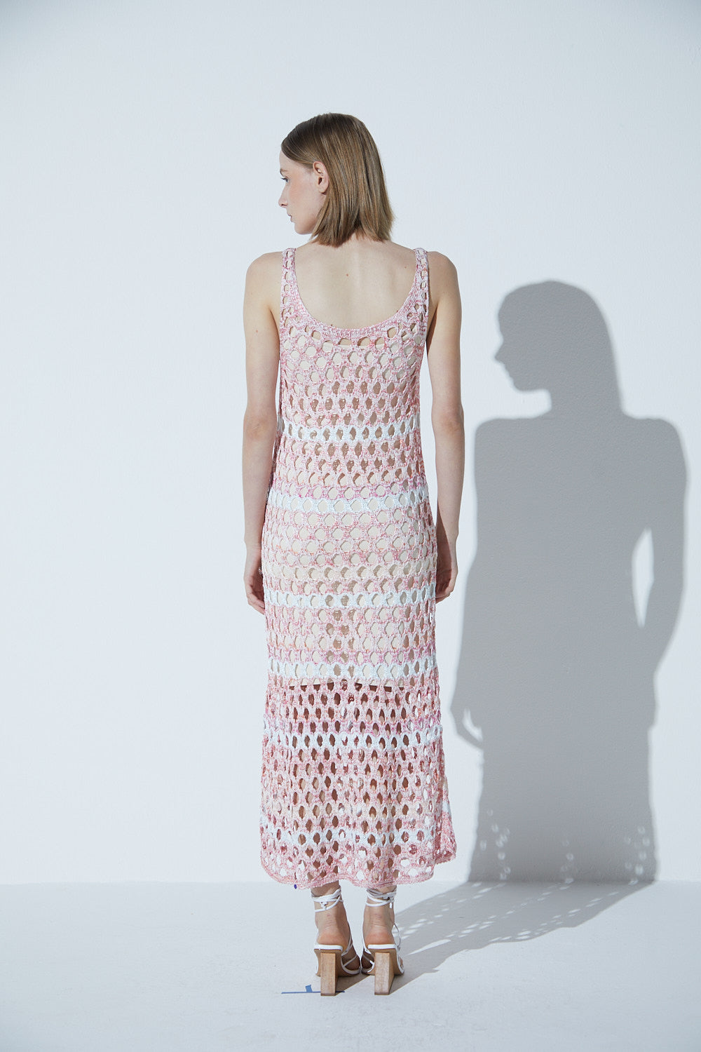 Vestido Midi Em Tricot Telado Multicolor Pink