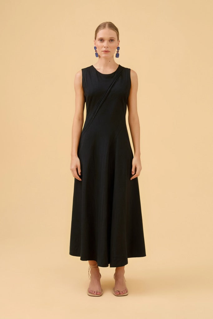 Vestido Mídi Evasê Detalhe Recortes Em Malha Preto